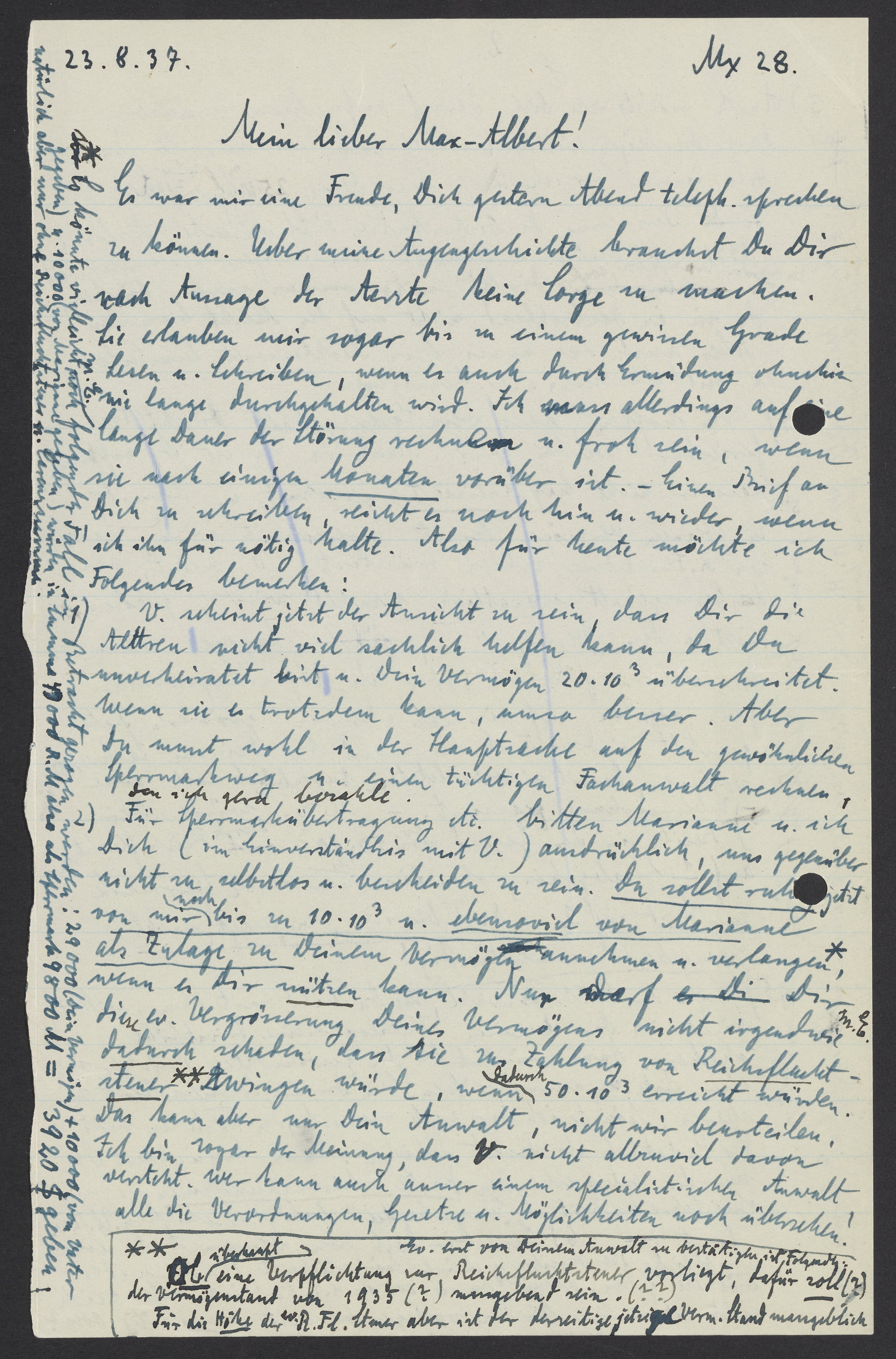 2) Marianne and I (in agreement with Viktor) expressly ask you not to be too selfless and modest towards us regarding the transfer of blocked marks. You should now accept and demand* from me up to 10.10 (3) and just as much from Marianne as an addition to your assets, especially if it can be of any use to you. However, this possible increase in your assets must not harm you in any way, in my opinion, by forcing you to pay Reich flight tax**, especially if this would result in 50.10 (3). Only your lawyer can assess that, not us. I even think that Viktor doesn’t understand too much about it. Apart from a specialist lawyer, who can still review all the regulations, laws, and possibilities?
