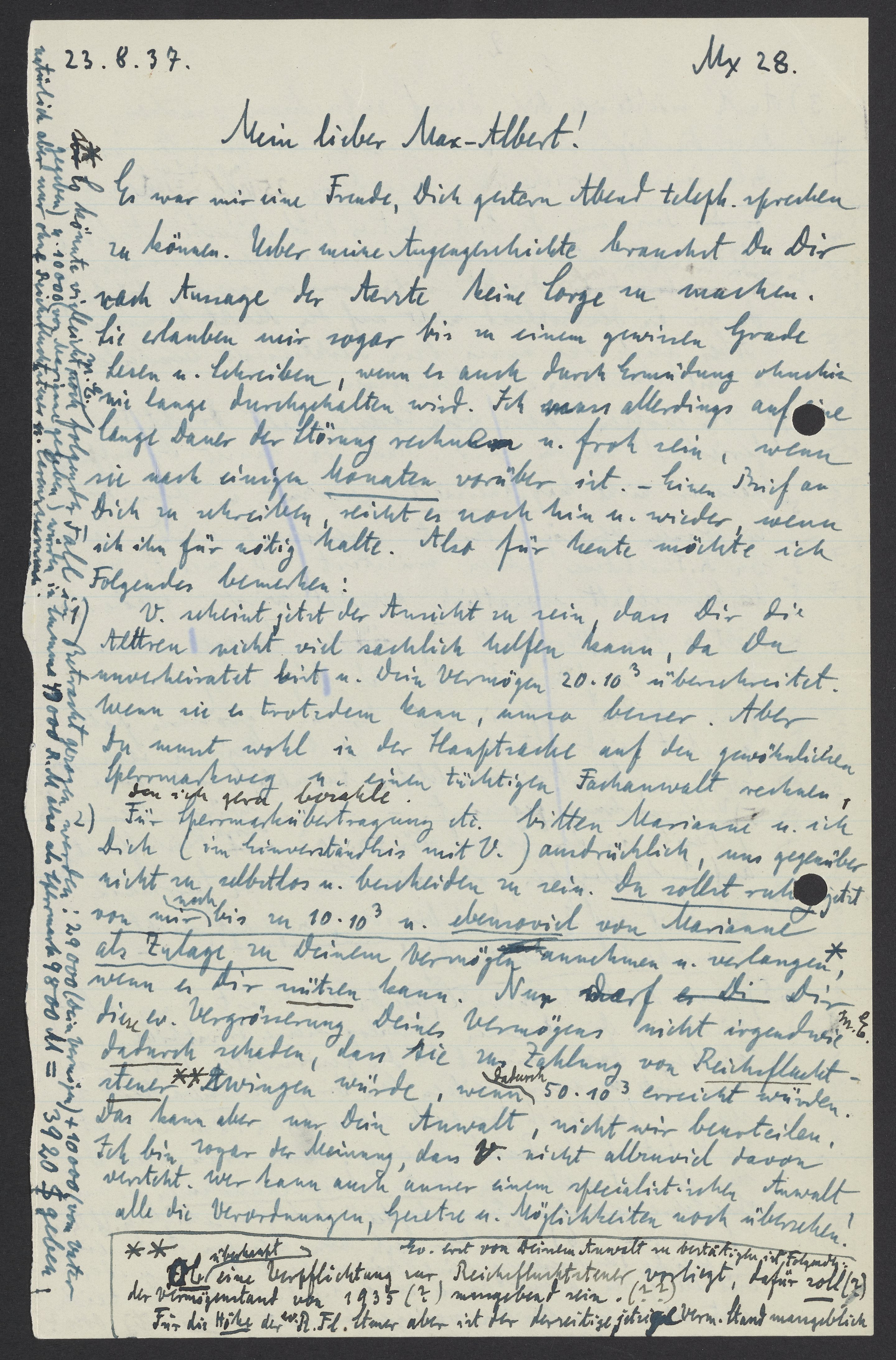 2) Für Sperrmarkübertragung etc bitten Marianne u. ich Dich (im Einverständnis mit V.) ausdrücklich uns gegenüber nicht zu selbstlos u. bescheiden zu sein. Du sollst ruhig jetzt von mir noch bis zu 10.10 (3) u. ebensoviel von Marianne als Zulage zu Deinem Vermögen annehmen u. verlangen* wenn es Dir nützen kann. Nur darf Dir diese ev. Vergrösserung Deines Vermögens nicht irgendwie m.E. dadurch schaden, dass sie zu Zahlung von Reichsfluchtsteuer** zwingen würde, wenn dadurch 50.10 (3) erreicht würden. Das kann aber nur Dein Anwalt, nicht wir beurteilen. Ich bin sogar der Meinung, dass V. nicht allzuviel davon verstehet. Wer kann auch ausser einem spezialistischen Anwalt alle die Verordnungen, Gesetze u. Möglichkeiten noch übersehen?