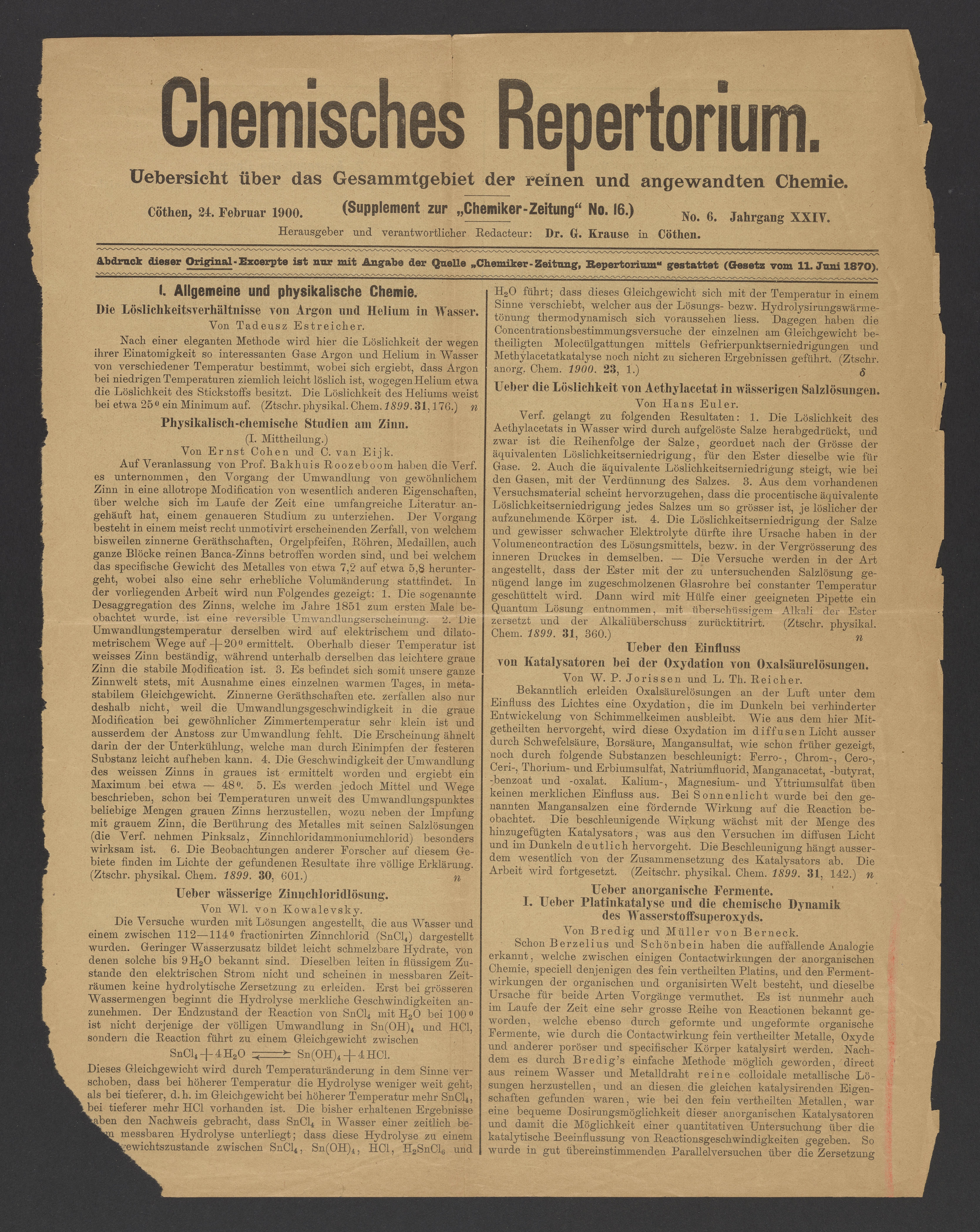 “Chemisches Repertorium: Uebersicht Über Das Gesamtgebiet Der Reinen Und Angewandten Chemie,” February 24, 1900. Papers of Georg and Max Bredig, Box 5, Folder 6. Science History Institute. Philadelphia. https://digital.sciencehistory.org/works/6p8up6a.