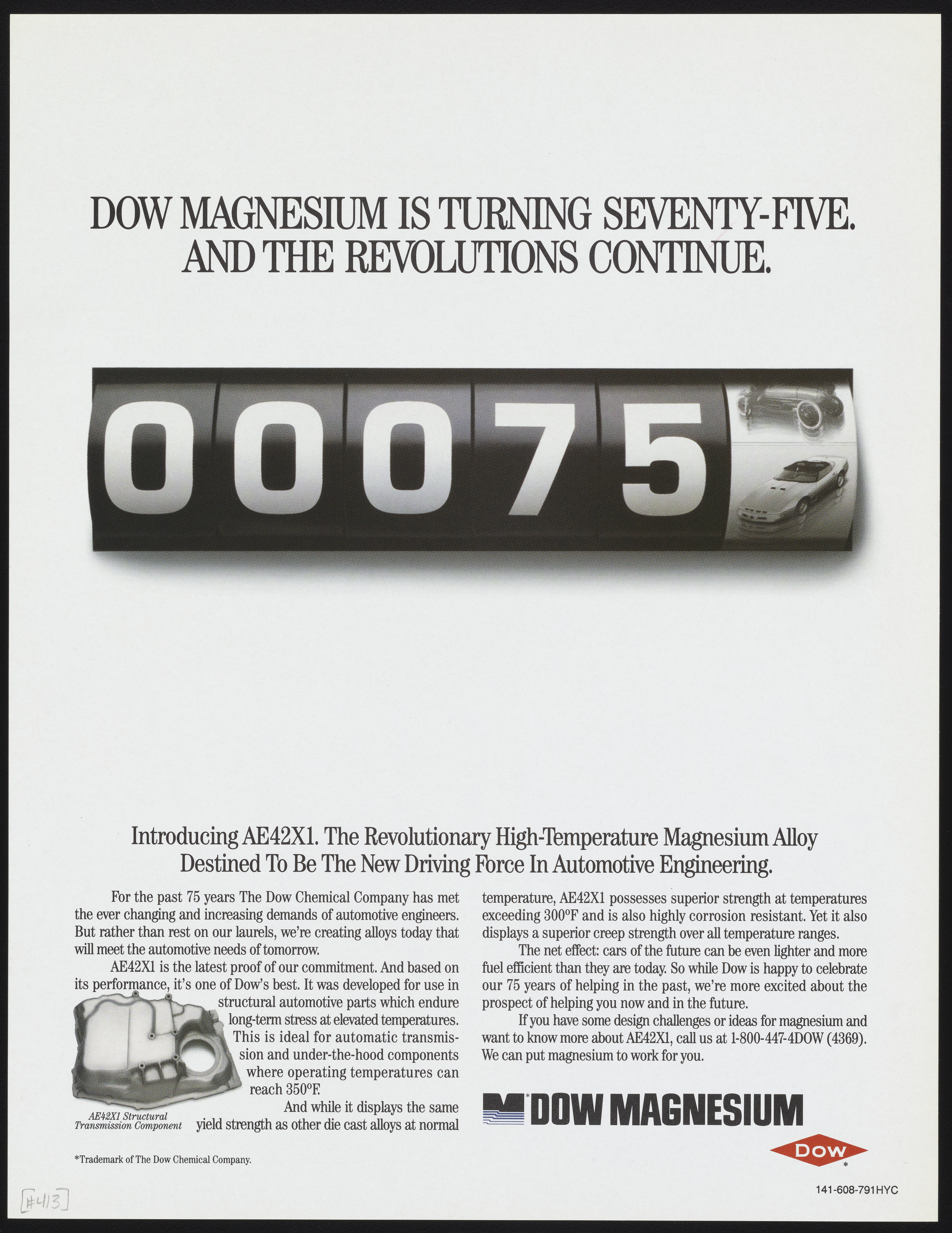 Dow Chemical Company. “Dow Magnesium Is Turning Seventy-Five. And the Revolutions Continue.,” circa 1991. Advertisements from the Dow Chemical Historical Collection, Box 8. Science History Institute. Philadelphia. https://digital.sciencehistory.org/works/6q182m21p.