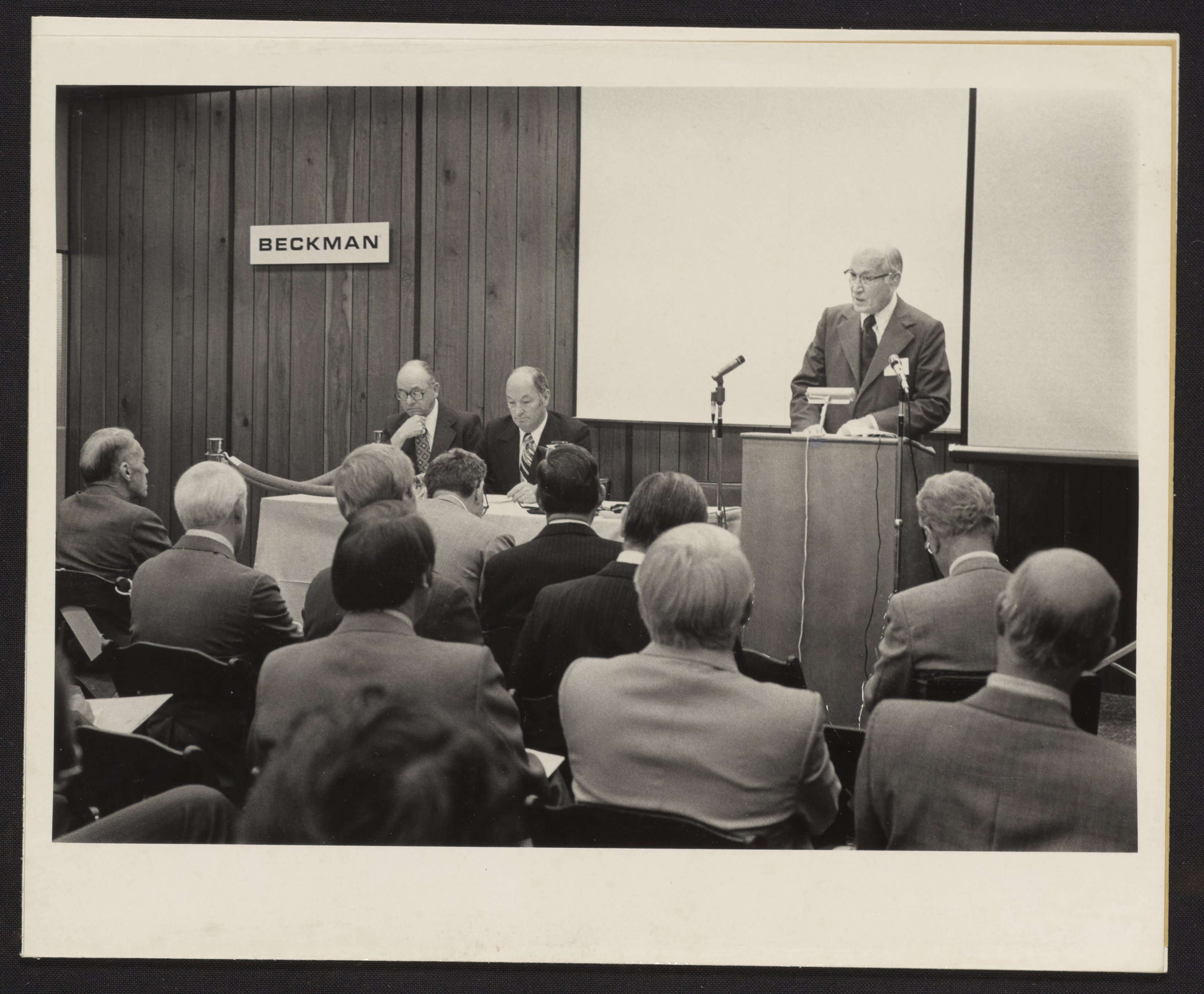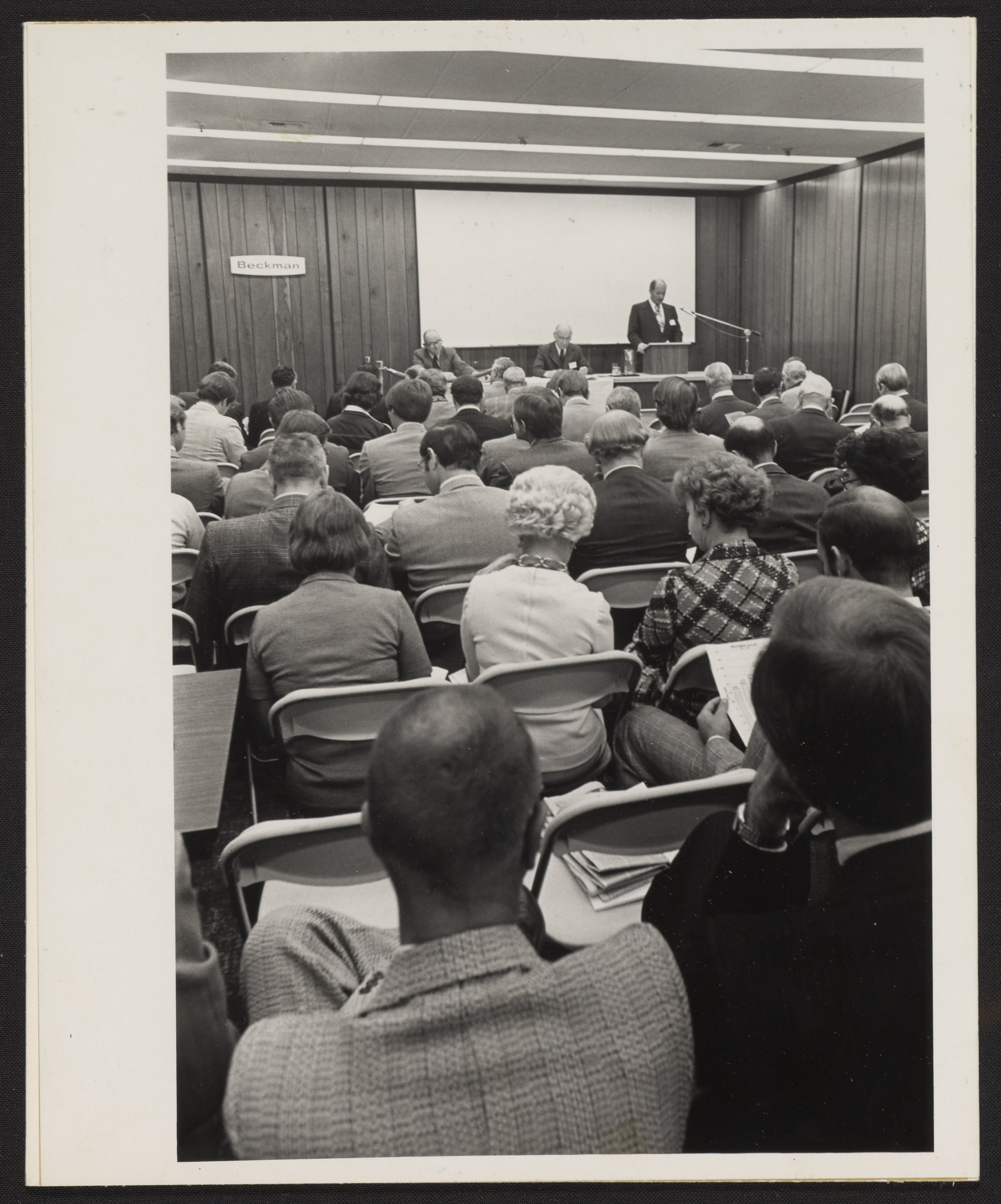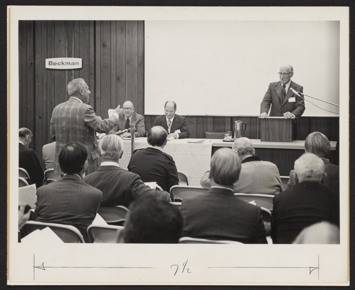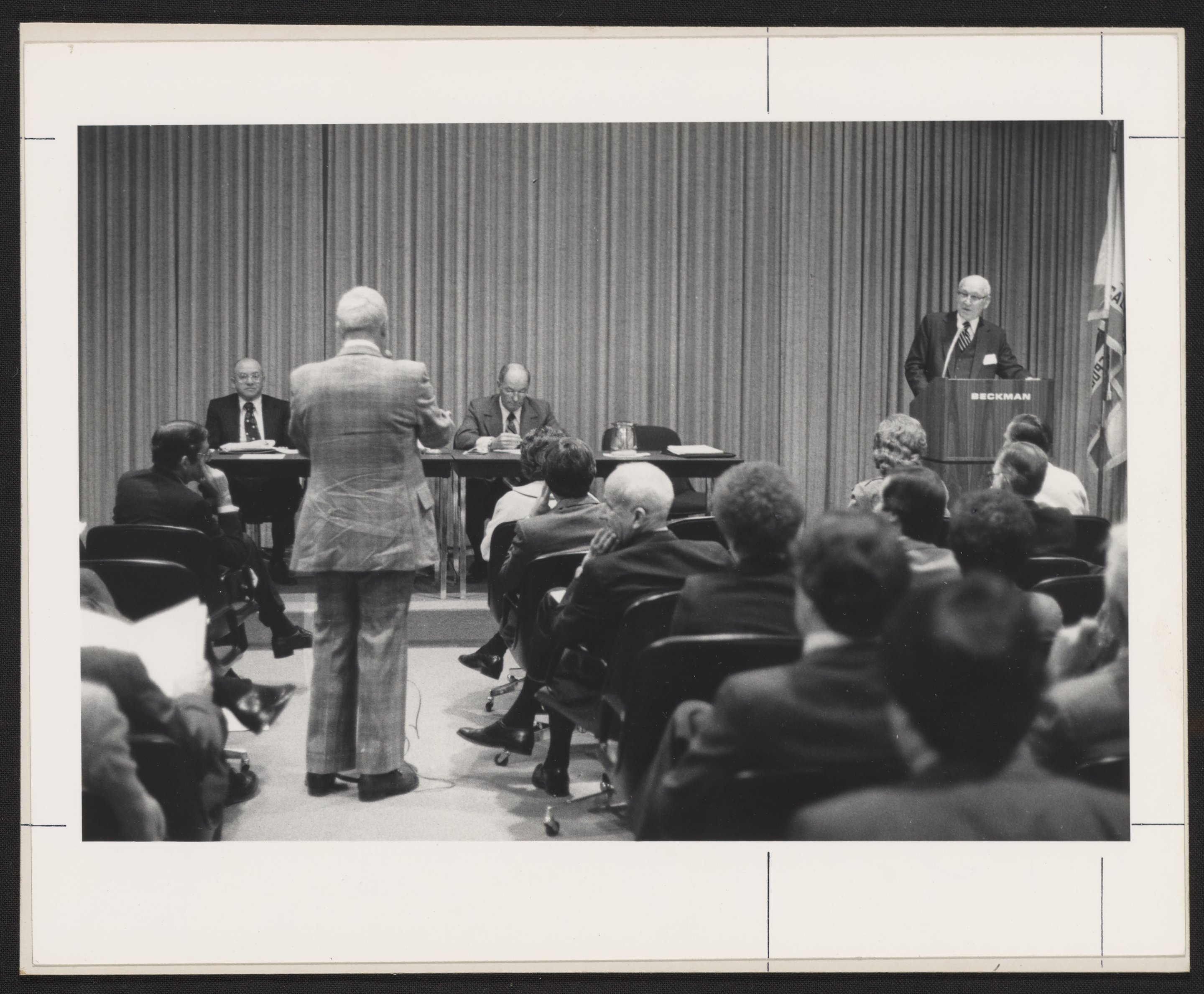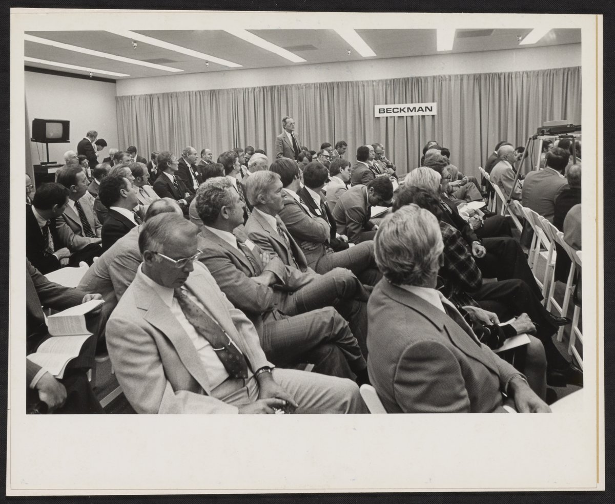 “Beckman Instruments Shareholders Meeting,” circa 1975. Beckman Historical Collection, Box 55, Folder 138. Science History Institute. Philadelphia. https://digital.sciencehistory.org/works/6t053g30p.