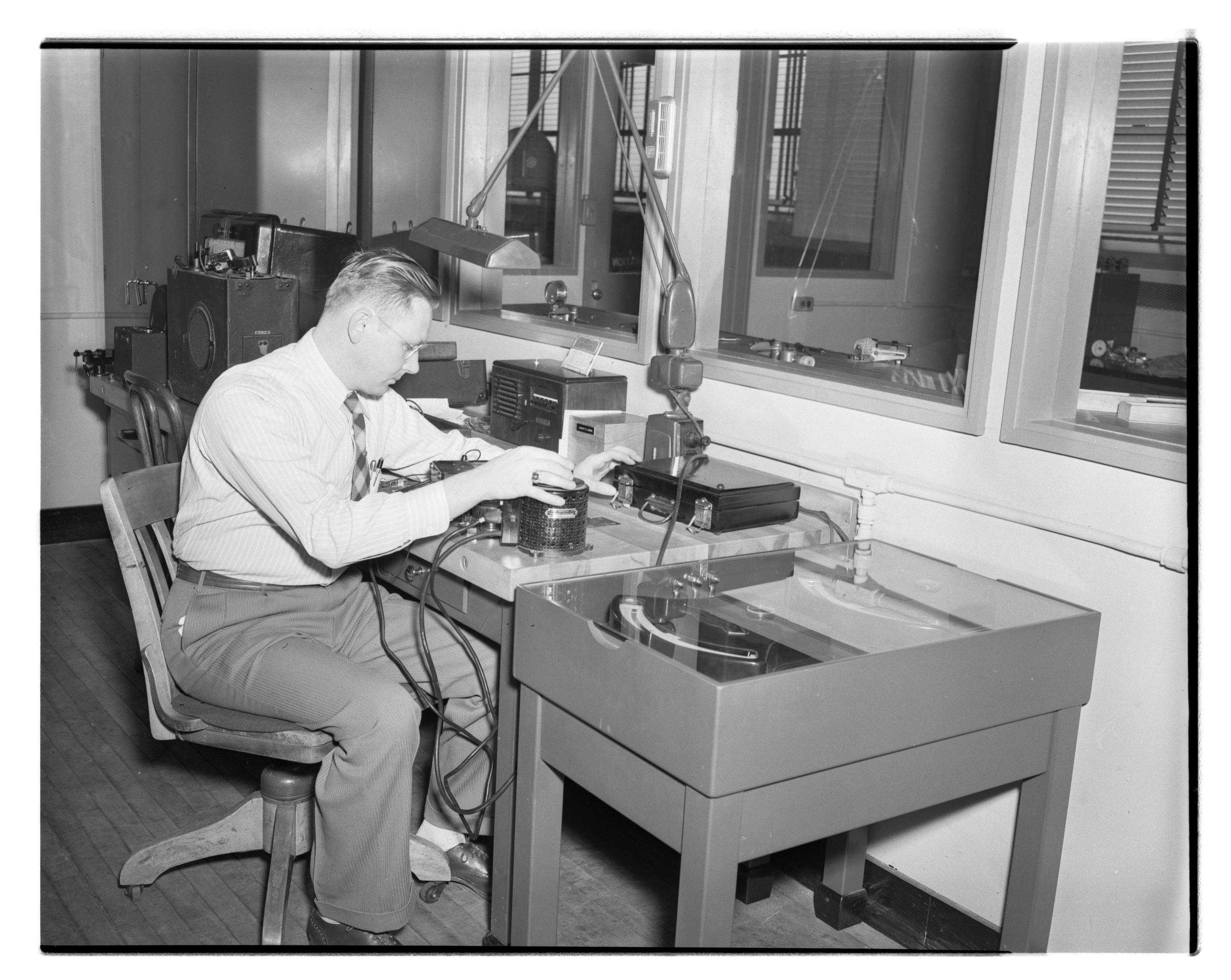 General view of Instrument calibrationist August Aaron checking the calibration of a voltmeter in the Dow Chemical Company's Instrument Department. Established in 1926, the Instrument Department was responsible for the installation and maintenance of the assorted apparatus necessary to manage the plant's production facilities and processes. The department notably maintained accurate standards for temperatures, voltage, resistance, flow and pressures against which the plant's instruments were regularly calibrated and checked for accuracy.