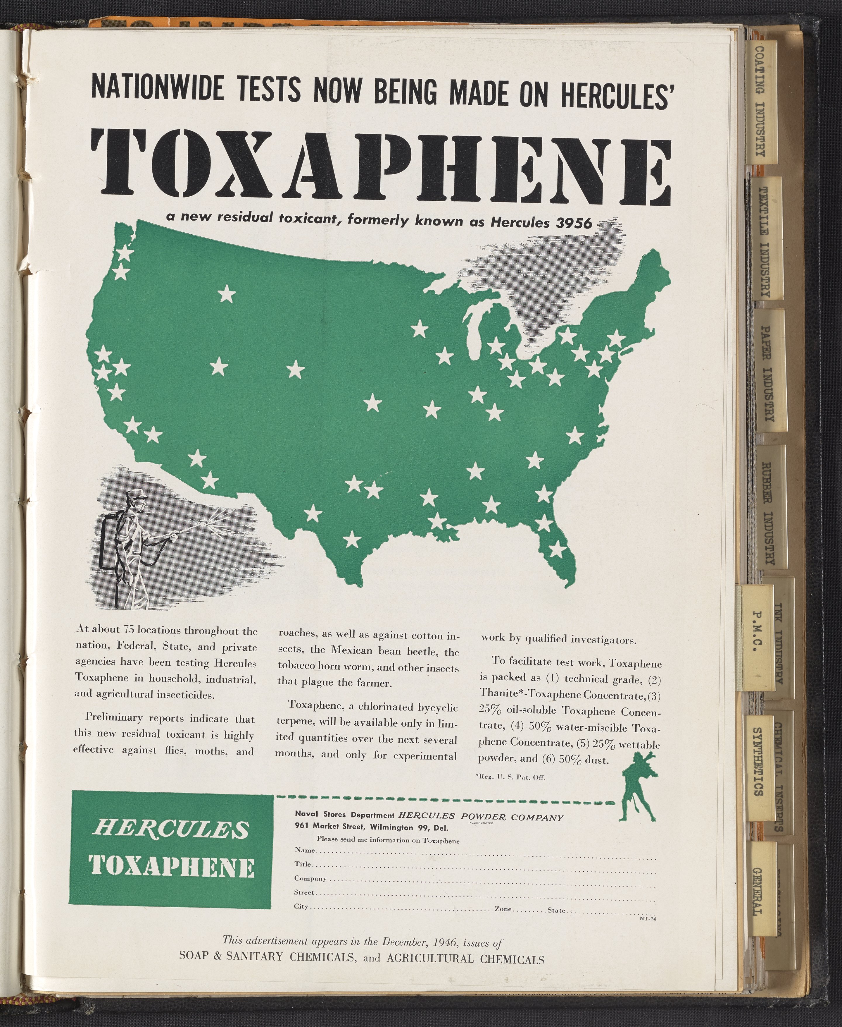 Hercules Incorporated. “Nationwide Tests Now Being Made on Hercules' Toxaphene.” 1946 Hercules Advertisements, 1946. Records of Hercules Incorporated, Volume 1946. Science History Institute. Philadelphia. https://digital.sciencehistory.org/works/6t053g769.