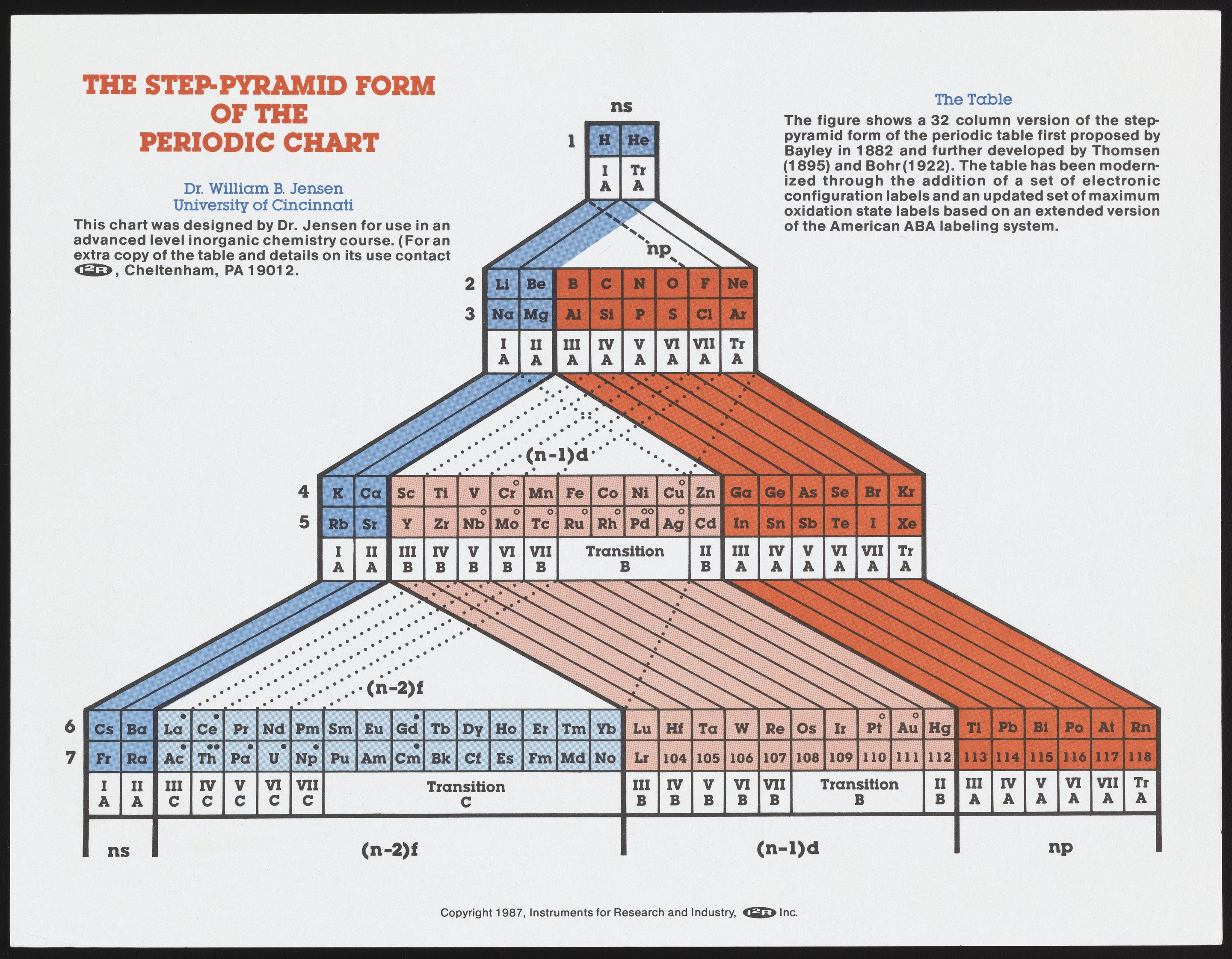 Jensen, William B. “The Step-Pyramid Form of the Periodic Chart.” Cheltenham (Township), Pennsylvania: Instruments for Research and Industry, 1987. Periodic Tables Collection, Box FC-5, Folder Periodic Tables (Assorted). Science History Institute. Philadelphia. https://digital.sciencehistory.org/works/6t053g96s.