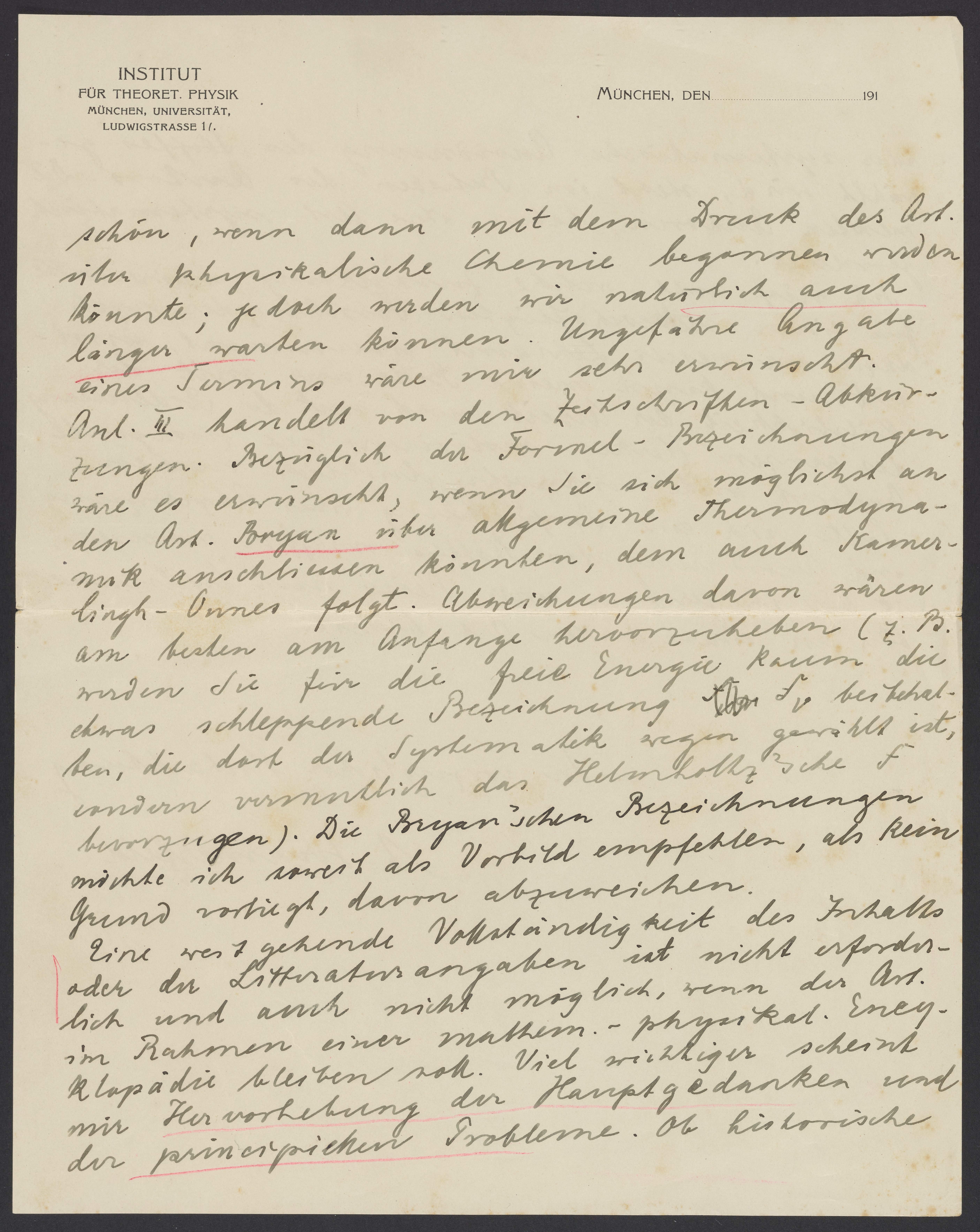 Small JPG1200 x 1508px — 281 KBLarge JPG2880 x 3620px — 1.3 MBFull-sized JPG5610 x 7052px — 4.6 MBOriginal fileTIFF — 5610 x 7052px — 113 MBArnold Sommerfeld (1868-1951), a German theoretical physicist, requests that Georg Bredig (1868-1944) write an article on physical chemistry for a forthcoming mathematical physics encyclopedia. The article was delayed by the untimely passing of its intended author, Jacobus van't Hoff (1852-1911), one of the founders of modern physical chemistry.