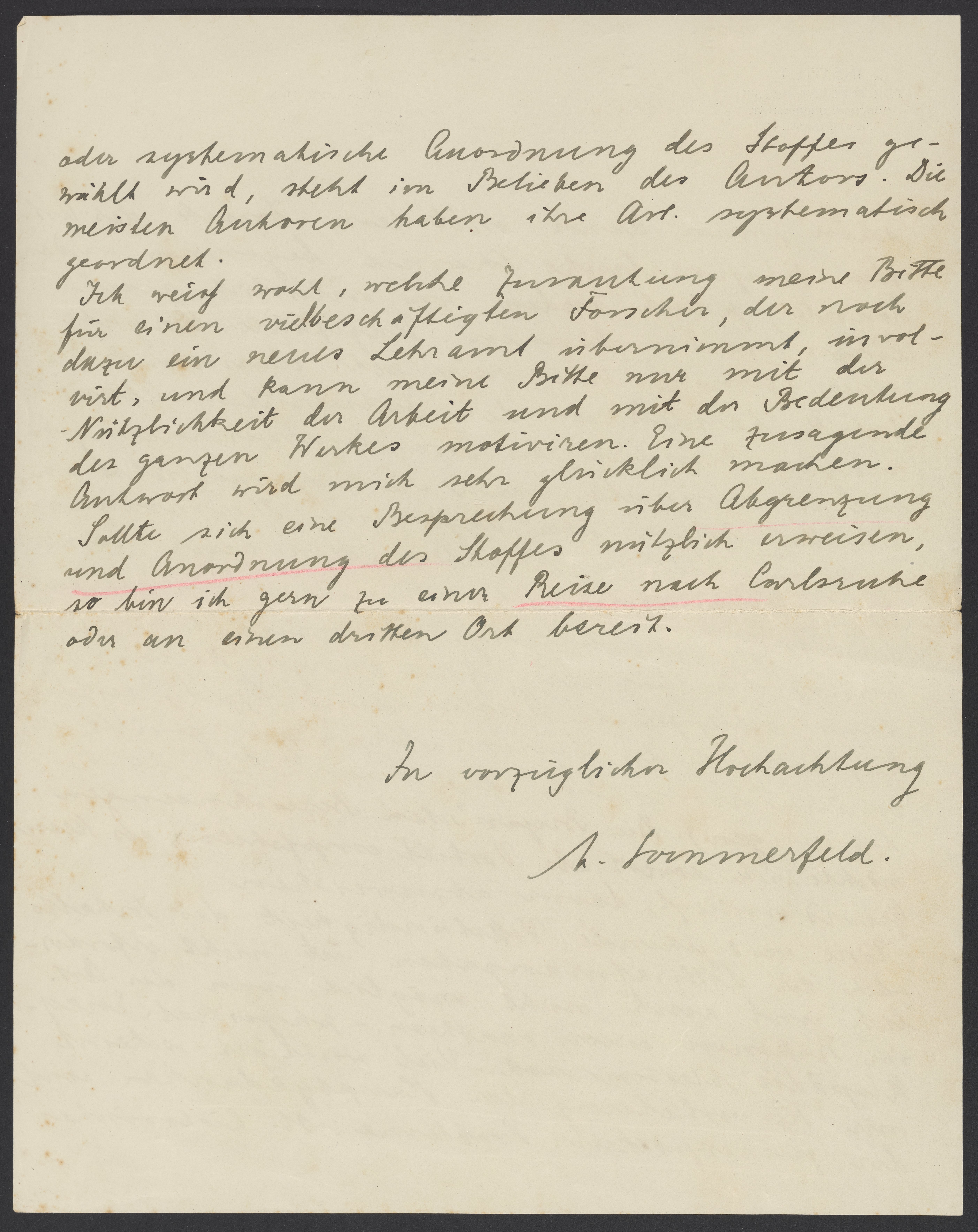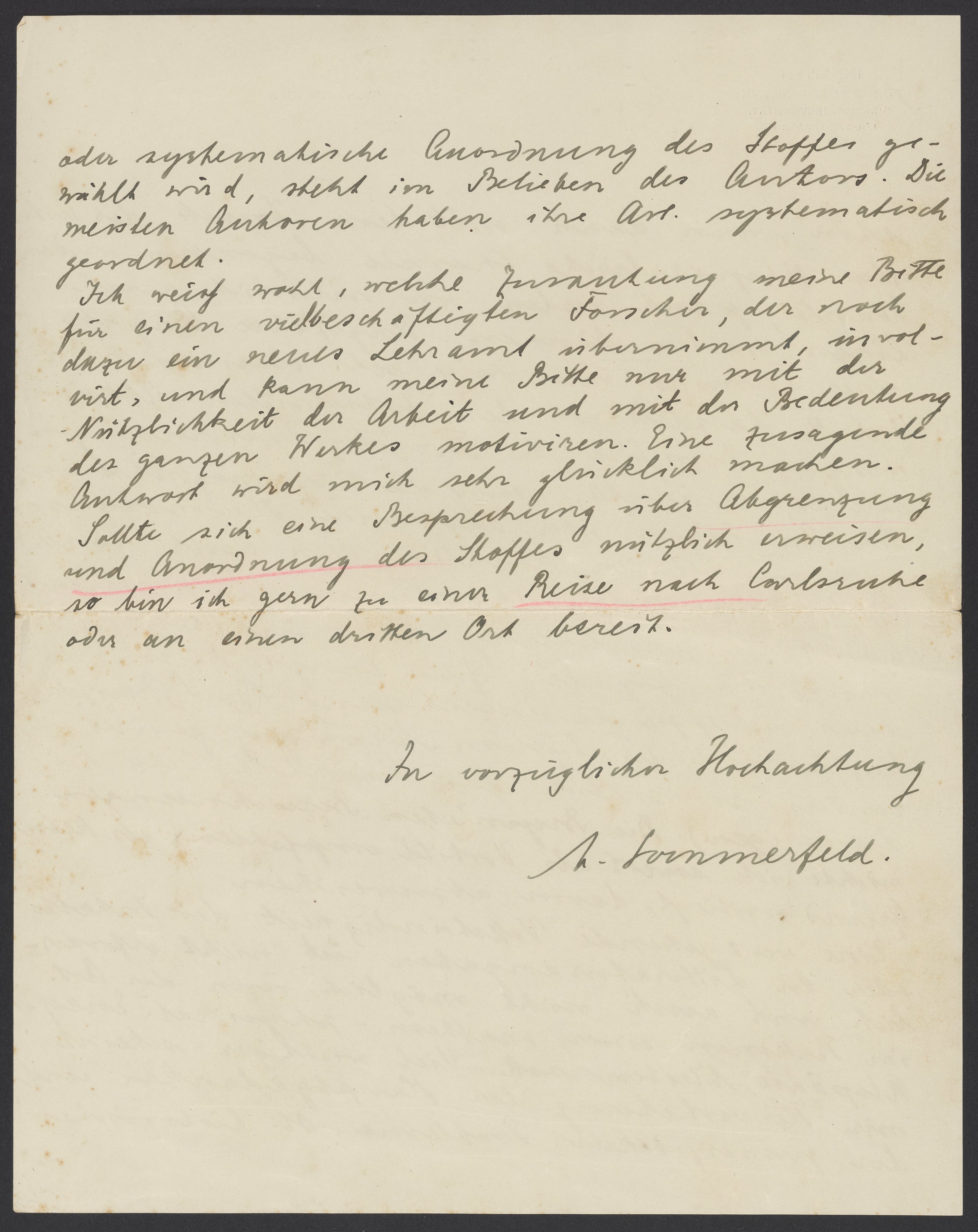 Sollte sich eine Besprechung über Abgrenzung und Anordnung des Stoffes nicht erweisen, so bin ich ganz zur einer Reise nach Carlsruhe oder an einem dritten Ort bereit.