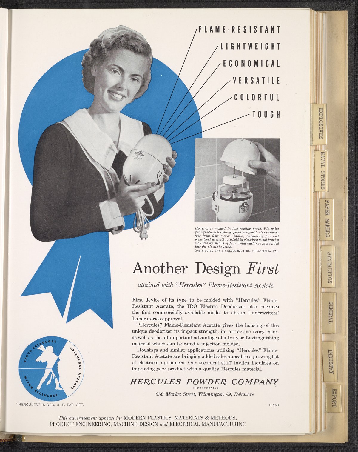 Hercules Incorporated. “Another Design First.” 1949 Hercules Advertisements, 1949. Records of Hercules Incorporated, Volume 1949. Science History Institute. Philadelphia. https://digital.sciencehistory.org/works/6v8fi0s.