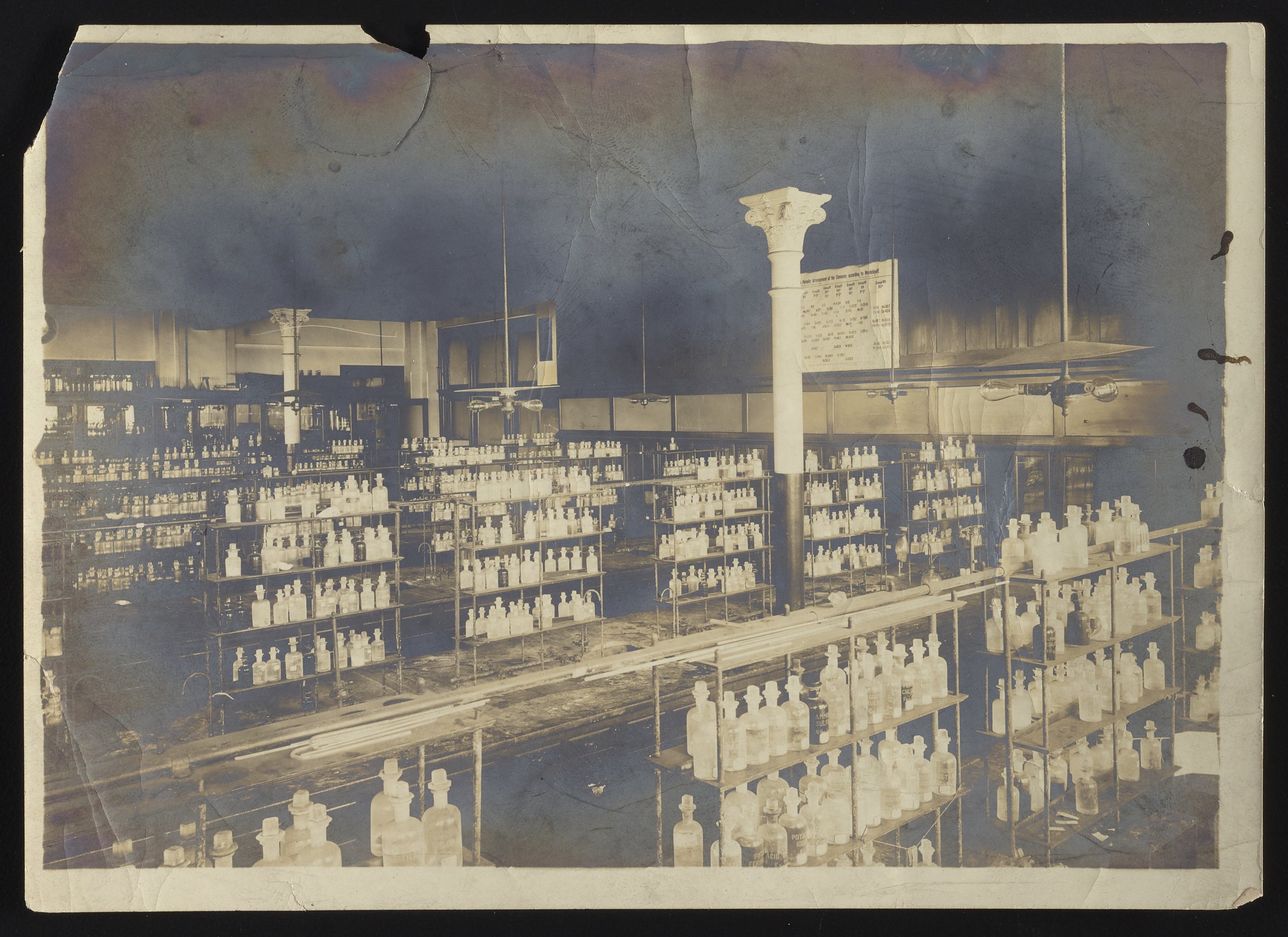 Elevated view of a laboratory, presumably the chemistry laboratory at the Drexel Institute of Art, Science, and Industry (later Drexel University), showing several rows of shelves containing assorted ingredients and raw materials. This photograph was included in a donation of materials related to Ernest Arnold Congdon (b. 1866), who held the position of professor and director of chemistry at the Drexel Institute of Art, Science and Industry from 1892-1906. Accordingly, the laboratory depicted here is attributed to the Drexel Institute based on the photograph's connection to Congdon.