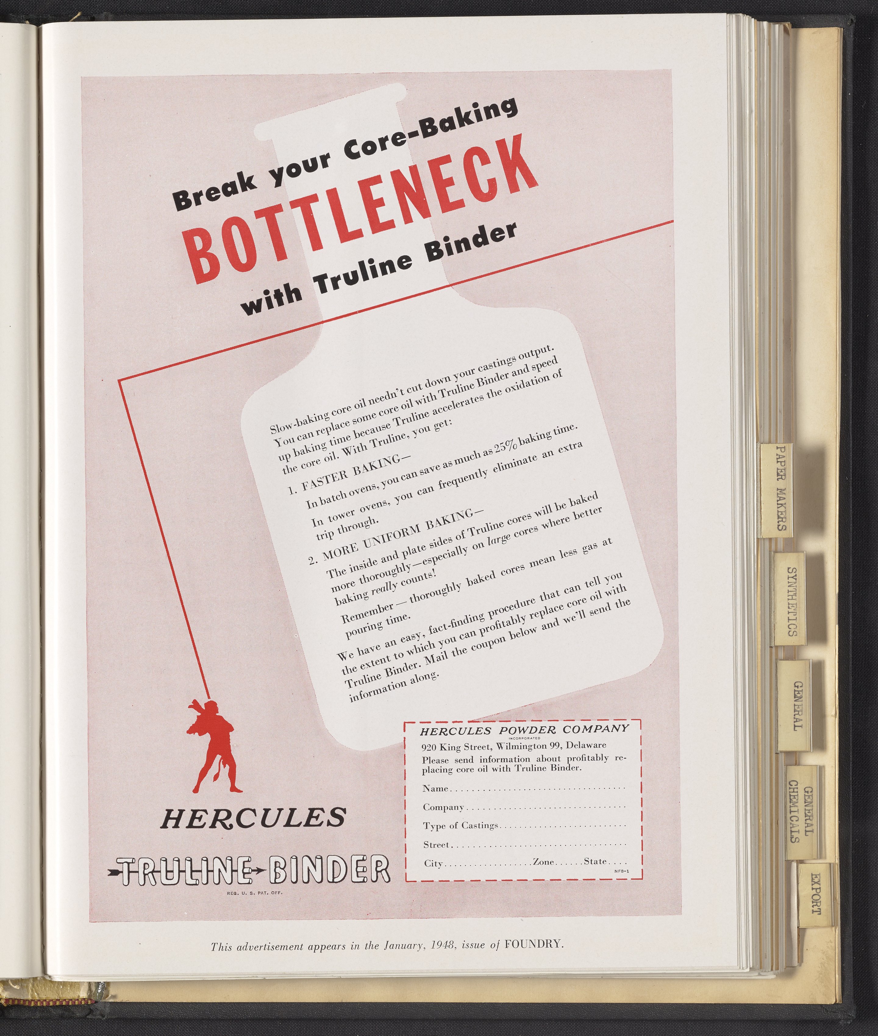 Hercules Incorporated. “Break Your Core-Baking Bottleneck with Truline Binder.” 1948 Hercules Advertisements, 1948. Records of Hercules Incorporated, Volume 1948. Science History Institute. Philadelphia. https://digital.sciencehistory.org/works/6w924c714.