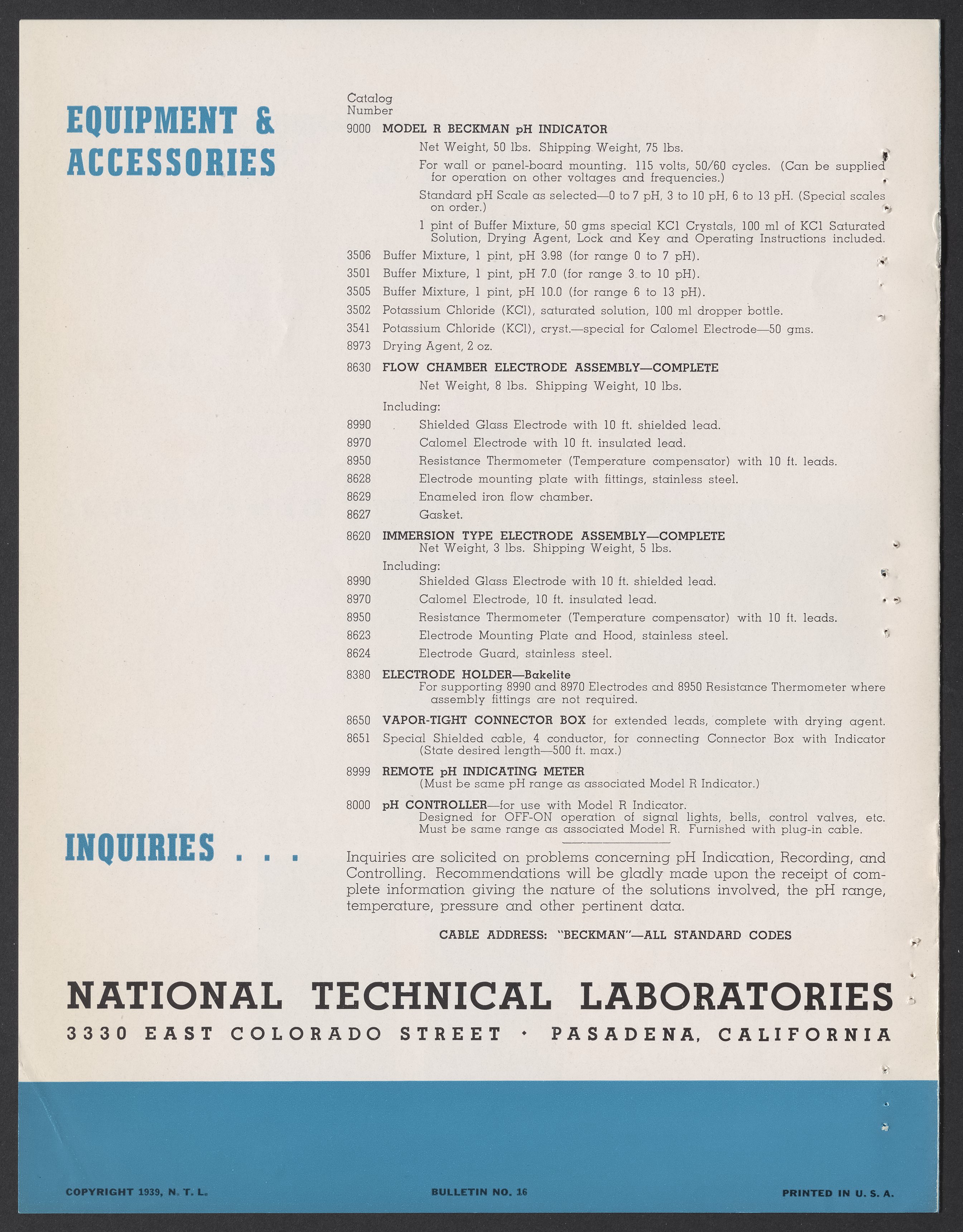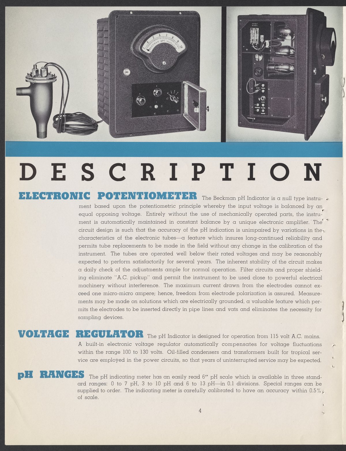 Beckman Instruments, Inc. “The Beckman PH Indicator for Continuous Measurement of PH with the Glass Electrode,” 1939. Beckman Historical Collection, Box 20, Folder 2. Science History Institute. Philadelphia. https://digital.sciencehistory.org/works/6w924c74z.