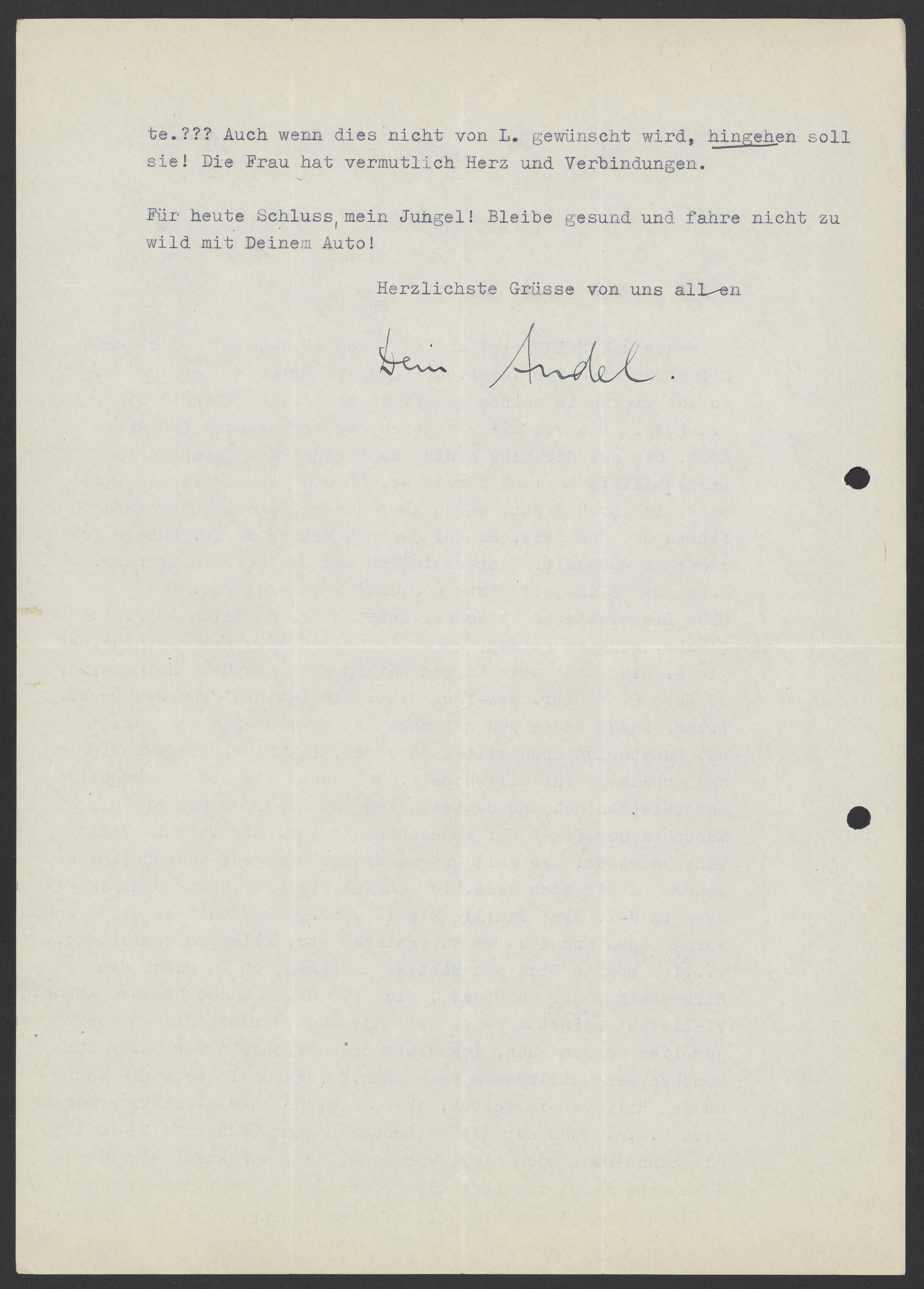 Dass Lieselotte es so schwer hat, tut mir herzlich leid. Ich glaube, es wäre ratsam, wenn sie mal zu Frau Emma Heinsheimer 23 West 85th Str. New York City. Sie ist die Frau des Dr. H. früher Baden Baden und hat nach dessen Tode bis vor Kurzem das Sanatorium noch weiter geleitet, ist fabelhaft tüchtig und scheint sehr hilfsbereit. Ich kenne sie nicht persönlich, nur telephonisch, und da hatte ich den Eindruck von einem Menschen, der immer für andere bereit ist. Sie ist mit Viktor nahe verwandt. Sie solle unsere Grüße bringen, wahrscheinlich kennst Du sie doch auch. Sie schrieb übrigens vor kurzem an Viktor, dass in N-Y. eine Familie ein 10-jahriges Mädchen zu einem schon vorhandenen suche, um es zu erziehen etc. Alles kostenlos etc…