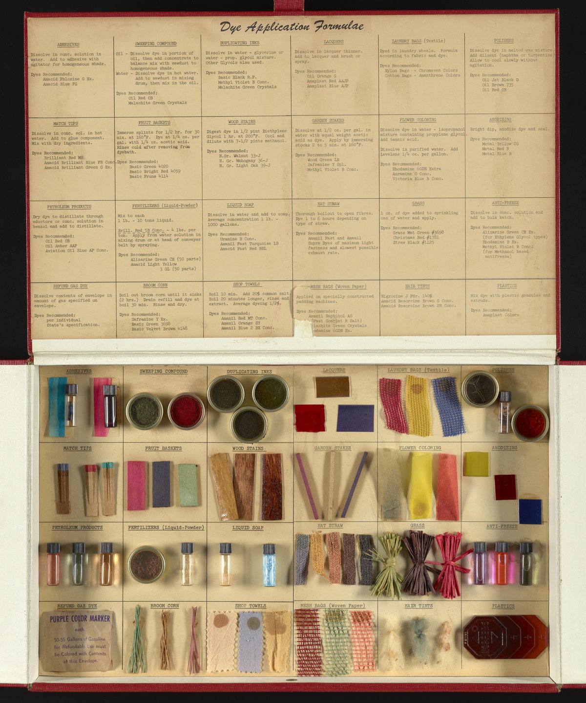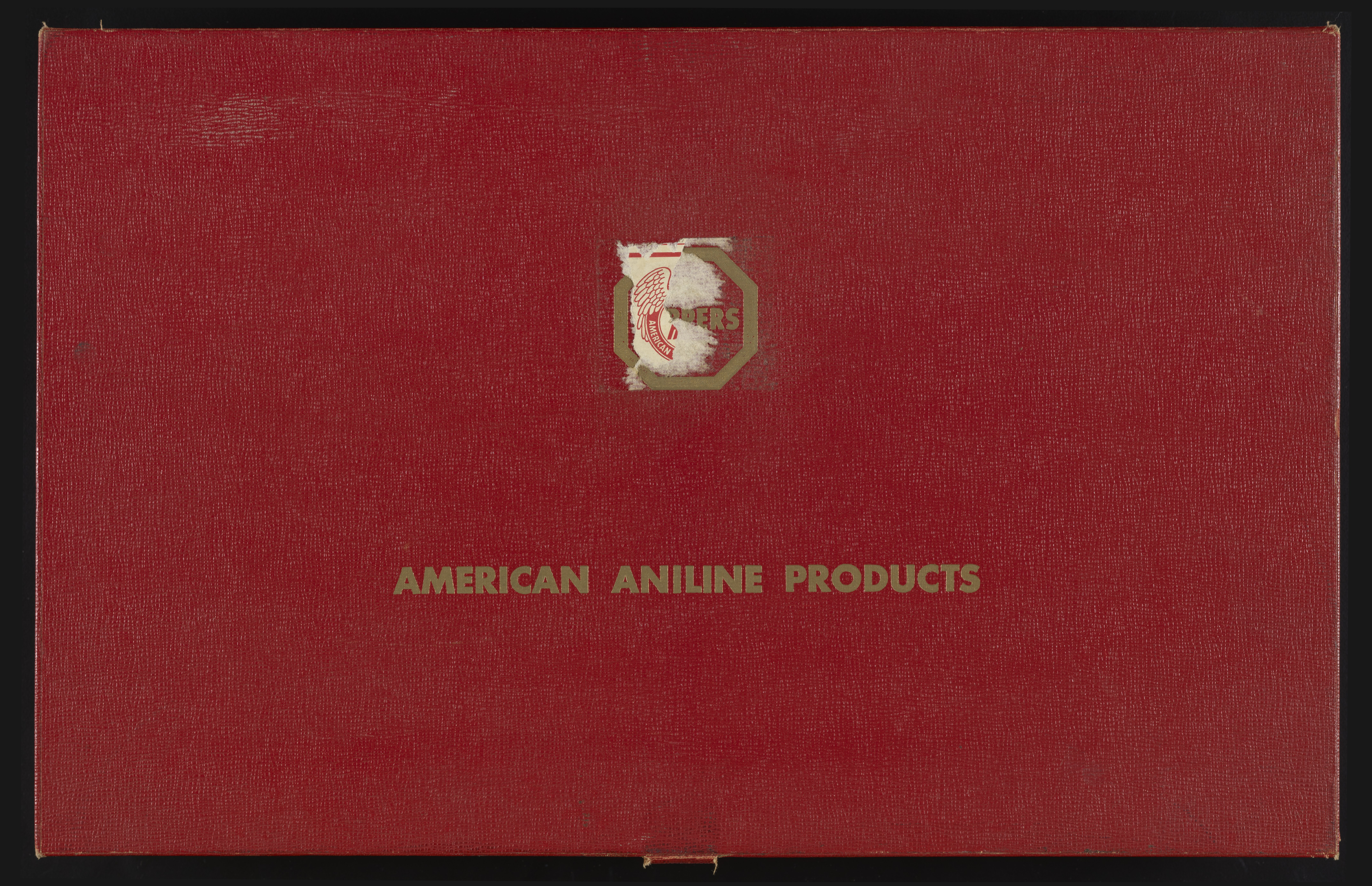 Small JPG1200 x 1438px — 318 KBLarge JPG2880 x 3452px — 1.7 MBFull-sized JPG5721 x 6858px — 5.9 MBOriginal fileTIFF — 5721 x 6858px — 112 MBA red display box of 24 samples of various products colored with dyes. The top and side flaps open to reveal 24 samples of various products colored with dyes. Includes liquids in small bottles, powders in brass circular containers, matches, and wood. The inside of the box shows the dyeing application formula for each product. This sample box may have been manufactured by the American Aniline Works, a short-lived company founded circa 1870 and destroyed by a flood of the Kanawha River by c. 1880.