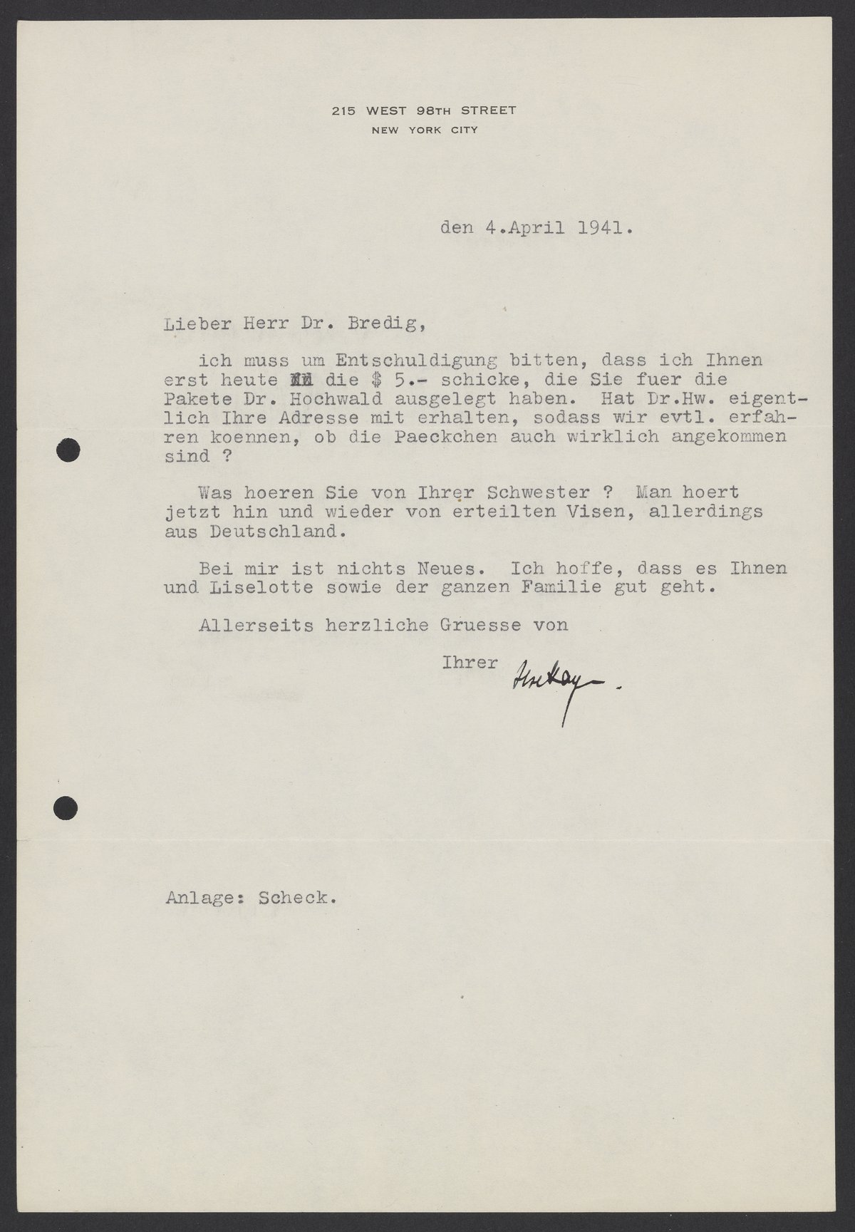 Letter from Ilse Hayn to Max Bredig, April 4, 1941