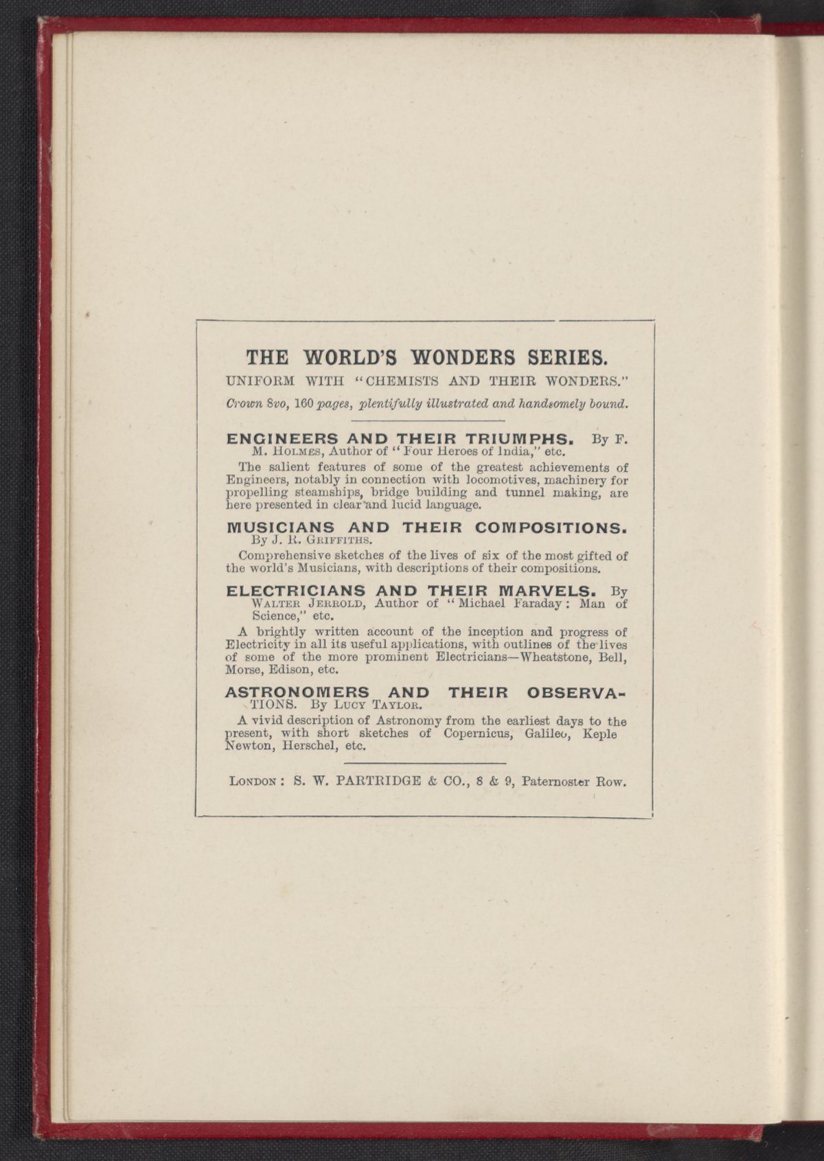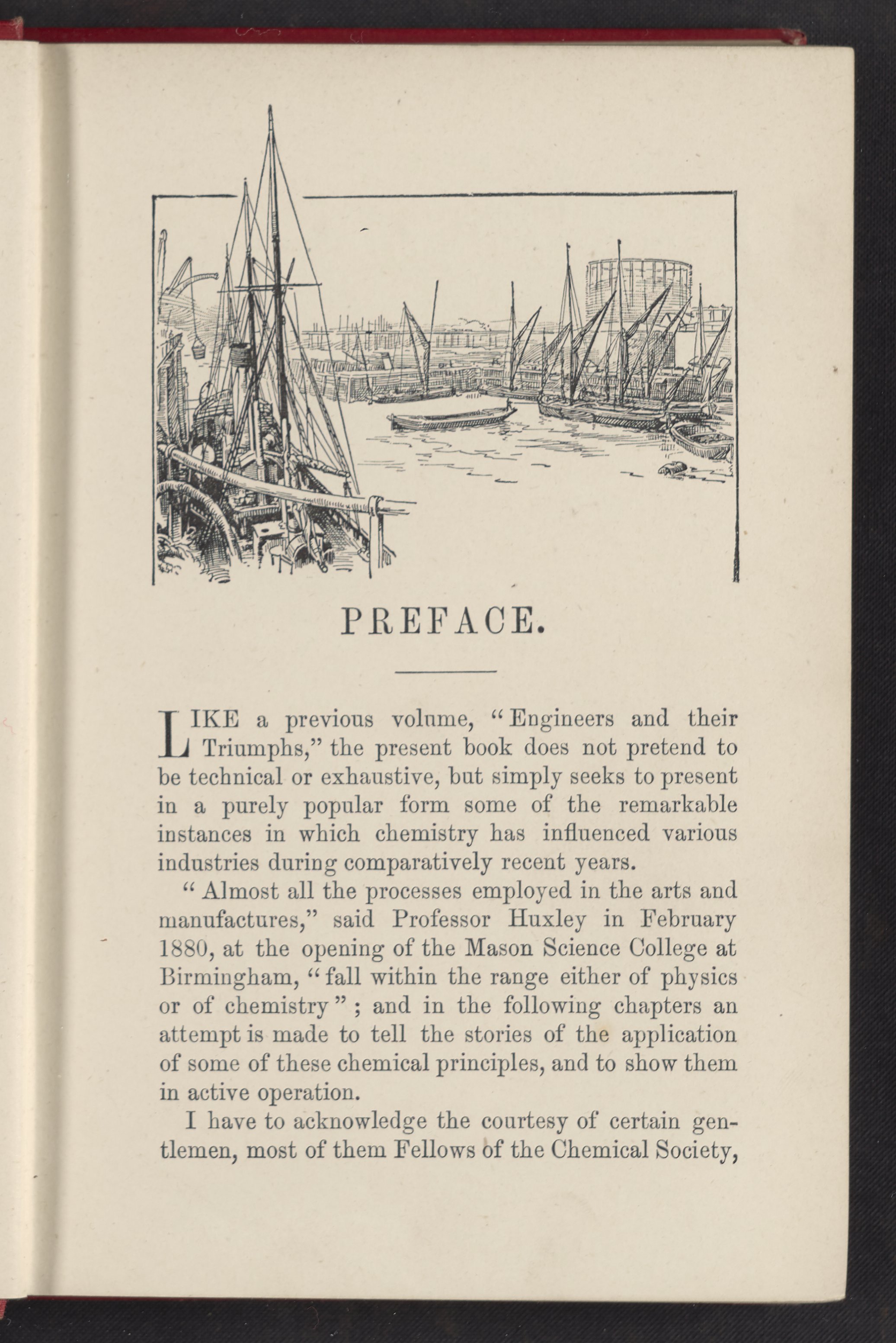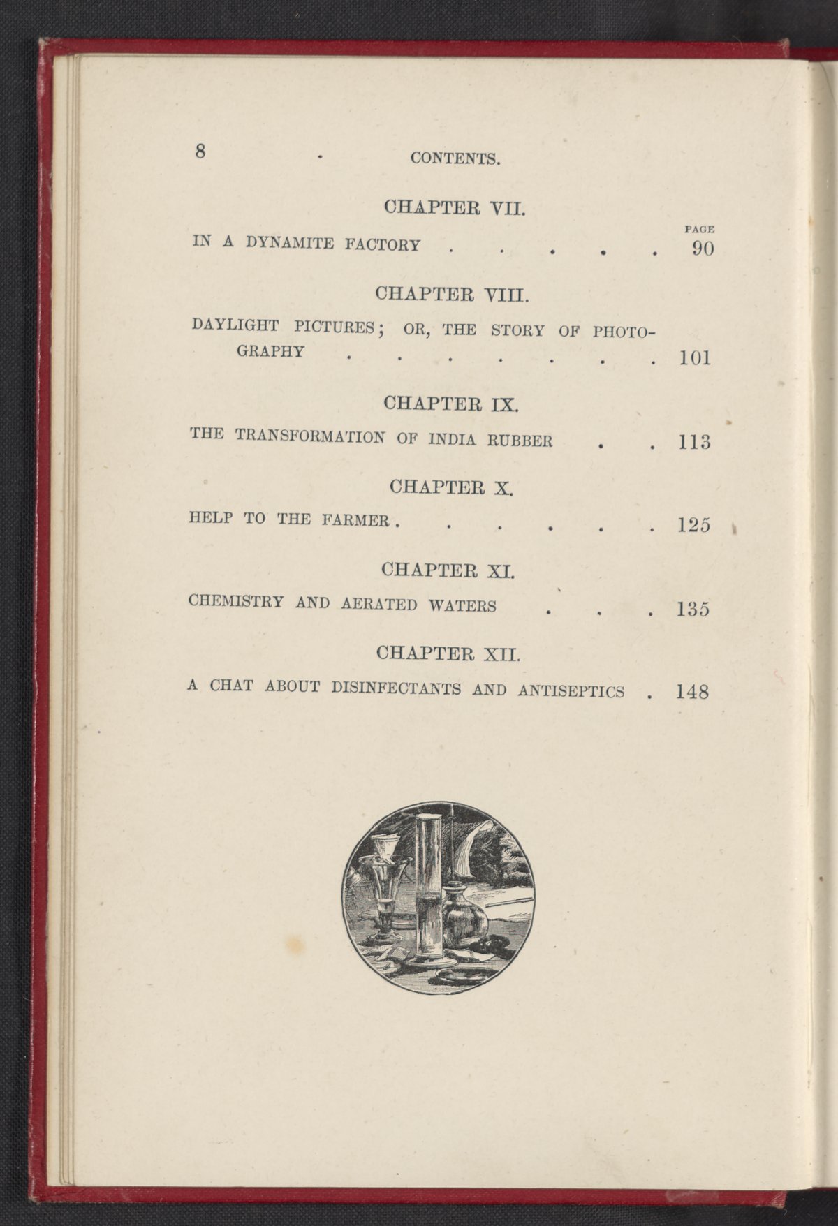 Small JPG1200 x 1648px — 364 KBFull-sized JPG2348 x 3224px — 1.1 MBOriginal fileTIFF — 2348 x 3224px — 21.7 MBPresents an overview of popular chemistry and its influence on modern industry. Focuses on the industrial application of chemical principles, excluding the application of chemical research in areas such as medicine and academia. Intended to provide insight into the chemical sciences for the common layperson. Includes highly-detailed engraved illustrations throughout and a catalog of works published by S.W. Partridge and Co. at the book's end. This volume is part of the World's Wonders series created by publishers S.W. Partridge and Co. The work is digitized in its entirety.