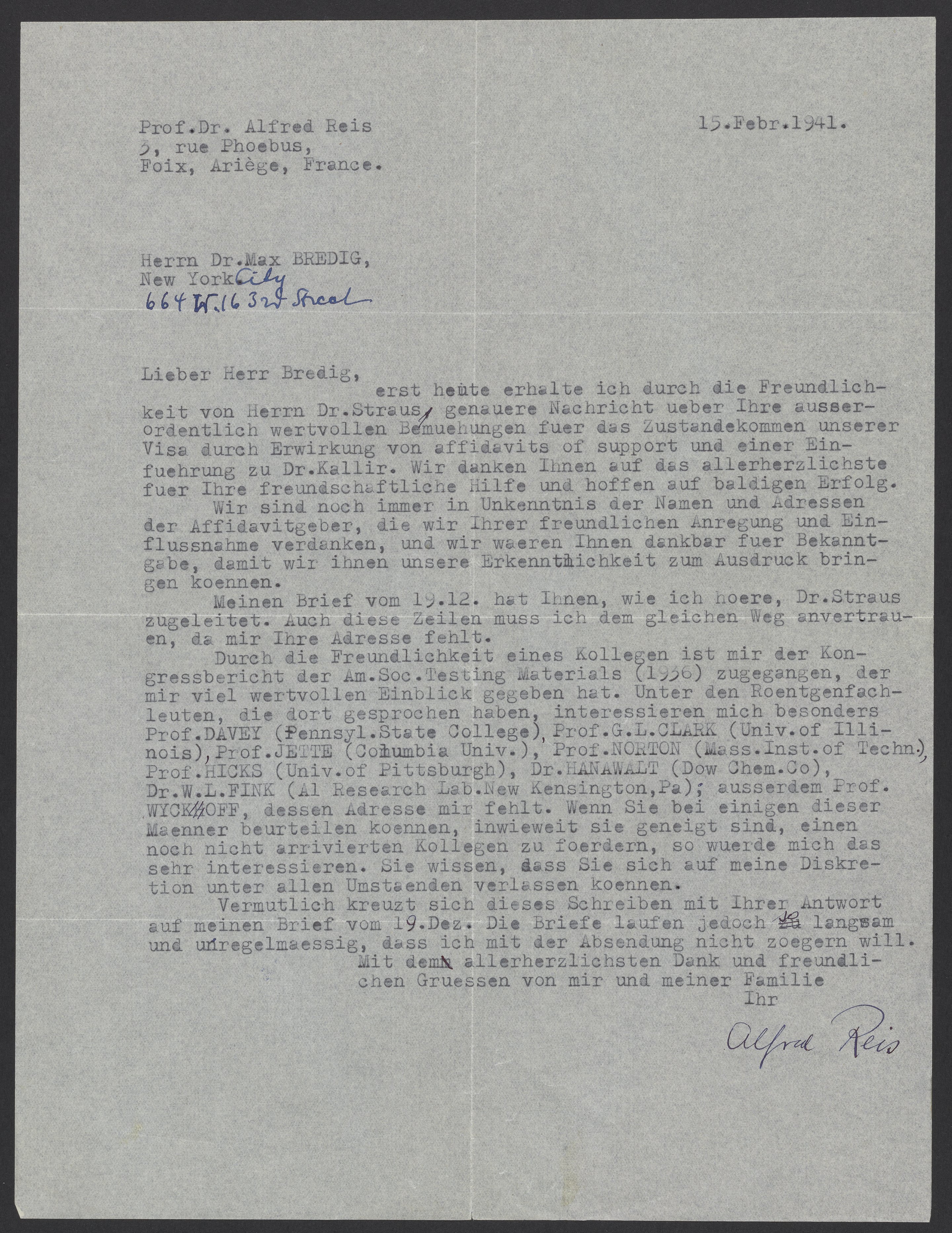 Letter from Alfred Reis (1882-1951) to Max Albert Bredig (1902-1977). Reis thanks Bredig for his assistance in obtaining American immigration visas for himself and his family. He additionally requests the contact information of individuals who provided affidavits on his behalf and of American X-ray specialists.