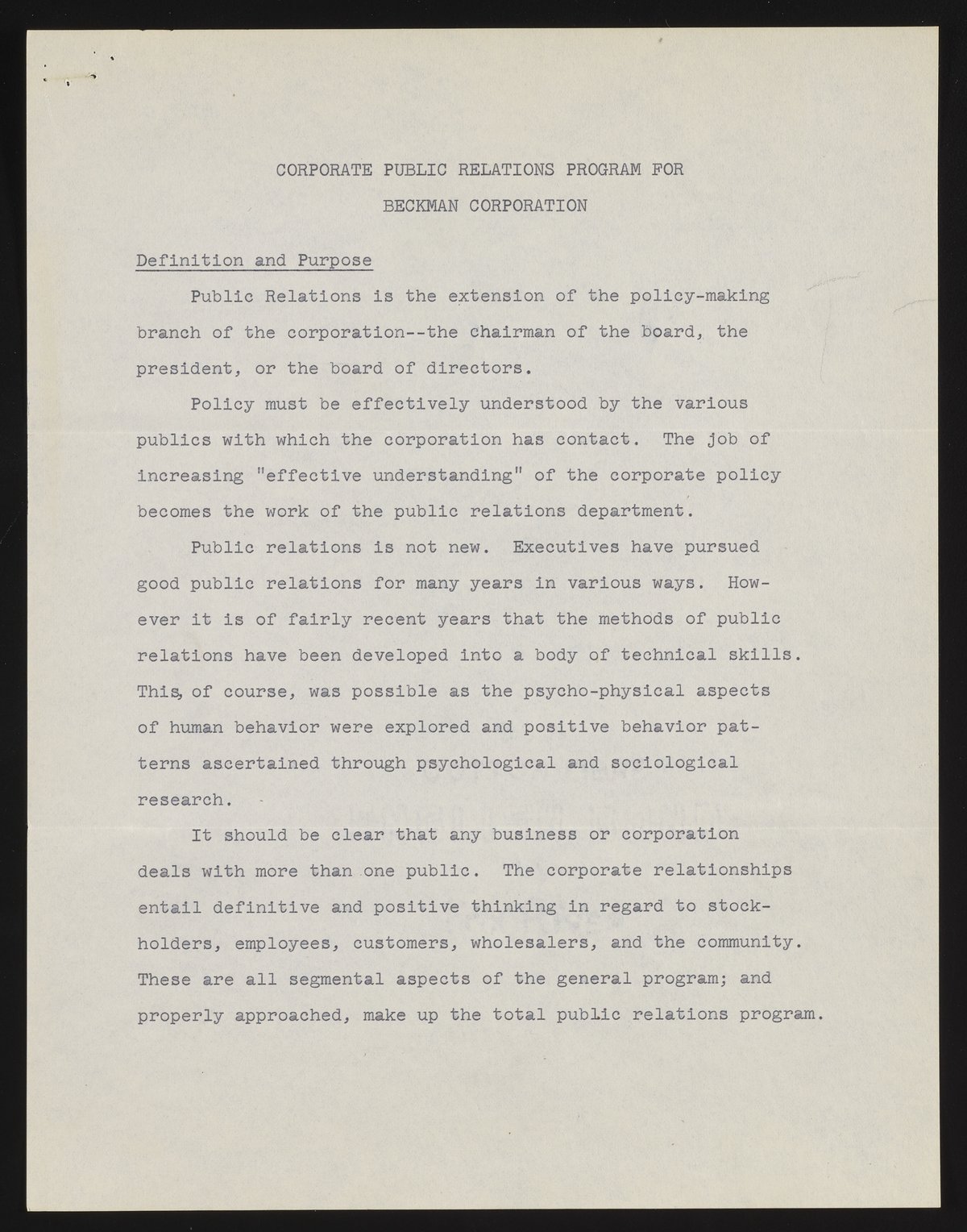 “Corporate Public Relations Program for Beckman Corporation,” June 27, 1955. Beckman Historical Collection, Box 2, Folder 3. Science History Institute. Philadelphia. https://digital.sciencehistory.org/works/736665352.