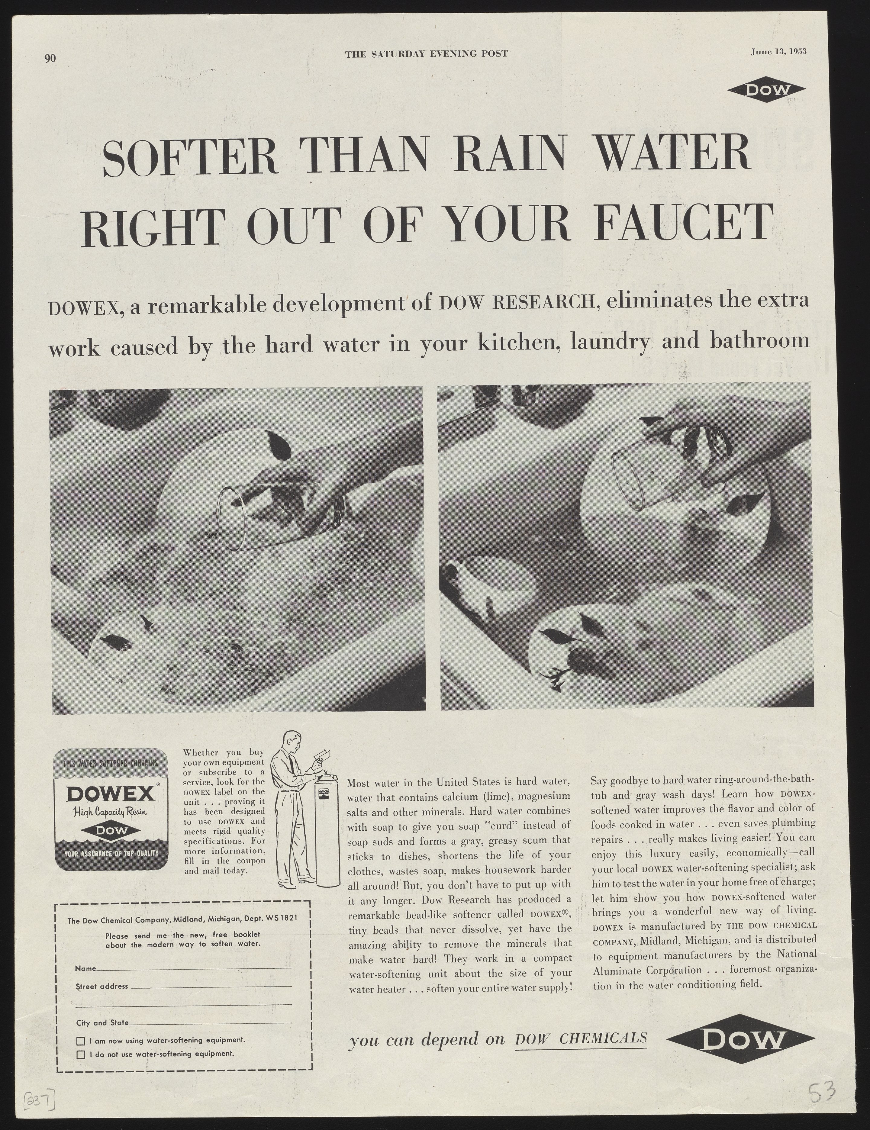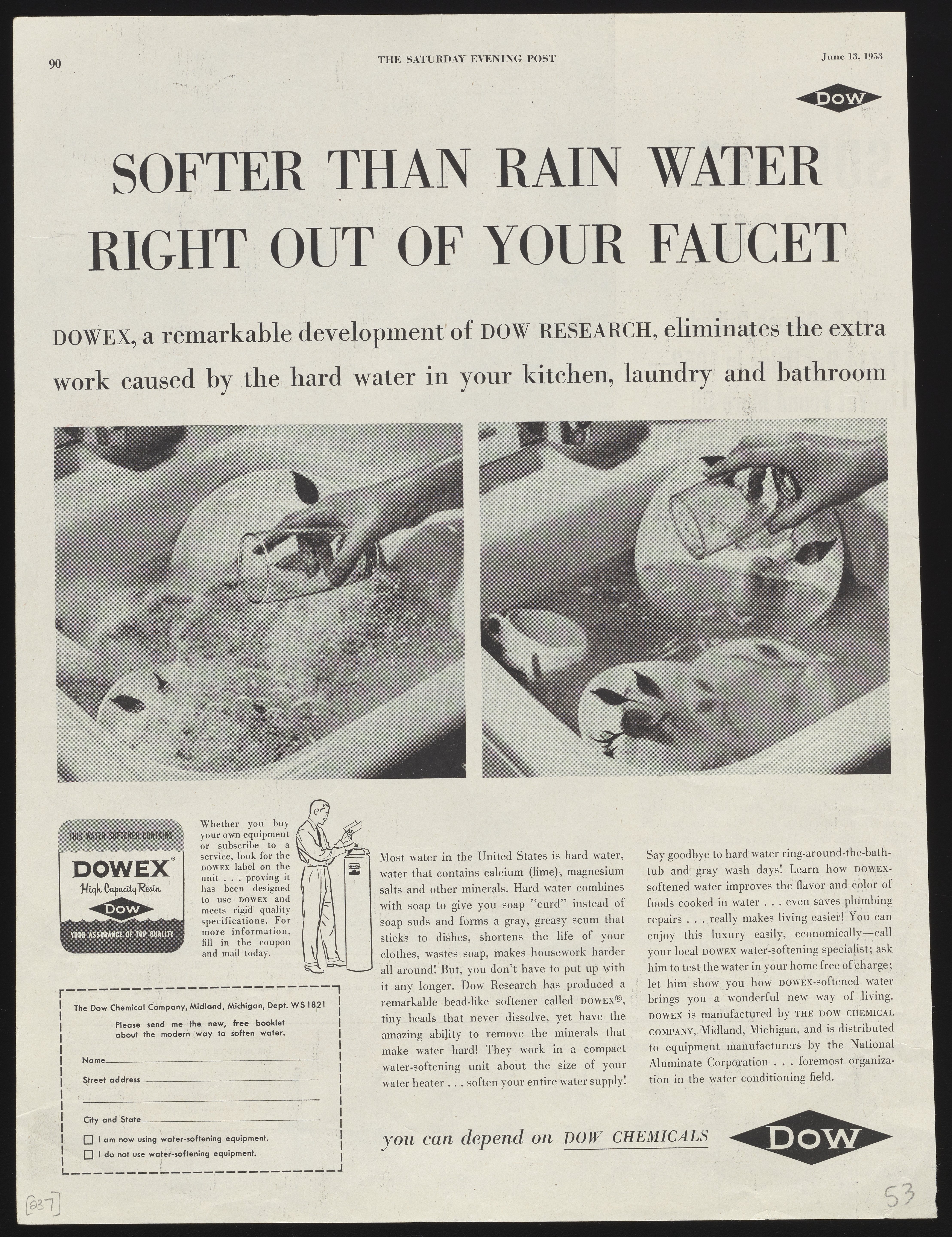 Black and white print advertisement for Dowex, a high-capacity resin manufactured and sold by the Dow Chemical Company for use in water softeners. This advertisement appeared on page 90 of the June 13, 1953 edition of The Saturday Evening Post.