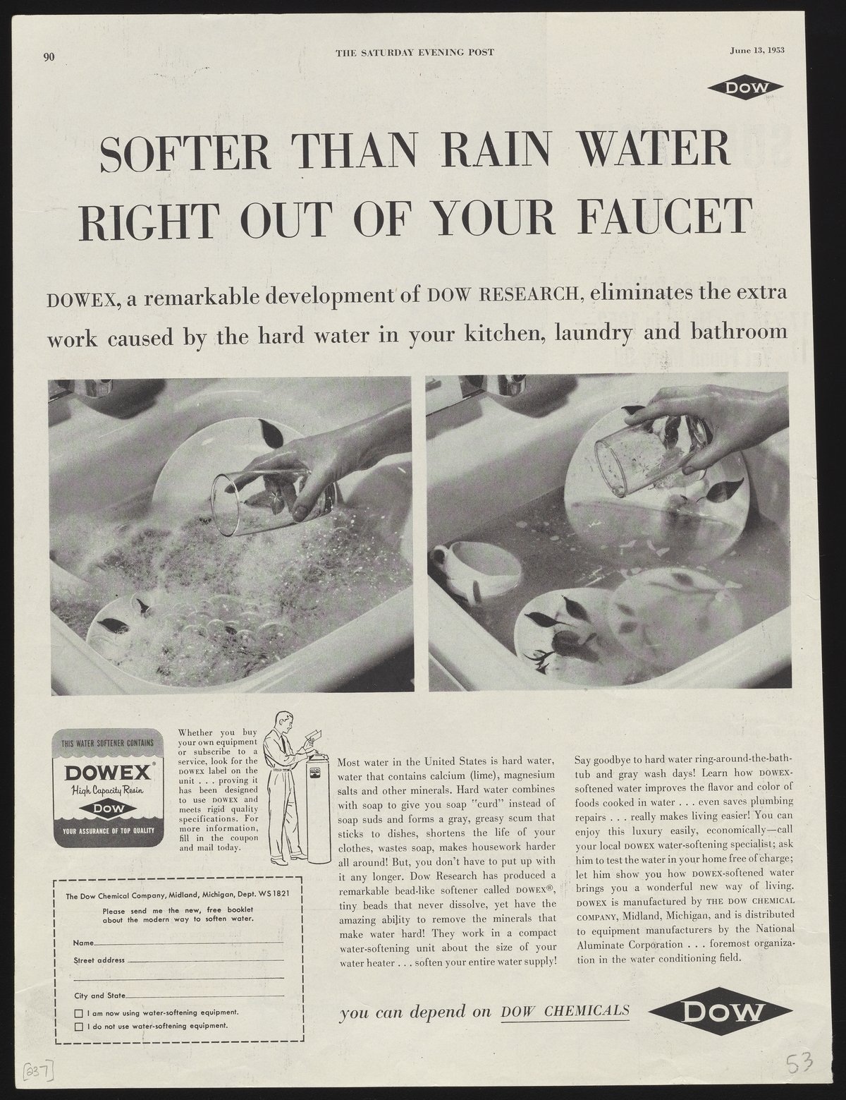 Dow Chemical Company. “Softer Than Rain Water Right Out of Your Faucet,” June 13, 1953. Advertisements from the Dow Chemical Historical Collection, Box 7. Science History Institute. Philadelphia. https://digital.sciencehistory.org/works/76537217c.