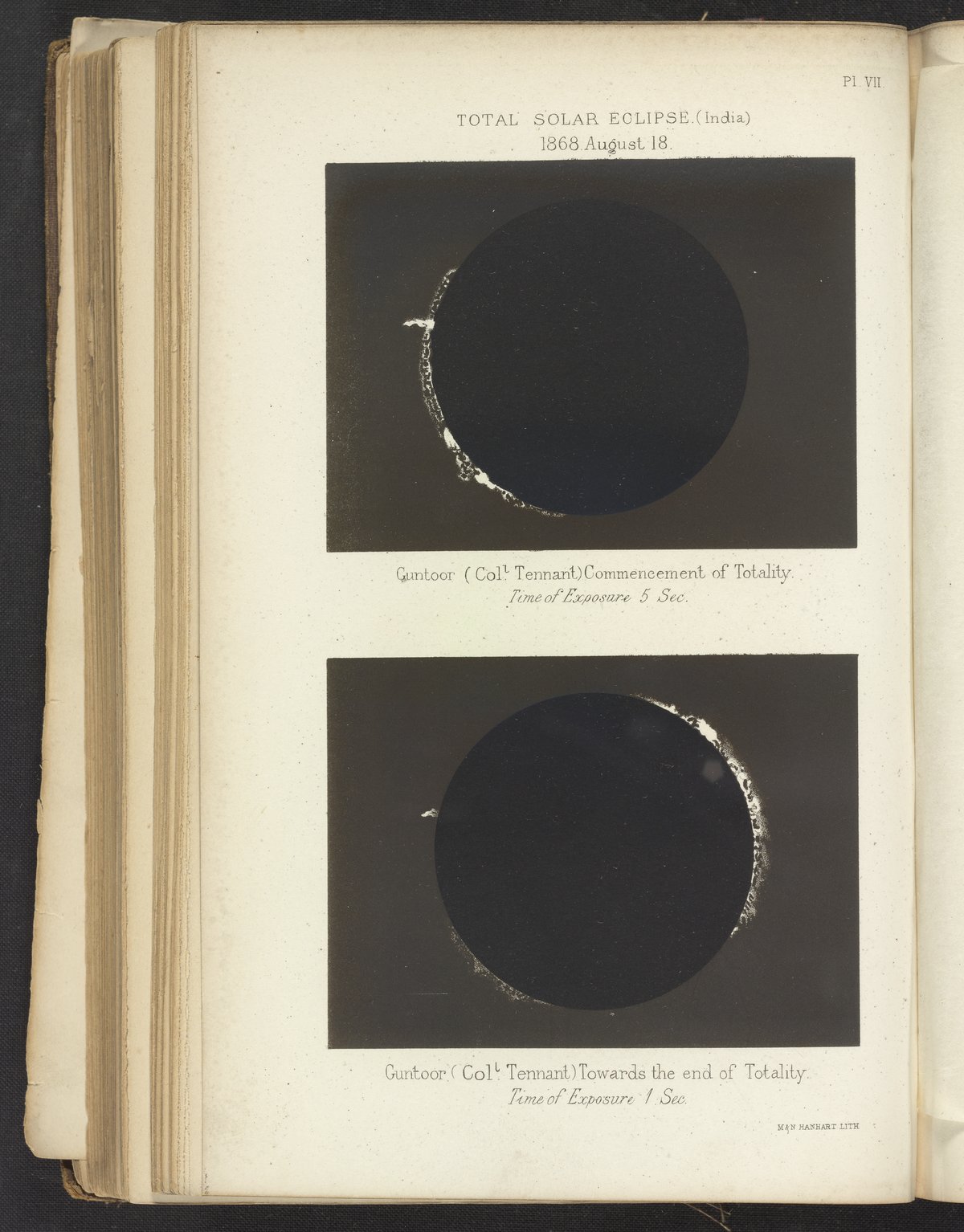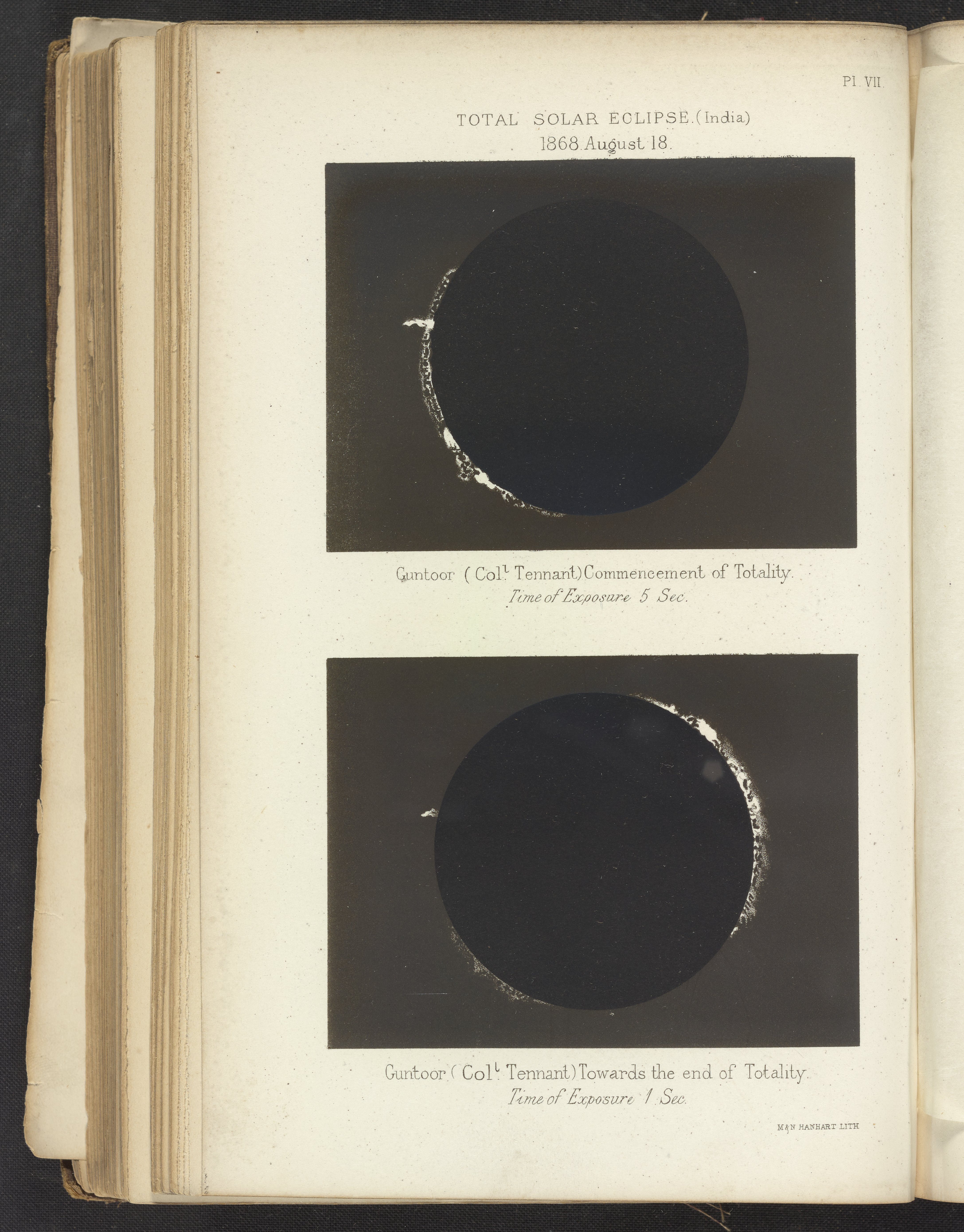 Schellen, Heinrich. “Total Solar Eclipse Observed from India in 1868.” Spectrum Analysis in Its Application to Terrestrial Substances, and the Physical Constitution of the Heavenly Bodies. London, England: M. & N. Hanhart (Printers), 1872. https://digital.sciencehistory.org/works/76537246t.