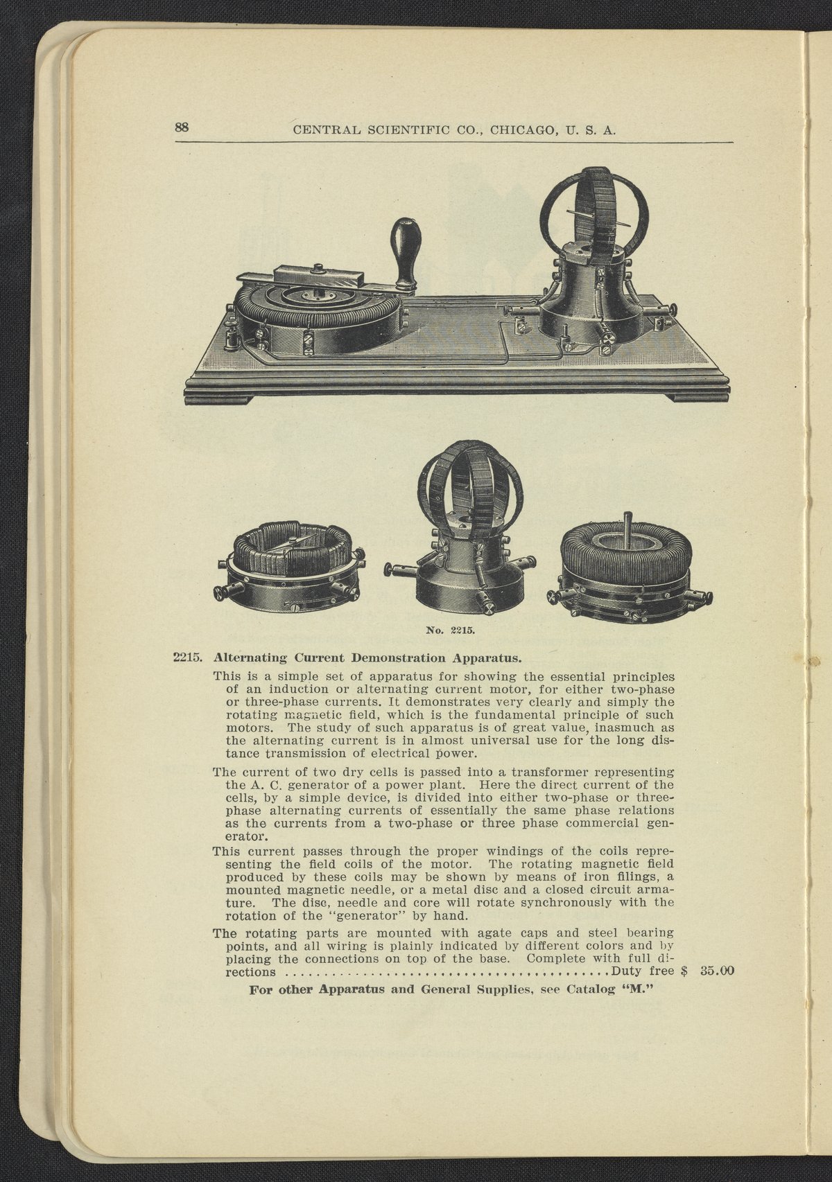 Central Scientific Company. “Alternating Current Demonstration Apparatus.” Physical Apparatus for Universities and Colleges Manufactured and Imported by Central Scientific Co. Chicago, Illinois: Central Scientific Company, 1912. Q185.7 .C46 1912. Science History Institute. Philadelphia. https://digital.sciencehistory.org/works/76v412k.