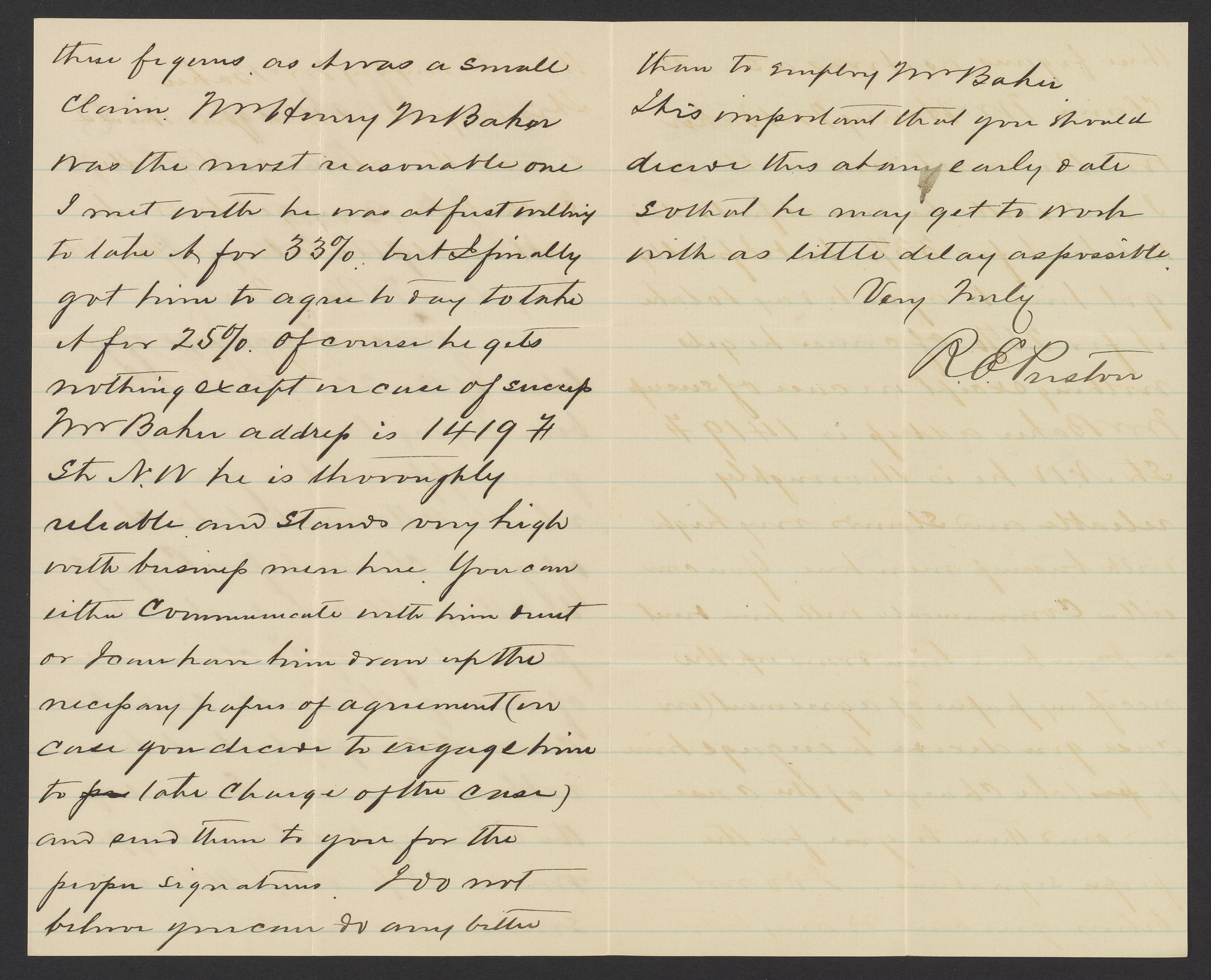 Small JPG1200 x 1873px — 342 KBFull-sized JPG2178 x 3400px — 998 KBOriginal fileTIFF — 2178 x 3400px — 21.2 MBLetter from Robert E. Preston (1836-1911), of the United States Mint Bureau, to Margaret M. Booth née Cardeza to inform Mrs. Booth that he has been looking into securing the services of an attorney for her, but is unhappy about the large percentages of any award that they will claim as their fee. He recommends Mr. Henry M. Baker.