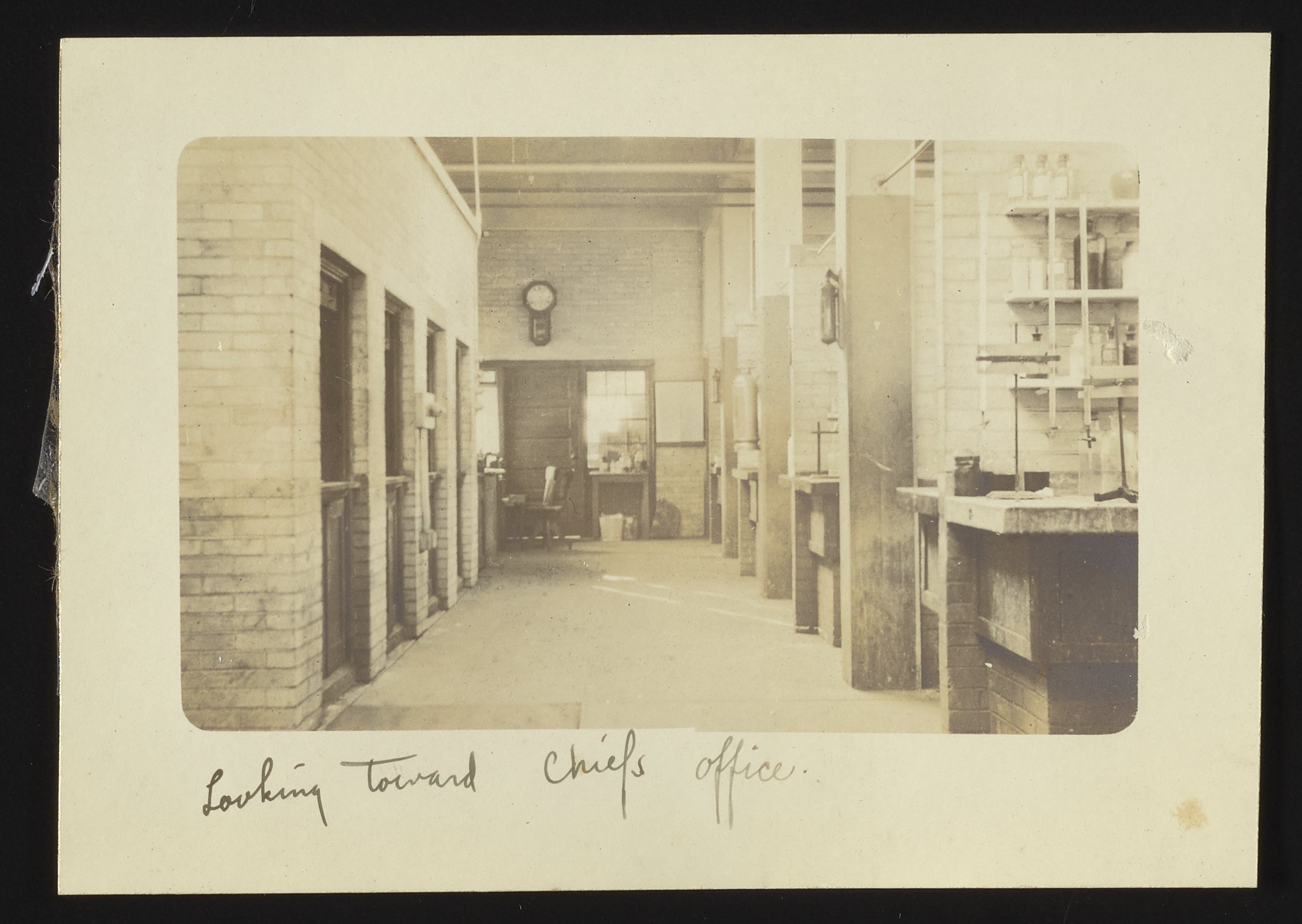 General view of an unidentified laboratory facility looking toward the chief's office from the perspective of the supply store, with a side view of various offices and work benches. Notably, the photograph is printed as a postcard, with space reserved on the verso for a message, mailing address, and postage. While the setting of this photograph is unidentified, inscriptions and supporting materials suggest that it many depict a laboratory associated with the U.S. Bureau of Standards. However, there is no contextual information directly linking this photo to the Bureau of Standards, which broadly conducted tests on a variety of physical materials, developed a range of technological standards, and supported the dissemination of scientific and technological information.