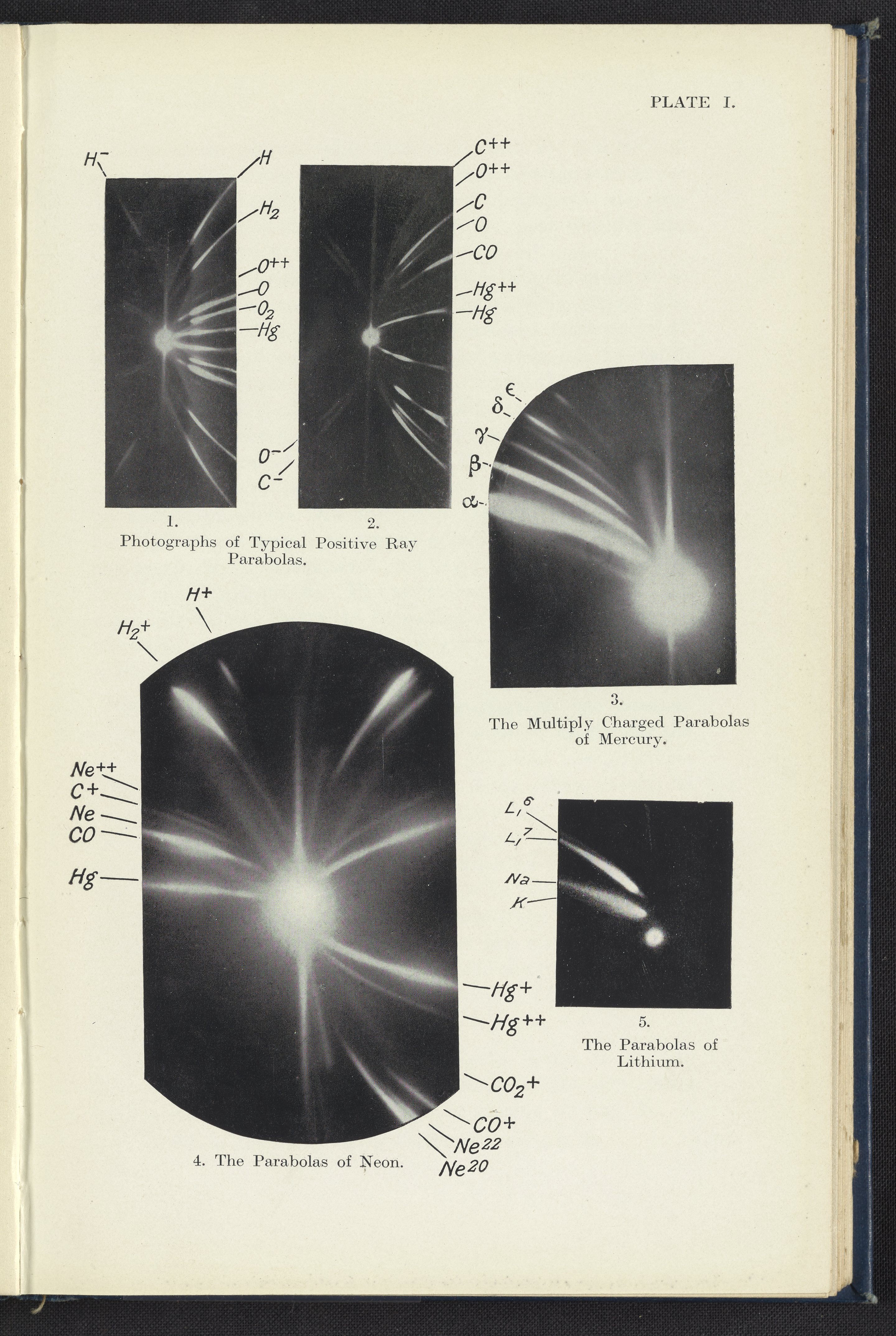 Aston, Francis William. “Positive Ray Parabolas.” Isotopes. London, England: Edward Arnold (Publishers), 1922. https://digital.sciencehistory.org/works/79407z32j.