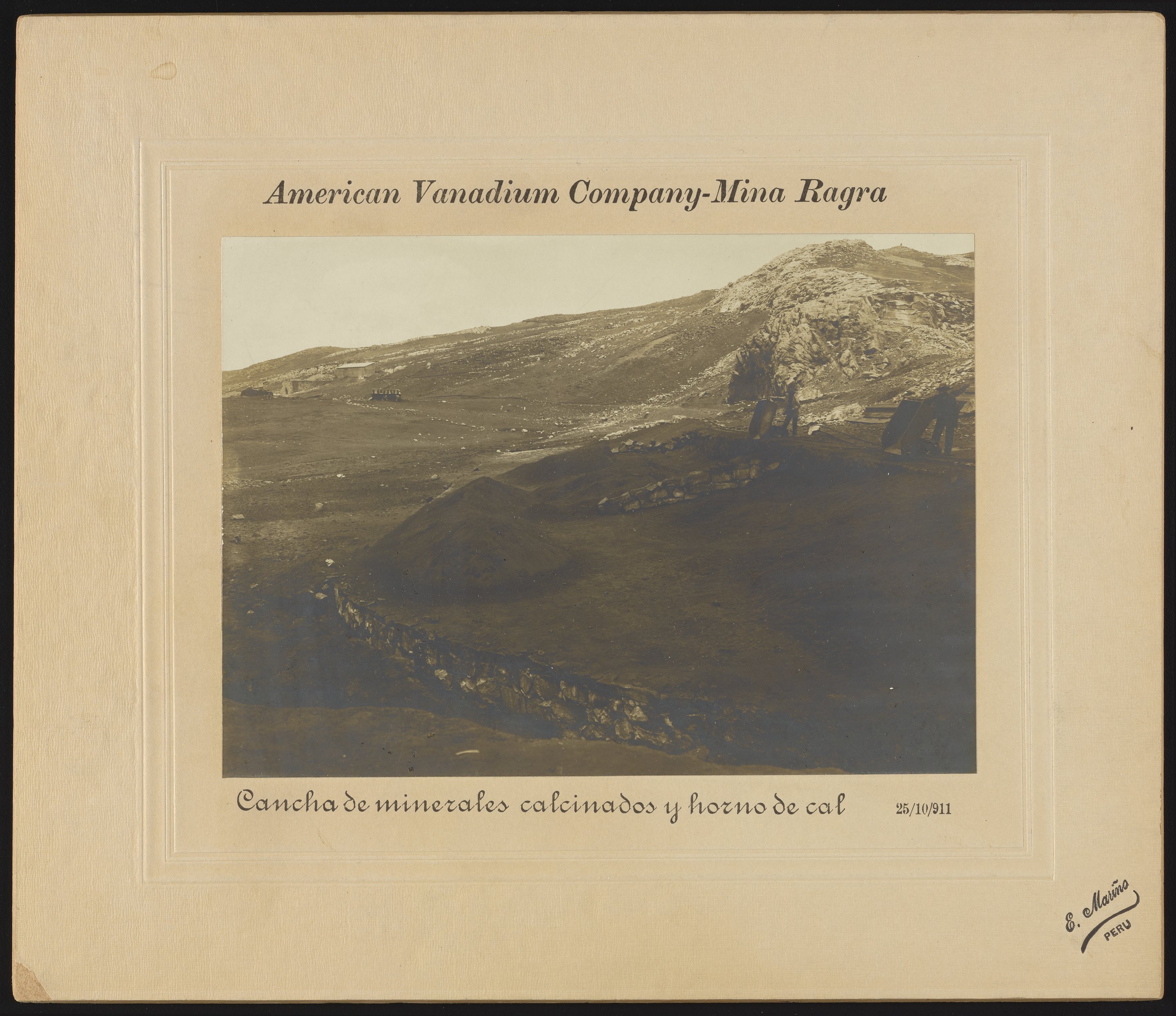 Vanadium Corporation of America. “Cancha De Minerales Calcinados y Horno De Cal,” October 25, 1911. Vanadium Corporation of America Photograph Collection, Box 2. Science History Institute. Philadelphia. https://digital.sciencehistory.org/works/7d278t65d.