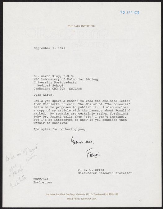 Crick, Francis. “Letter from Francis Crick to Aaron Klug, September 5, 1979,” September 5, 1979. History of Molecular Biology Collection, Box 20, Folder 3. Science History Institute. Philadelphia. https://digital.sciencehistory.org/works/7d79250.