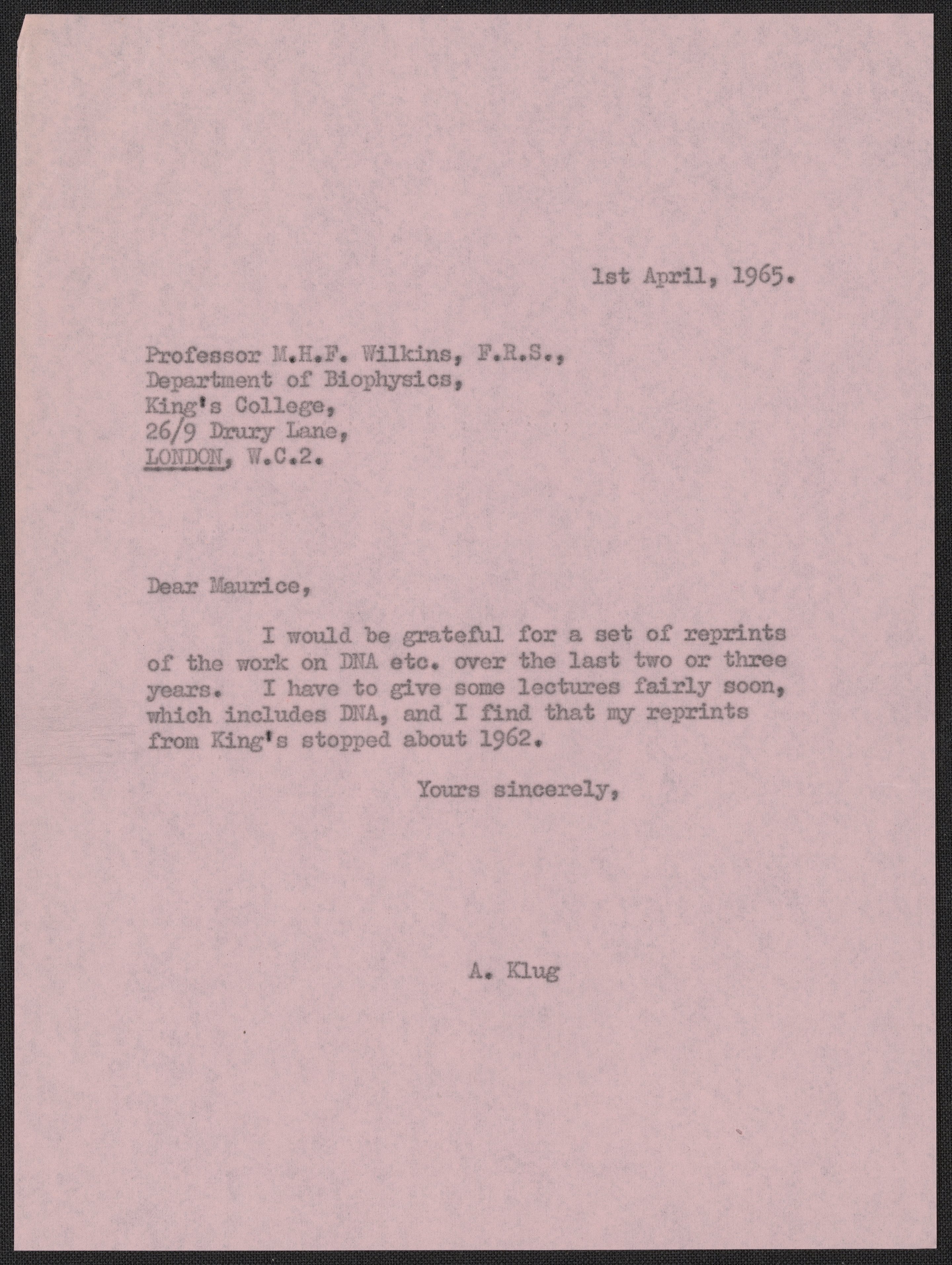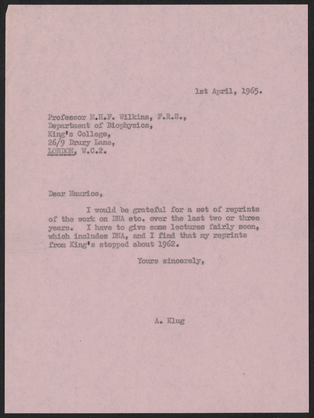 Letter from Aaron Klug to Maurice F. Wilkins, April 1, 1965