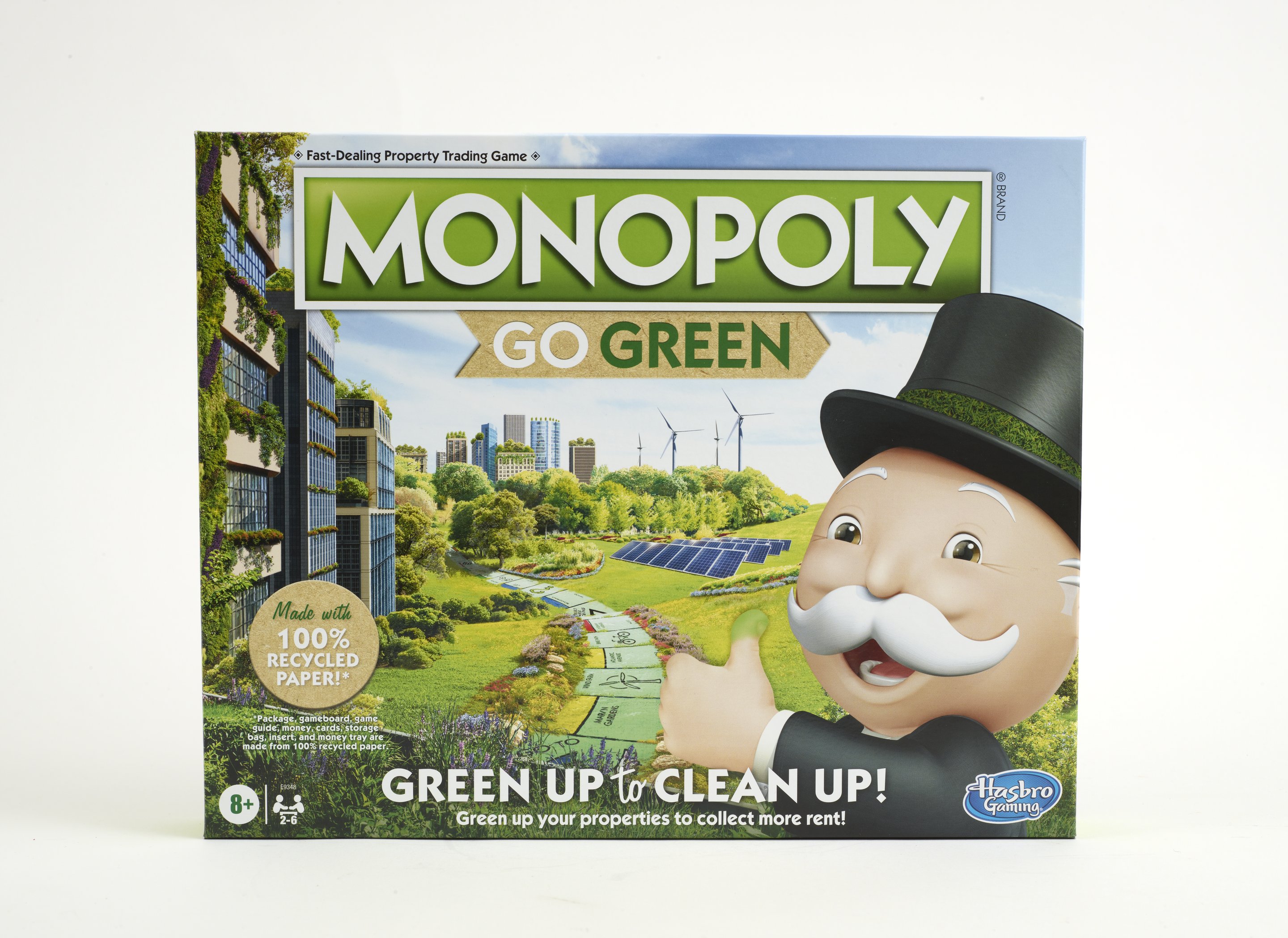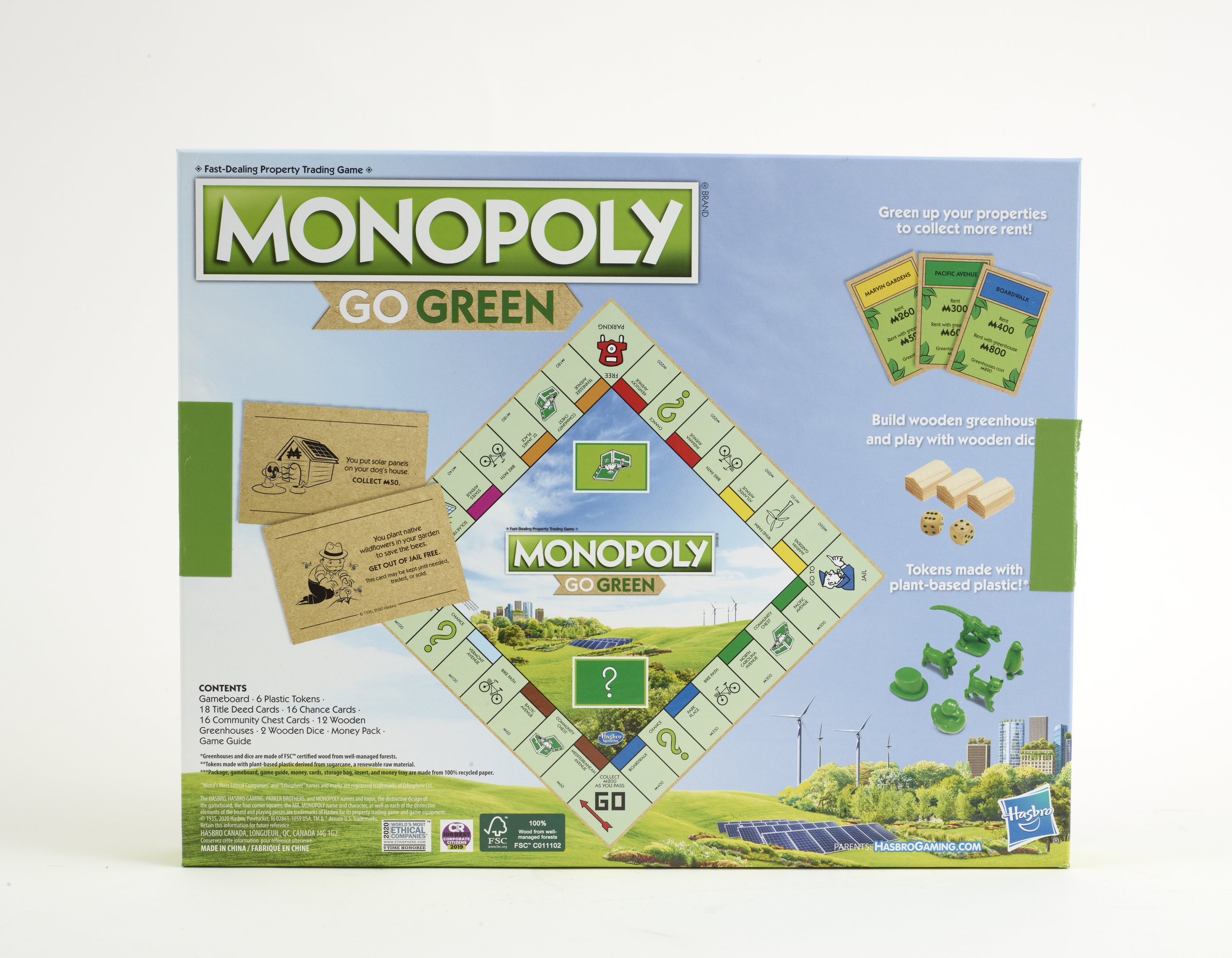Small JPG1200 x 967px — 177 KBLarge JPG2880 x 2321px — 694 KBFull-sized JPG8377 x 6751px — 4.0 MBOriginal fileTIFF — 8377 x 6751px — 162 MBA rectangular box with an illustration of a city using multiple forms of renewable energy and the iconic Mr. Monopoly. Box contains 1 instruction booklet, 1 gameboard, 6 plastic tokens, 18 title deed cards, 16 chance cards, 16 community chest cards, 12 wooden greenhouses, 2 wooden dice, and 1 pack of play money.