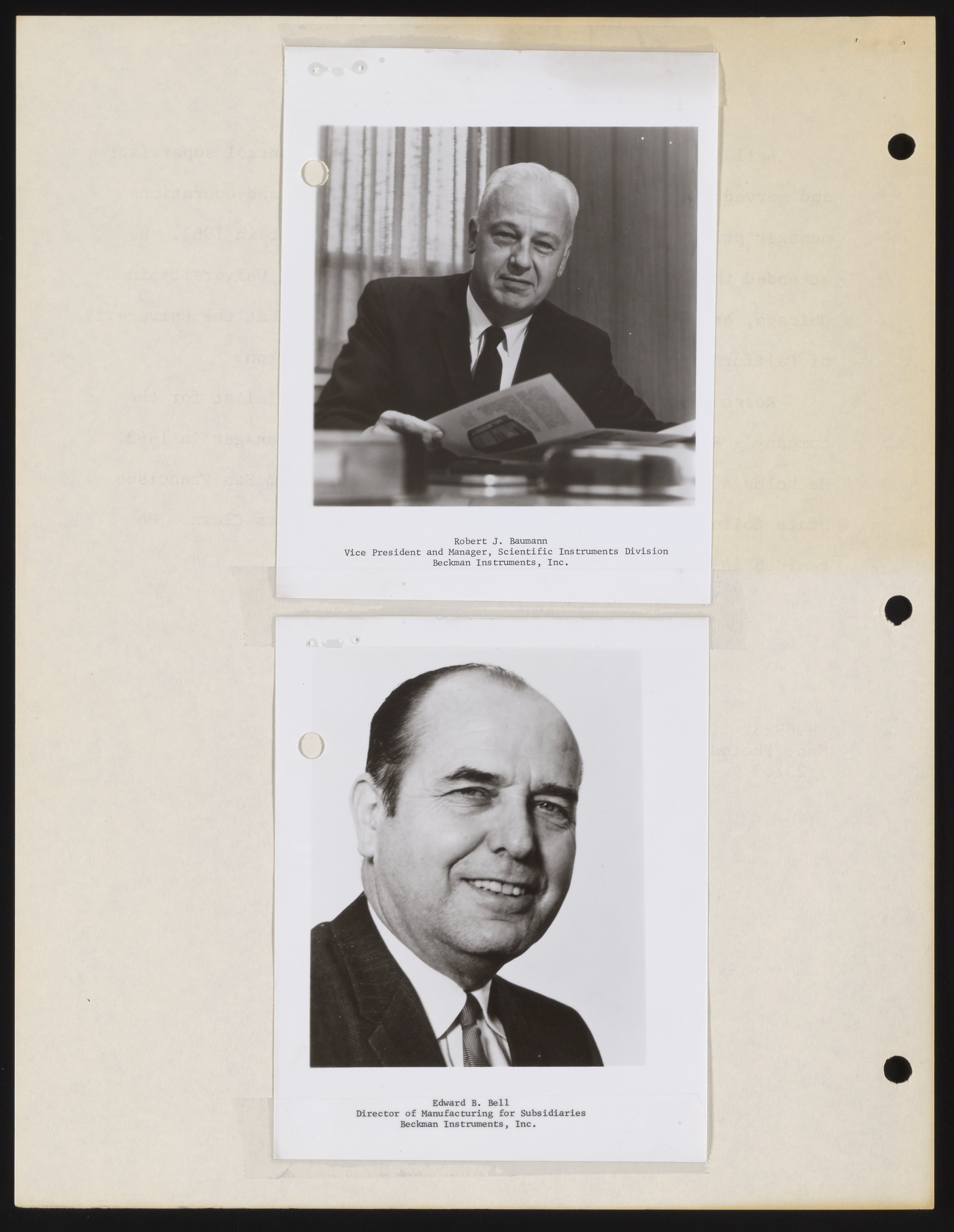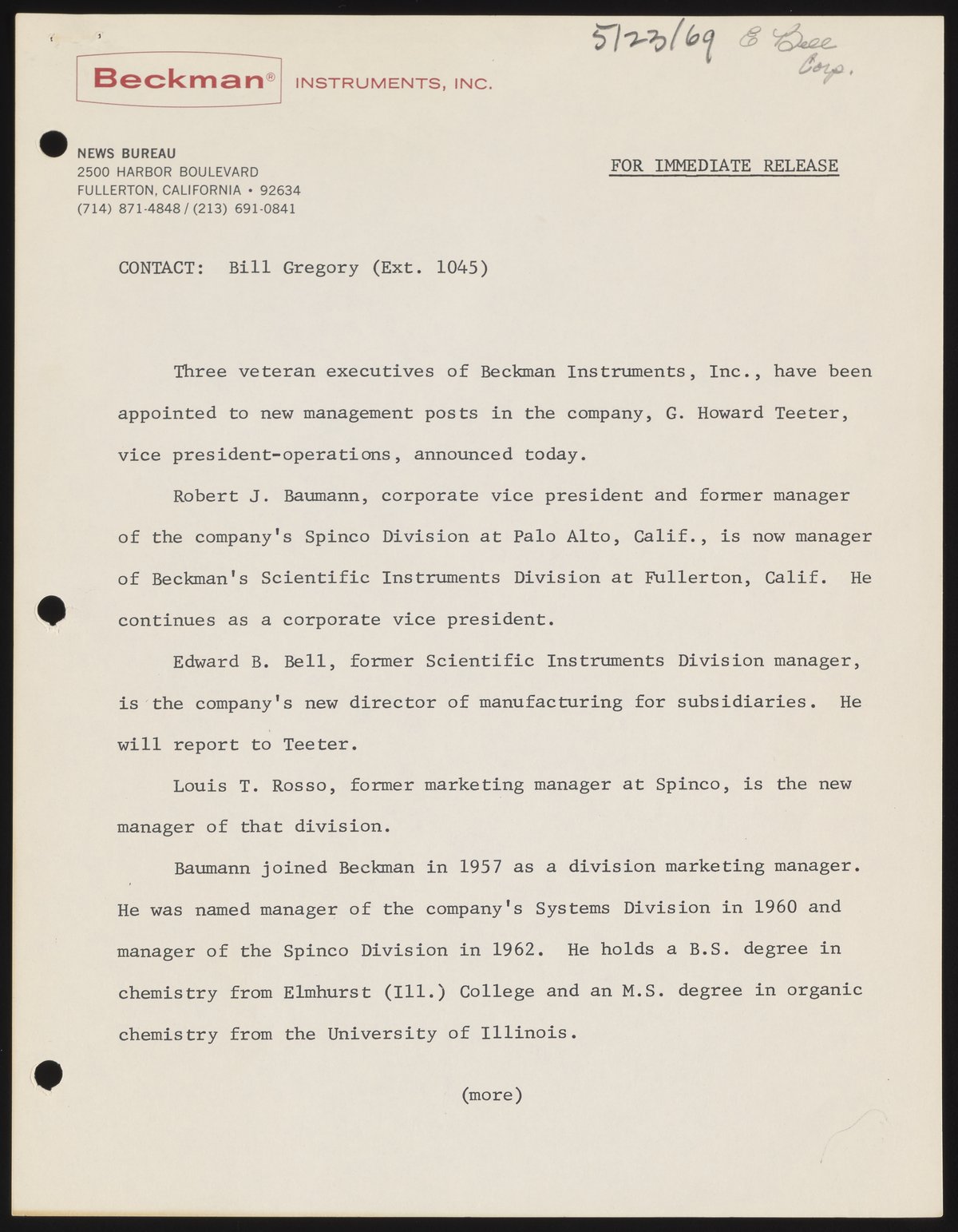 Gregory, Bill. “Beckman Executives' Appointments Press Release,” May 23, 1969. Beckman Historical Collection, Box 58, Folder 64. Science History Institute. Philadelphia. https://digital.sciencehistory.org/works/7h149q29s.