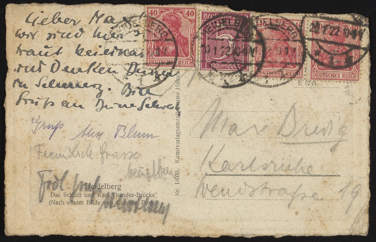 “1922 Postcard of Heidelberg, Germany to Max Bredig,” 1922. Papers of Max Bredig, Box 20. Science History Institute. Philadelphia. https://digital.sciencehistory.org/works/7i58454.