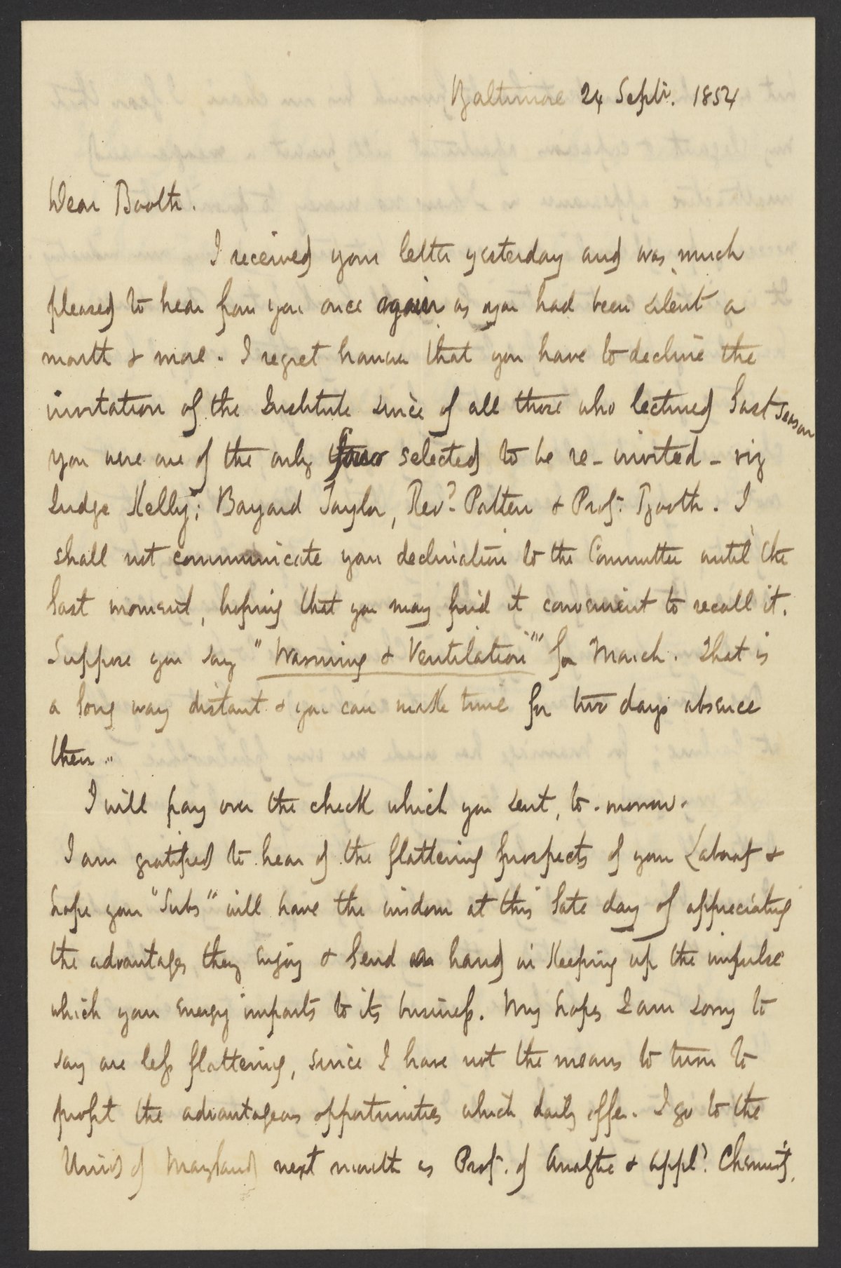 Letter from Campbell Morfit to James Curtis Booth, September 24, 1854