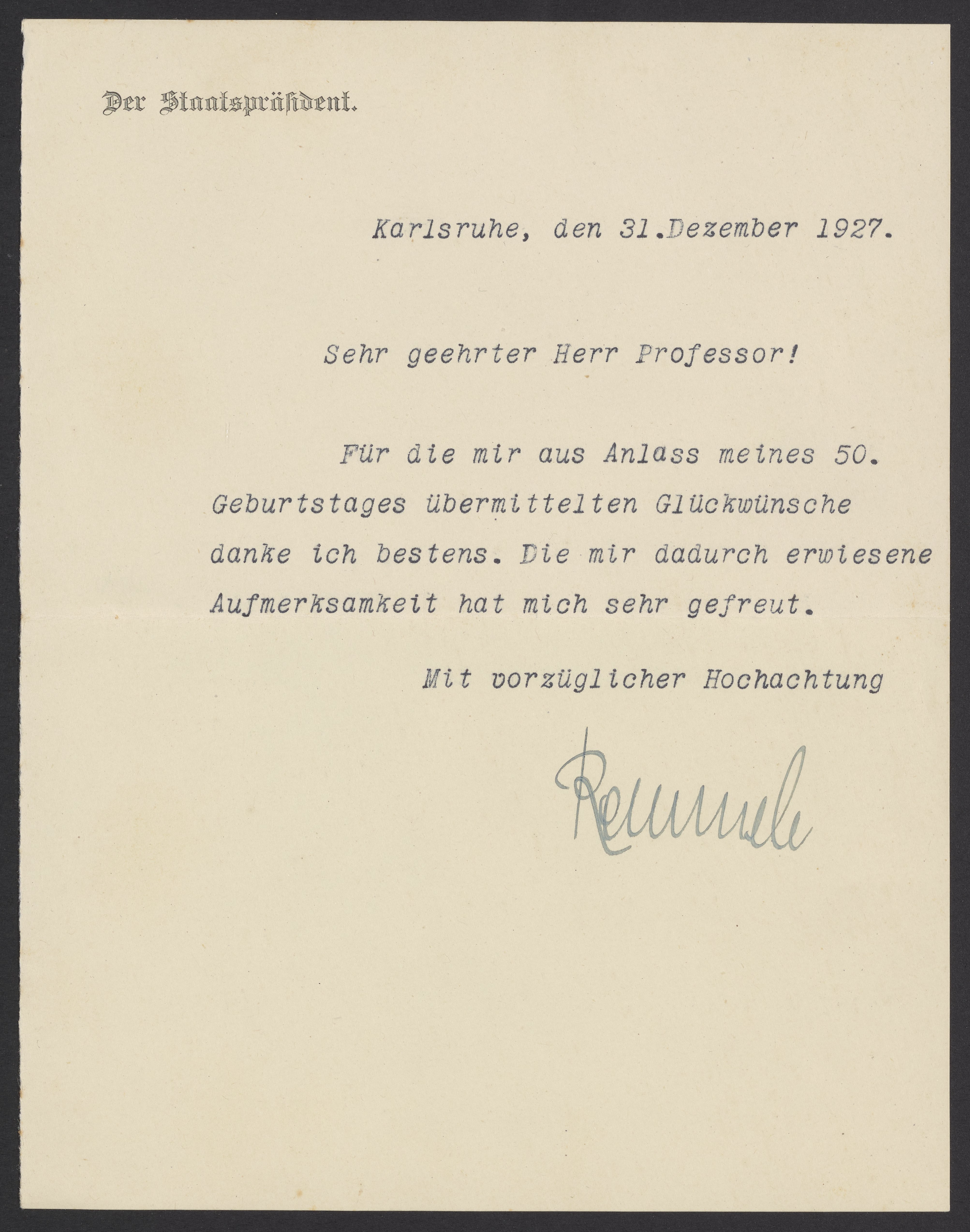 Thank you note to Georg Bredig (1868-1944), likely written by Adam Remmele (1877-1951), who at the time of writing would have been the state president of Baden, Germany.