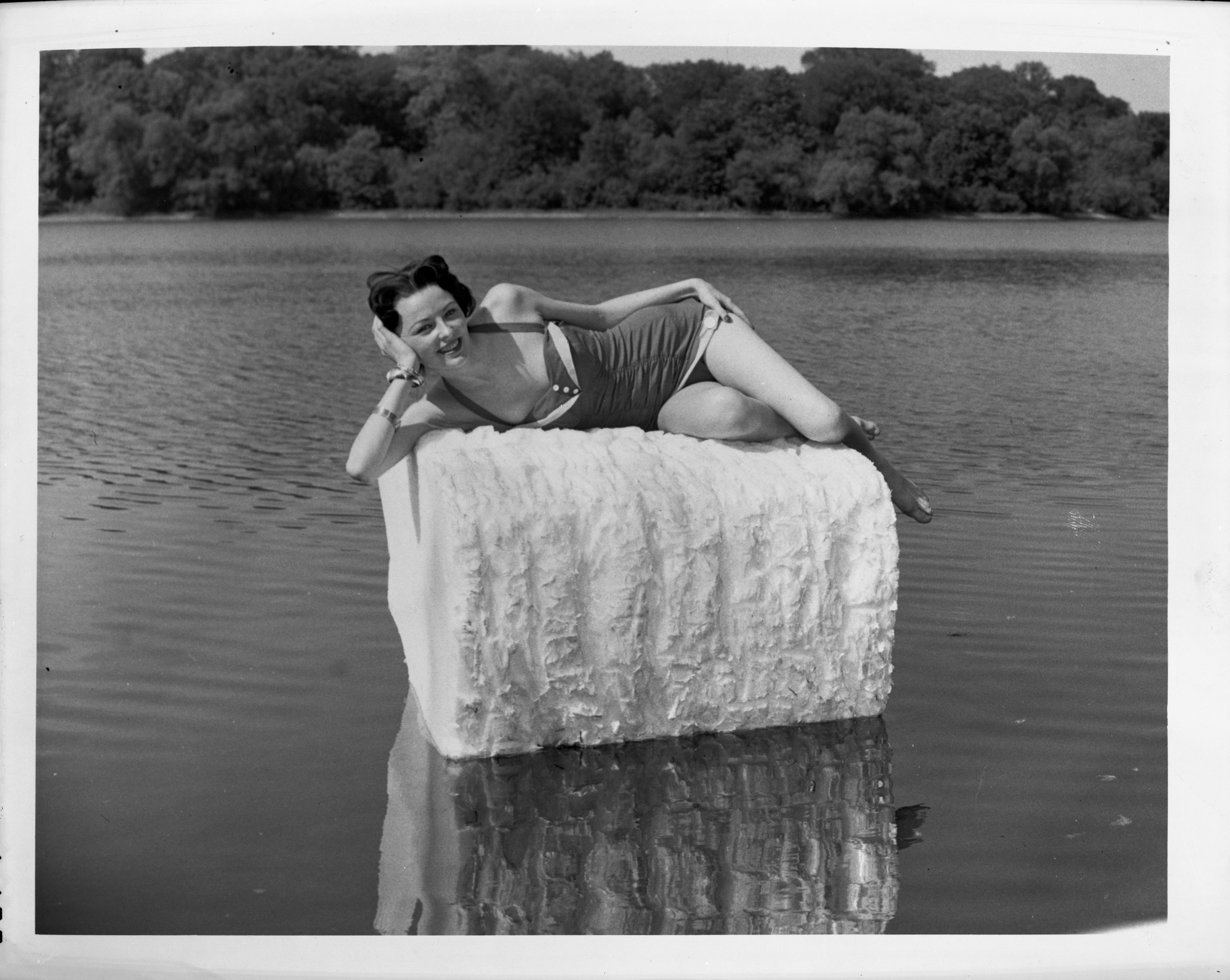 General view of a female model posed on a log of Styrofoam situated on an unidentified body of water. Likely used in advertisements and promotional materials, this scene was designed to emphasize the buoyant and lightweight properties of the material.