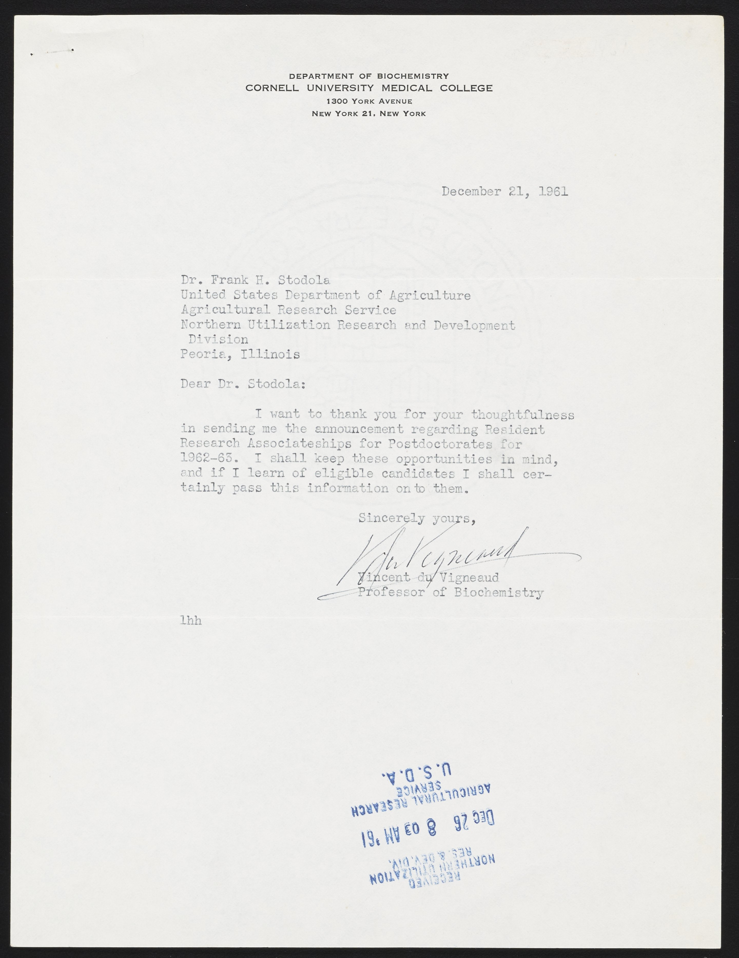 Letter from Vincent du Vigneaud to Frank Stodola