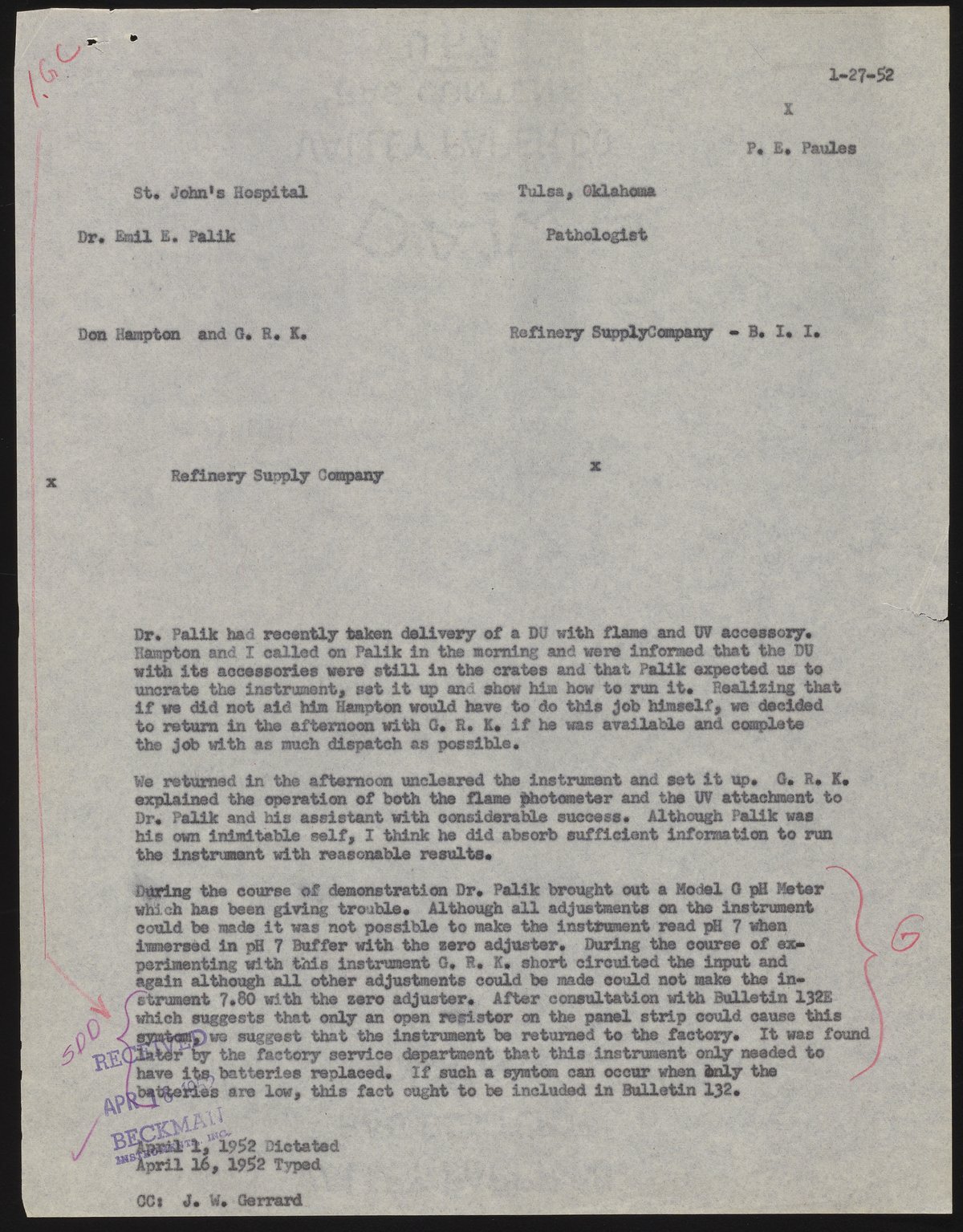 Letter from P. E. Paules to Beckman Instruments