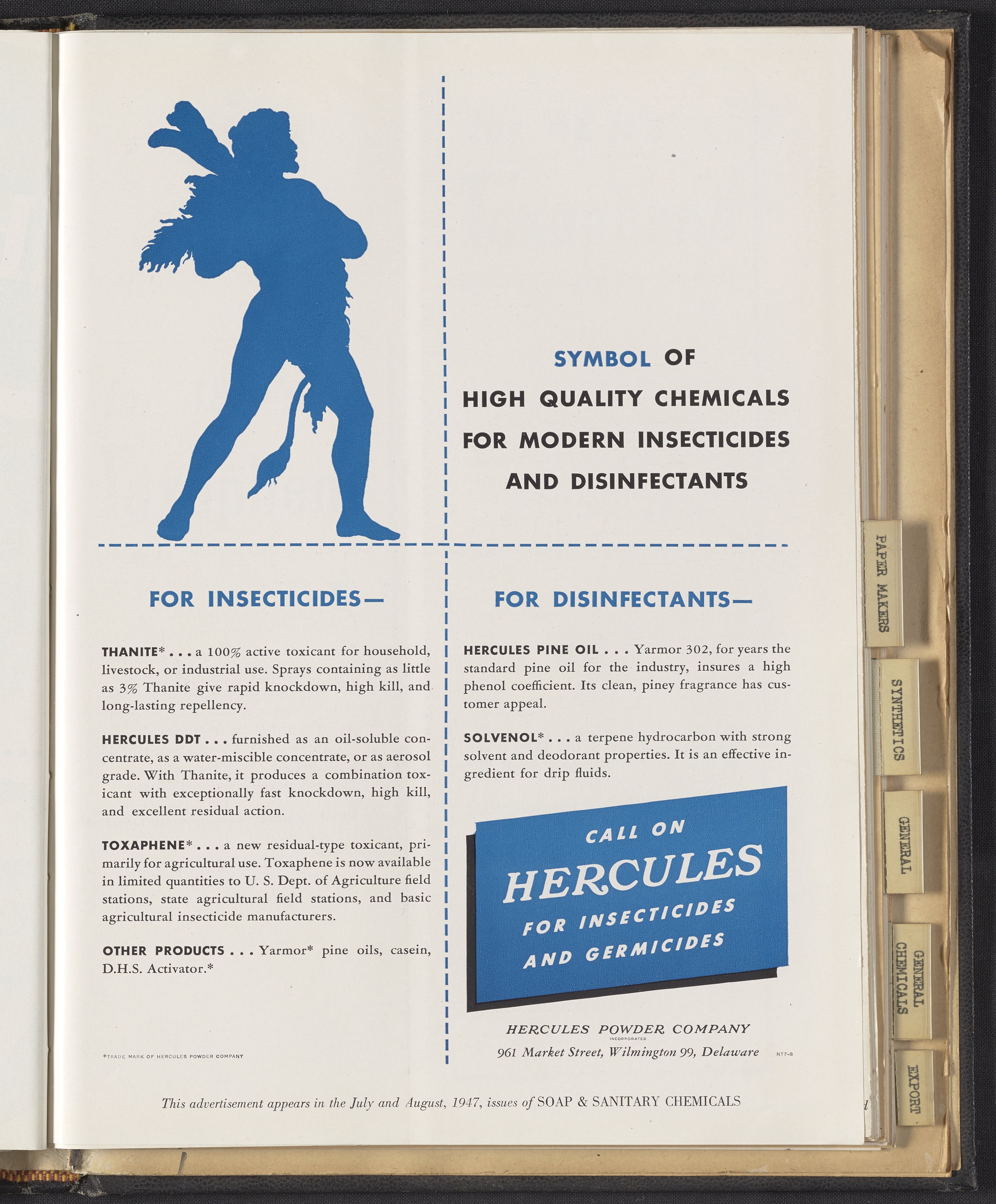 Hercules Incorporated. “Symbol of High Quality Chemicals for Modern Insecticides and Disinfectants.” 1947 Hercules Advertisements, 1947. Records of Hercules Incorporated, Volume 1947. Science History Institute. Philadelphia. https://digital.sciencehistory.org/works/7s75dd144.