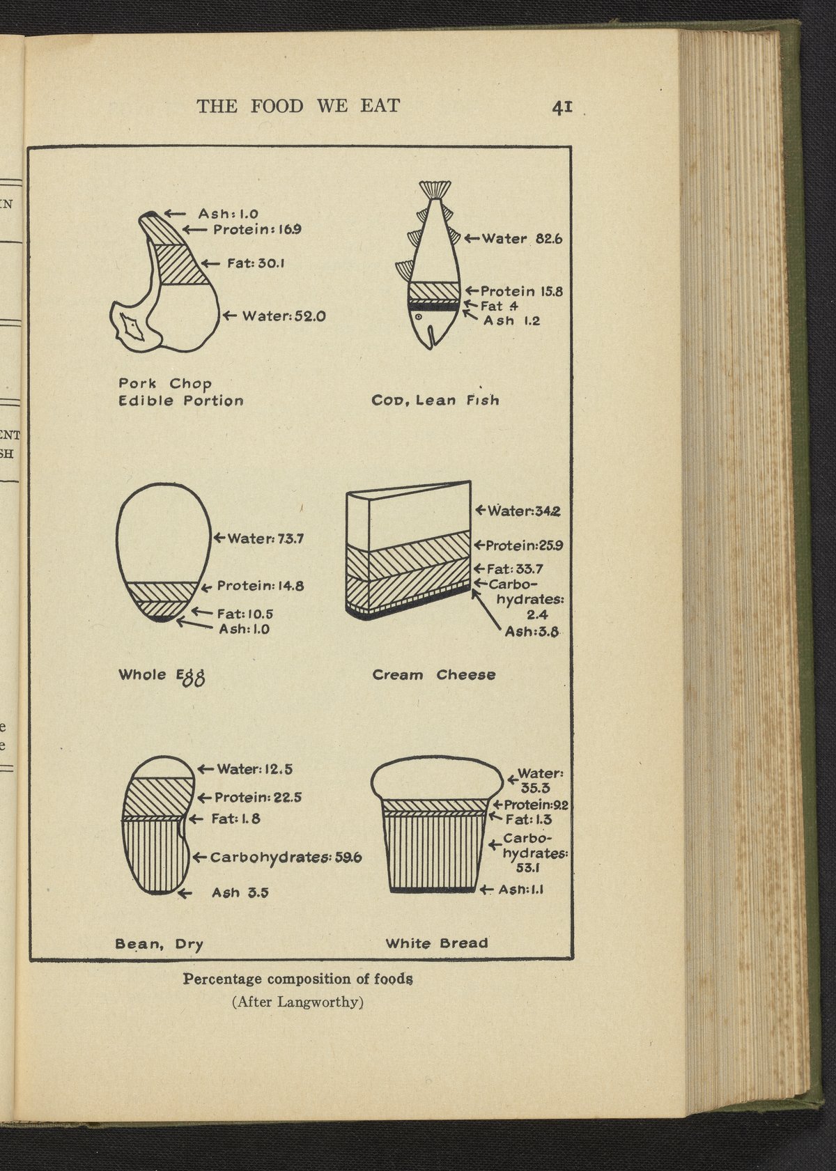 Scientific diagram illustrates the percentage composition of foods including a pork chop, cod, egg, cream cheese, bean and bread. Illustrations are after the charts created by Charles Ford Langworthy of the United States Department of Agriculture, published by the Department.