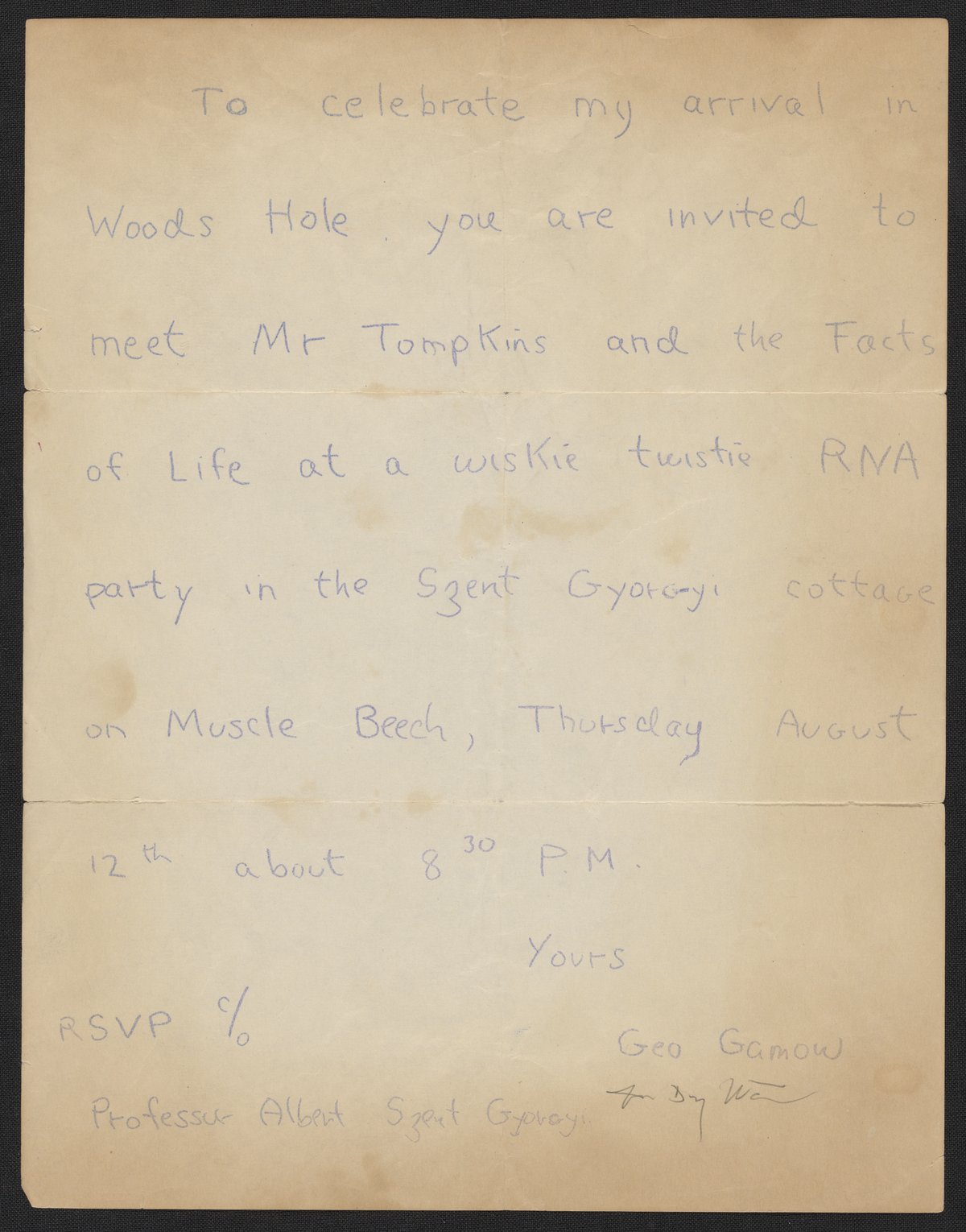 Small JPG1200 x 1530px — 187 KBLarge JPG2880 x 3672px — 1.3 MBFull-sized JPG5442 x 6939px — 5.3 MBOriginal fileTIFF — 5442 x 6939px — 108 MBInvitation to a "wiskie twisty" RNA party, written by James D. Watson (1928-2025), signed in the style of George Gamow (1904-1968). This party was for members of the RNA Tie Club, an informal scientific club founded by Gamow. This club was formed during the summer of 1954, when Gamow, Watson, Francis Crick (1916-2004), and Sydney Brenner (1927-2019) discussed genetics at Woods Hole, on Cape Cod.