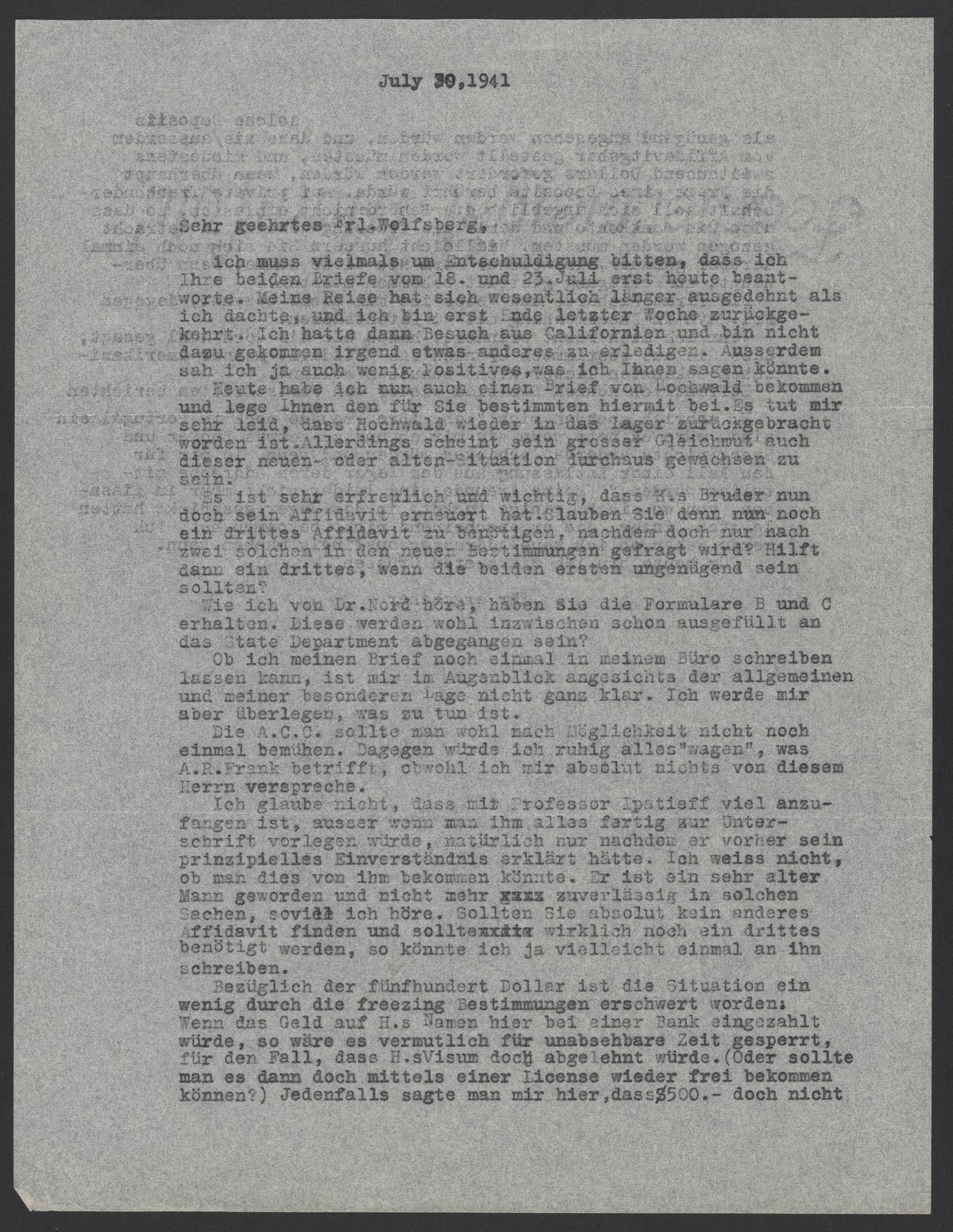 Regarding the five hundred dollars, freezing regulations have complicated the situation. If the money were deposited here at a bank in Hochwald’s name, it would probably be blocked indefinitely, especially if Hochwald’s visa would be rejected. (Perhaps you could obtain access by means of a license?) In any case, I heard that $500