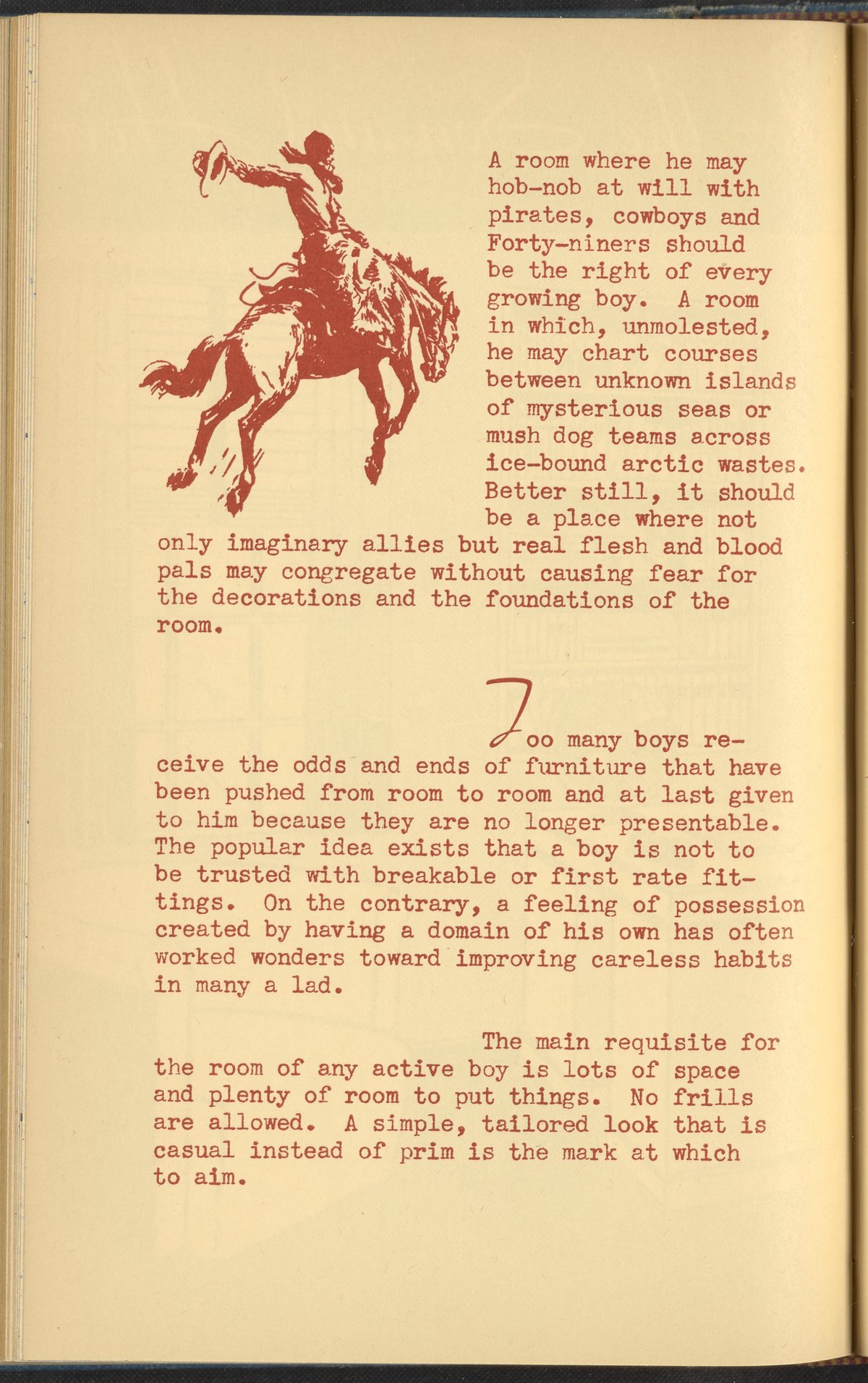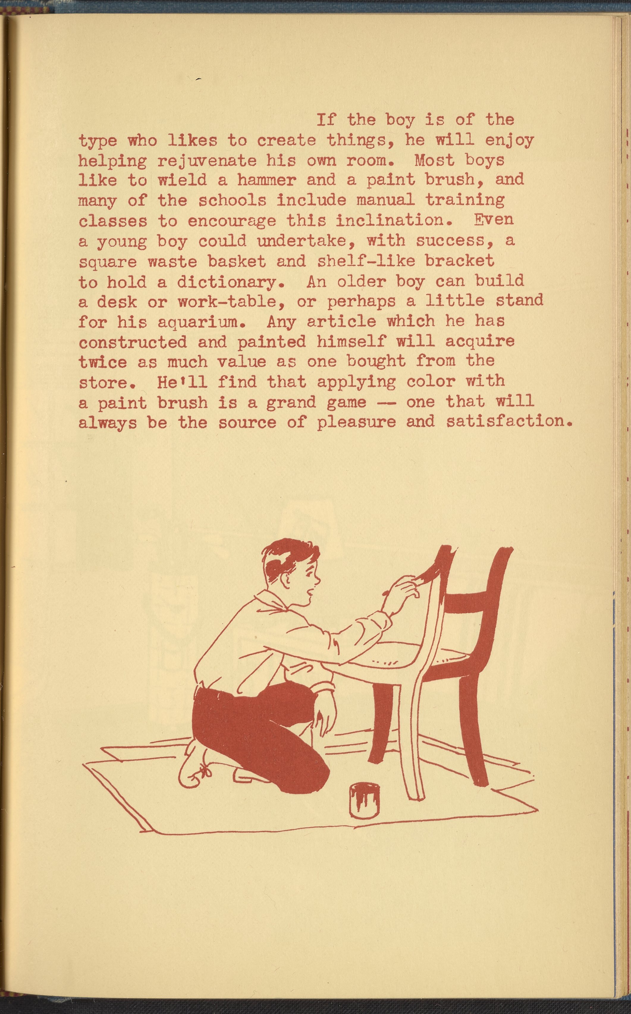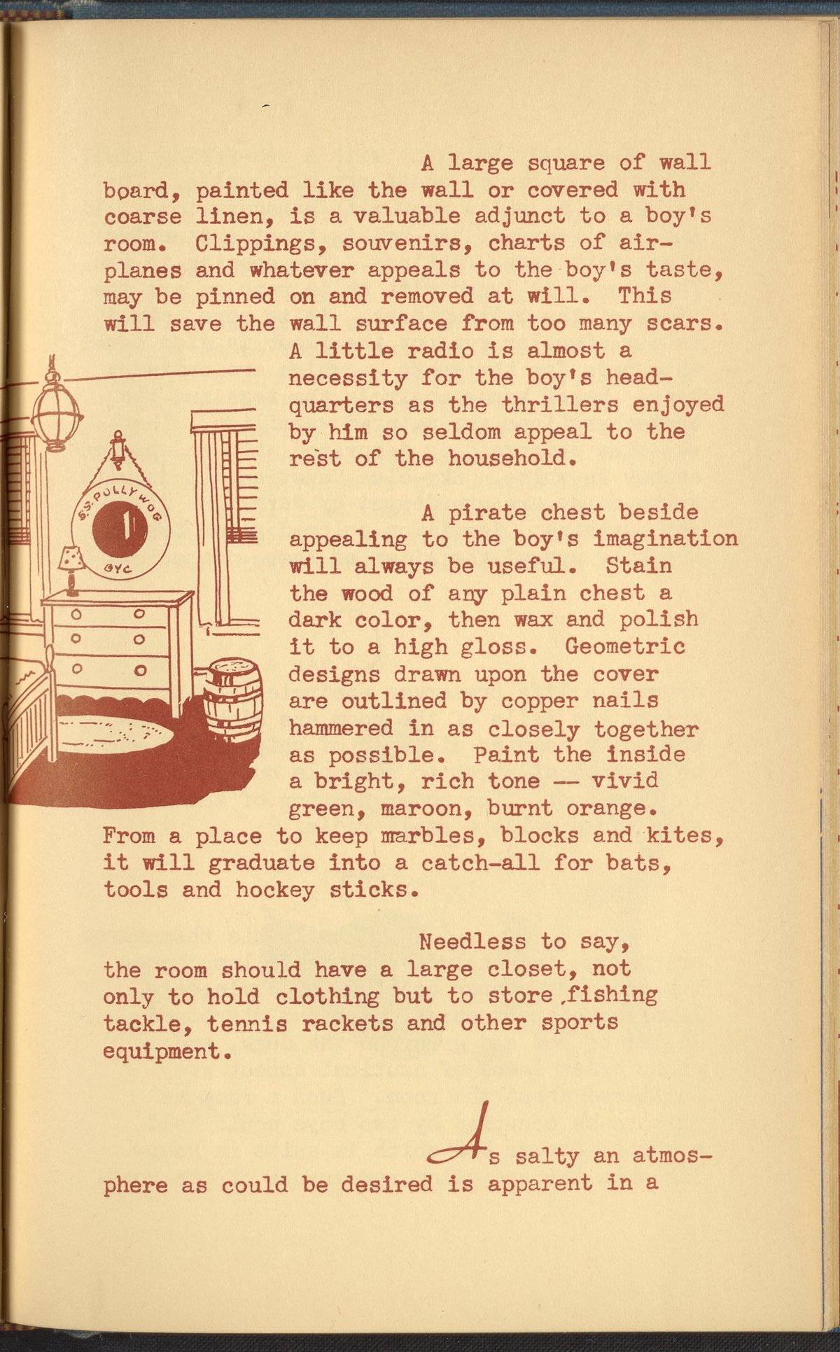 Booklet corresponding to a radio broadcast program created by the National Paint, Varnish, and Lacquer Association. The booklet provides inspiration and instruction for re-modeling a child's bedroom. The text discusses decorative treatments specifically intended to appeal to young boys. Identifies color schemes, furnishings, and lighting supposedly more suitable to the male gender. Includes small stylized illustrations throughout and decorated covers.
