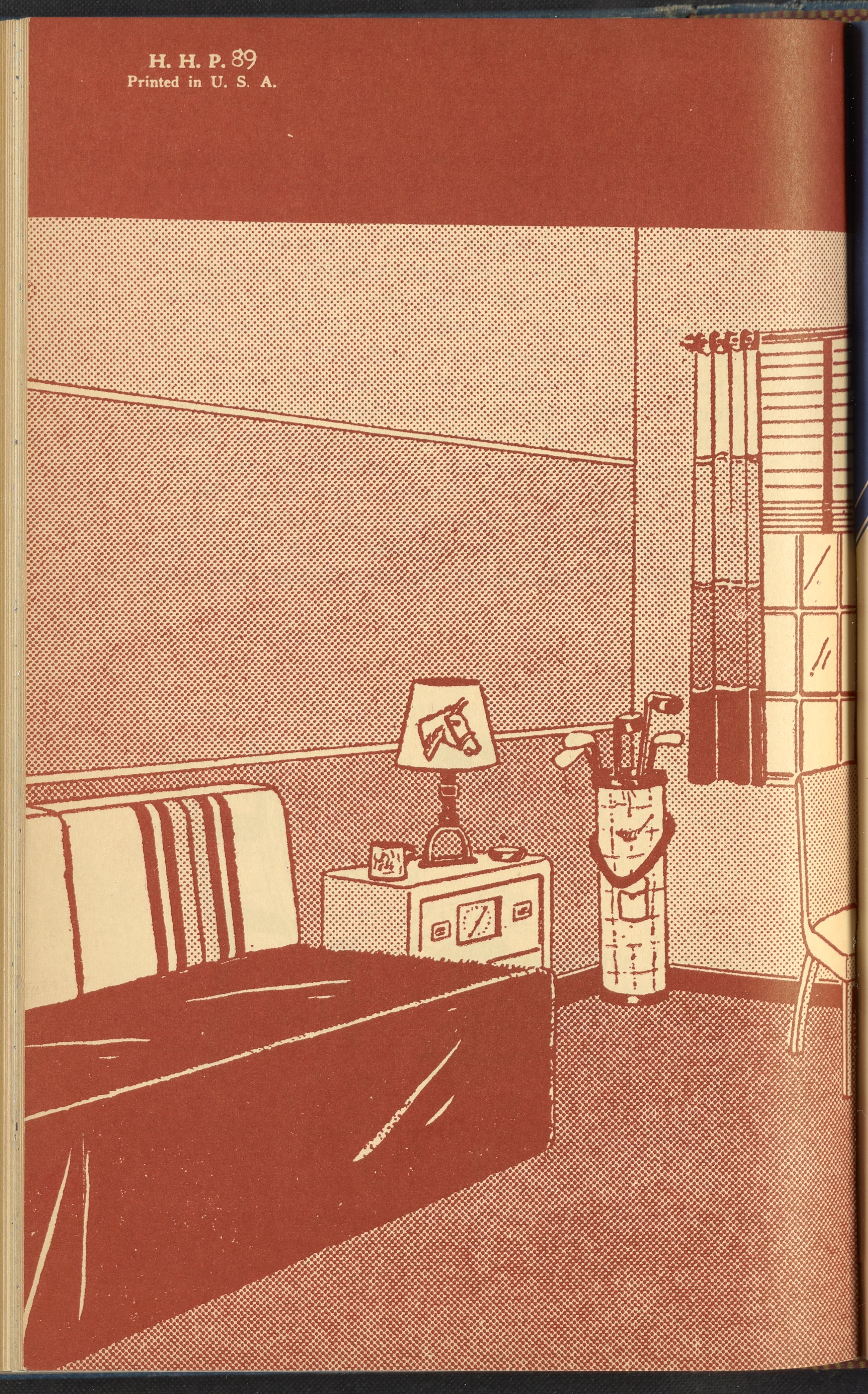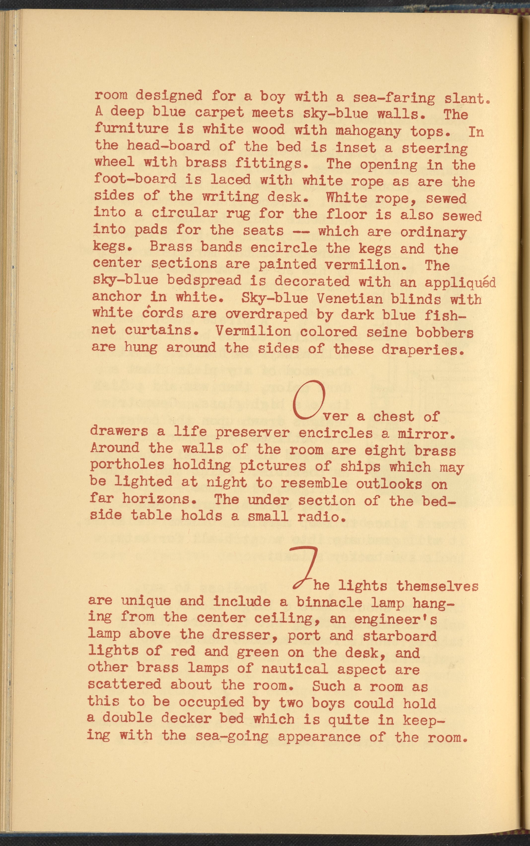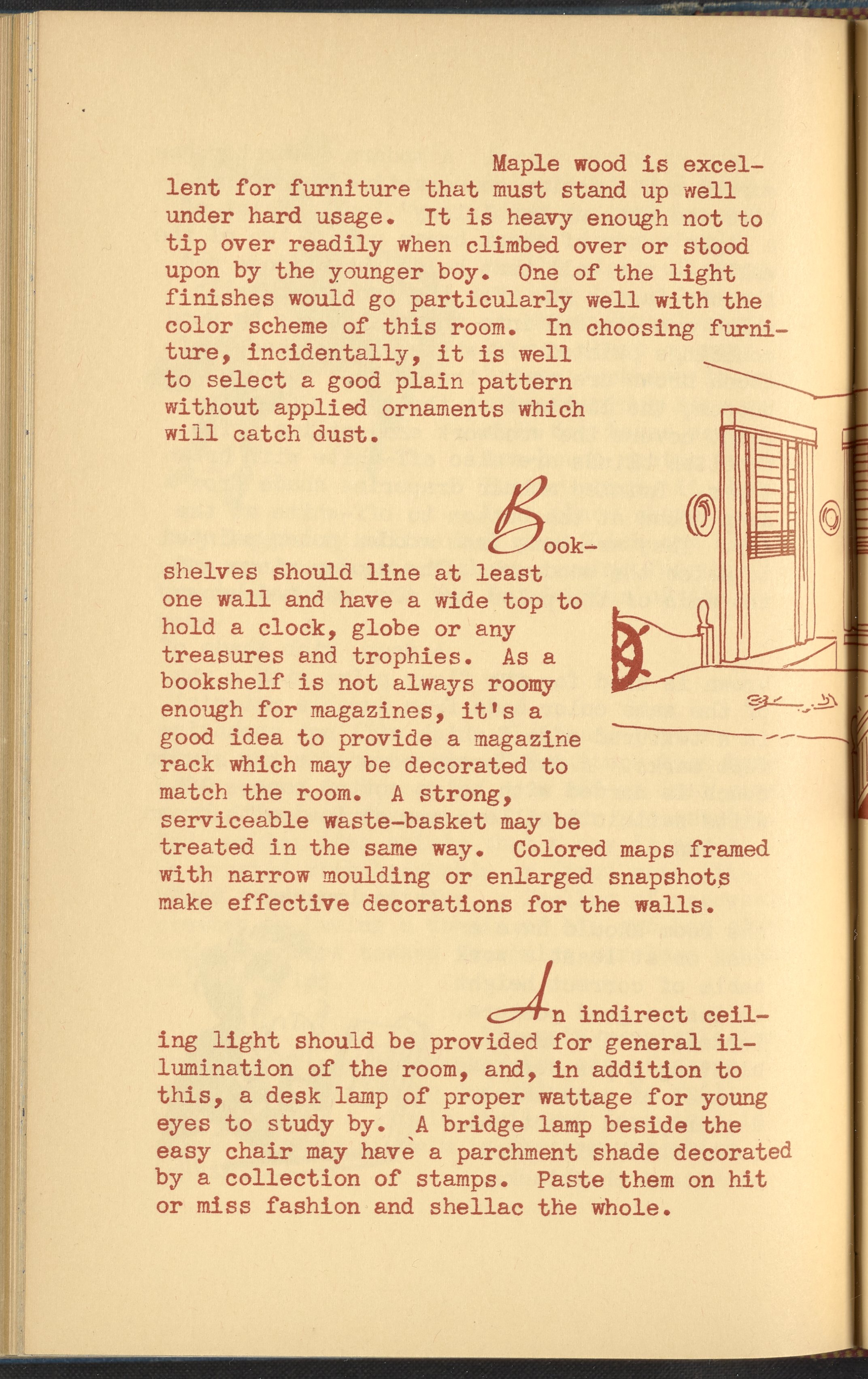 Booklet corresponding to a radio broadcast program created by the National Paint, Varnish, and Lacquer Association. The booklet provides inspiration and instruction for re-modeling a child's bedroom. The text discusses decorative treatments specifically intended to appeal to young boys. Identifies color schemes, furnishings, and lighting supposedly more suitable to the male gender. Includes small stylized illustrations throughout and decorated covers.