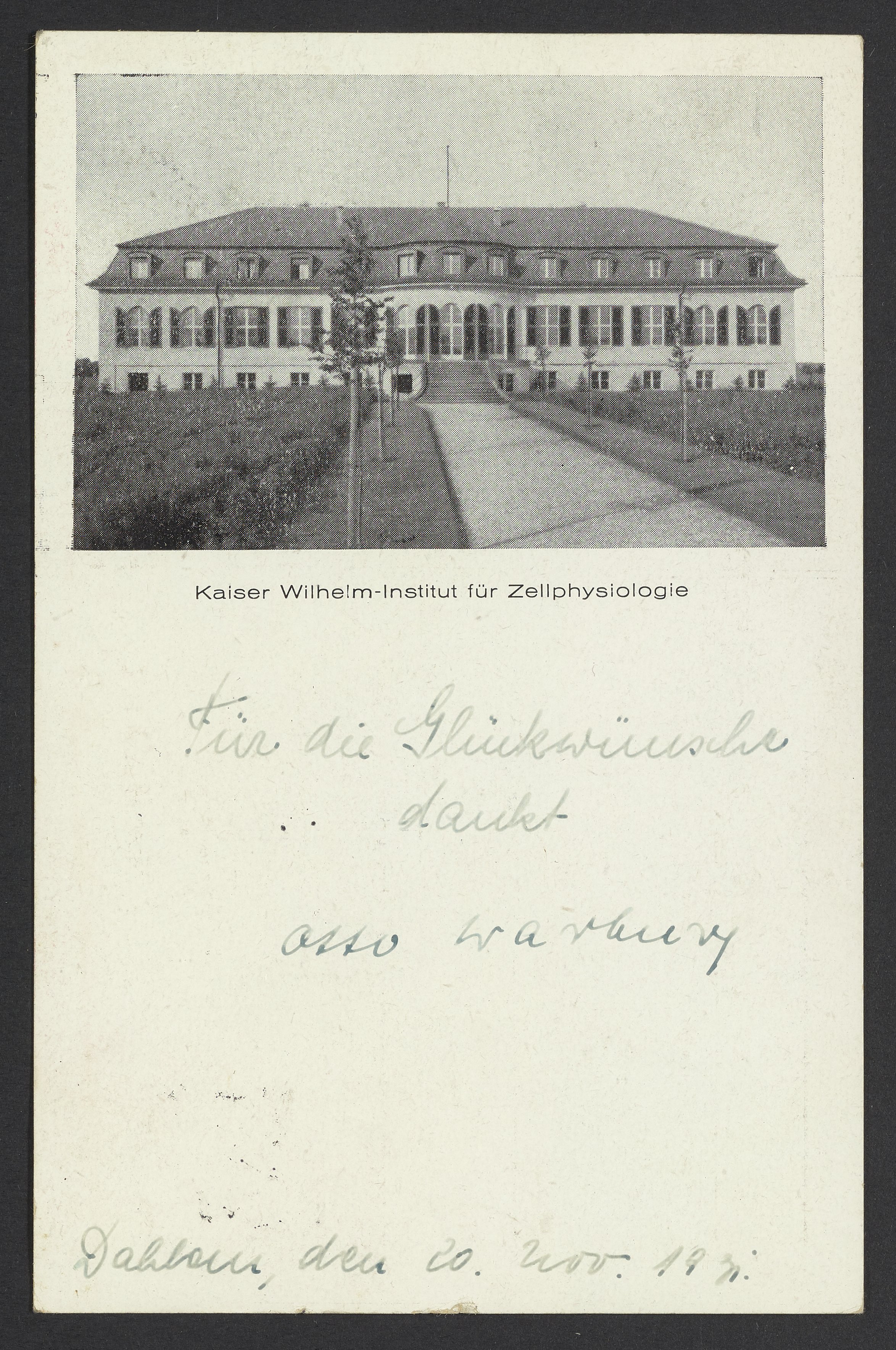 Small JPG1200 x 1807px — 495 KBFull-sized JPG2348 x 3536px — 1.8 MBOriginal fileTIFF — 2348 x 3536px — 23.8 MBPostcard sent to Georg Bredig (1868-1944) of the Kaiser Wilhelm Institute for Cell Physiology. The Institute was founded in 1930 in Dahlem, Berlin by Otto Heinrich Warburg (1883-1970) and the Rockefeller Foundation.