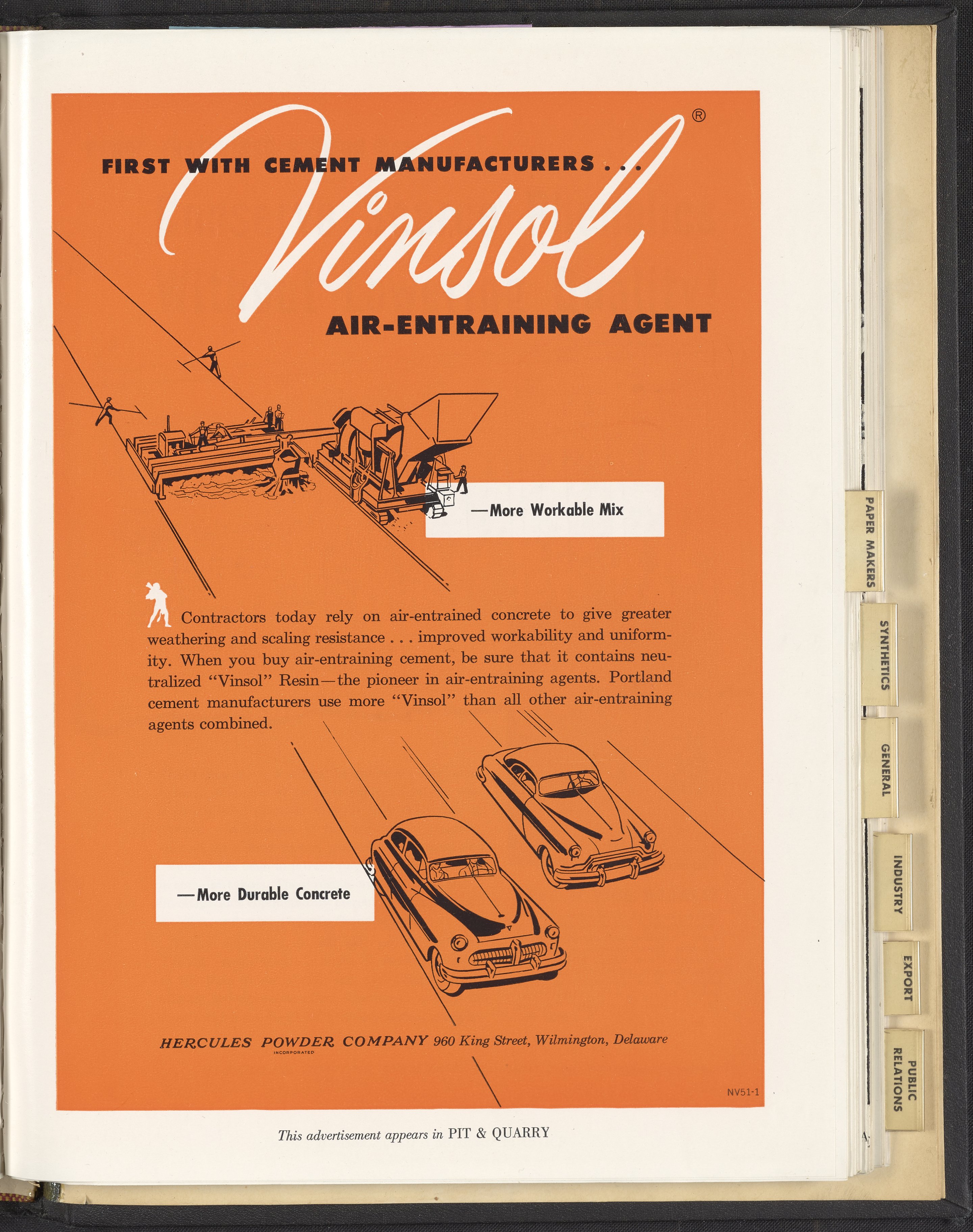 Hercules Incorporated. “First with Cement Manufacturers...Vinsol Air-Entraining Agent.” 1951 Hercules Advertisements, 1951. Records of Hercules Incorporated, Volume 1951. Science History Institute. Philadelphia. https://digital.sciencehistory.org/works/7vnk5pi.
