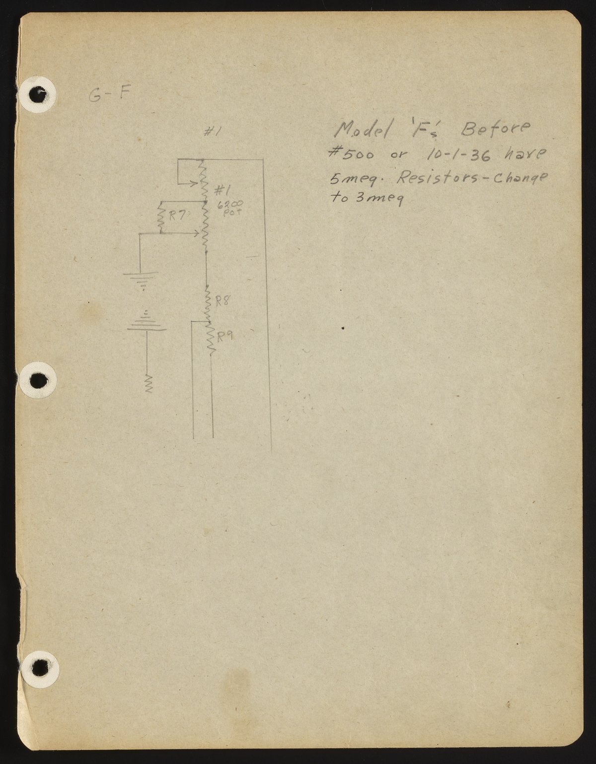 Small JPG1200 x 1540px — 231 KBFull-sized JPG2714 x 3482px — 976 KBOriginal fileTIFF — 2714 x 3482px — 27.1 MBHandwritten and -drawn notes detail the resistors used in the Model F pH meter.