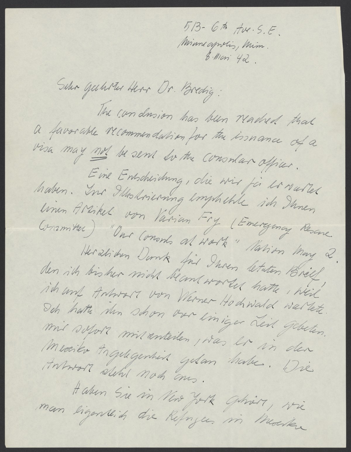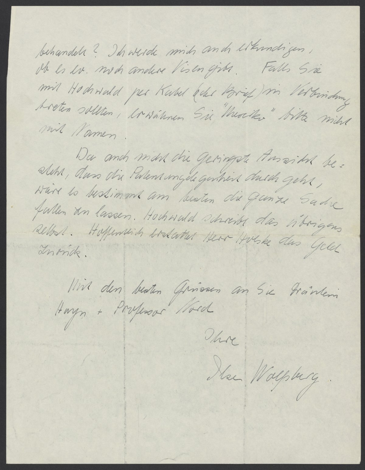 I will also inquire if there are any other visas. If you by chance contact Hochwald by telegram (or letter), please do not mention “Mexico” by name.
