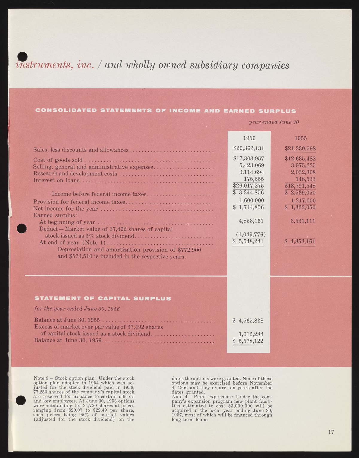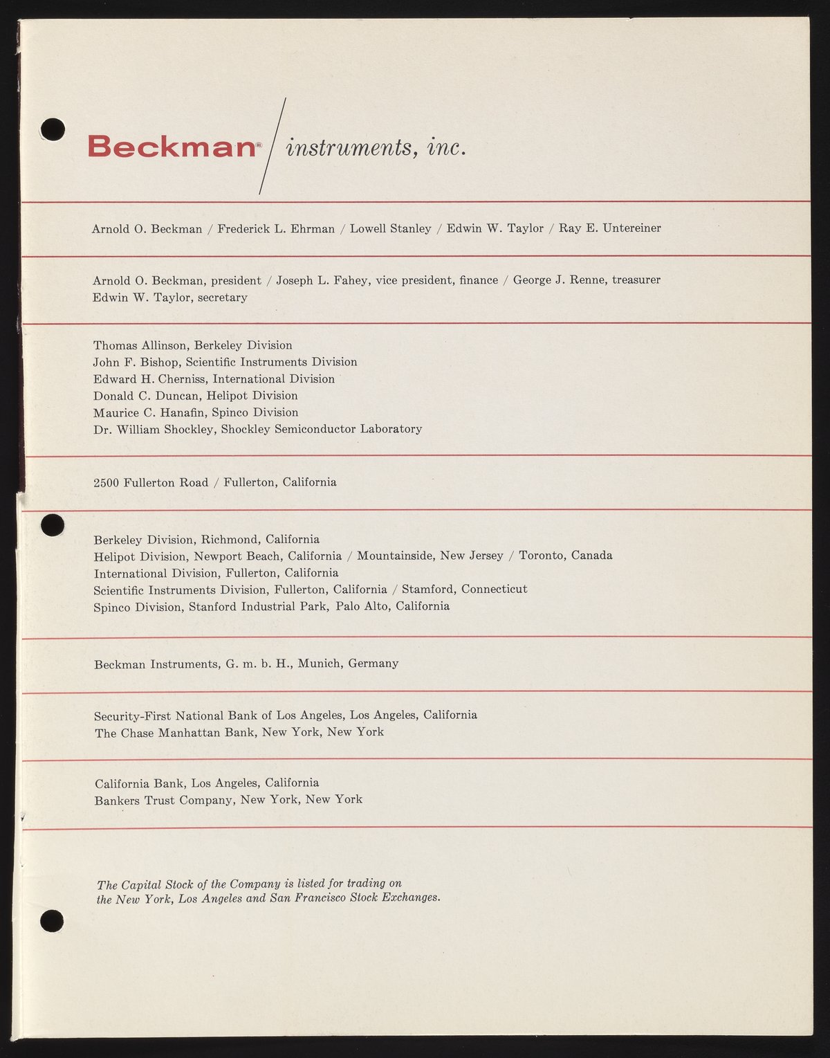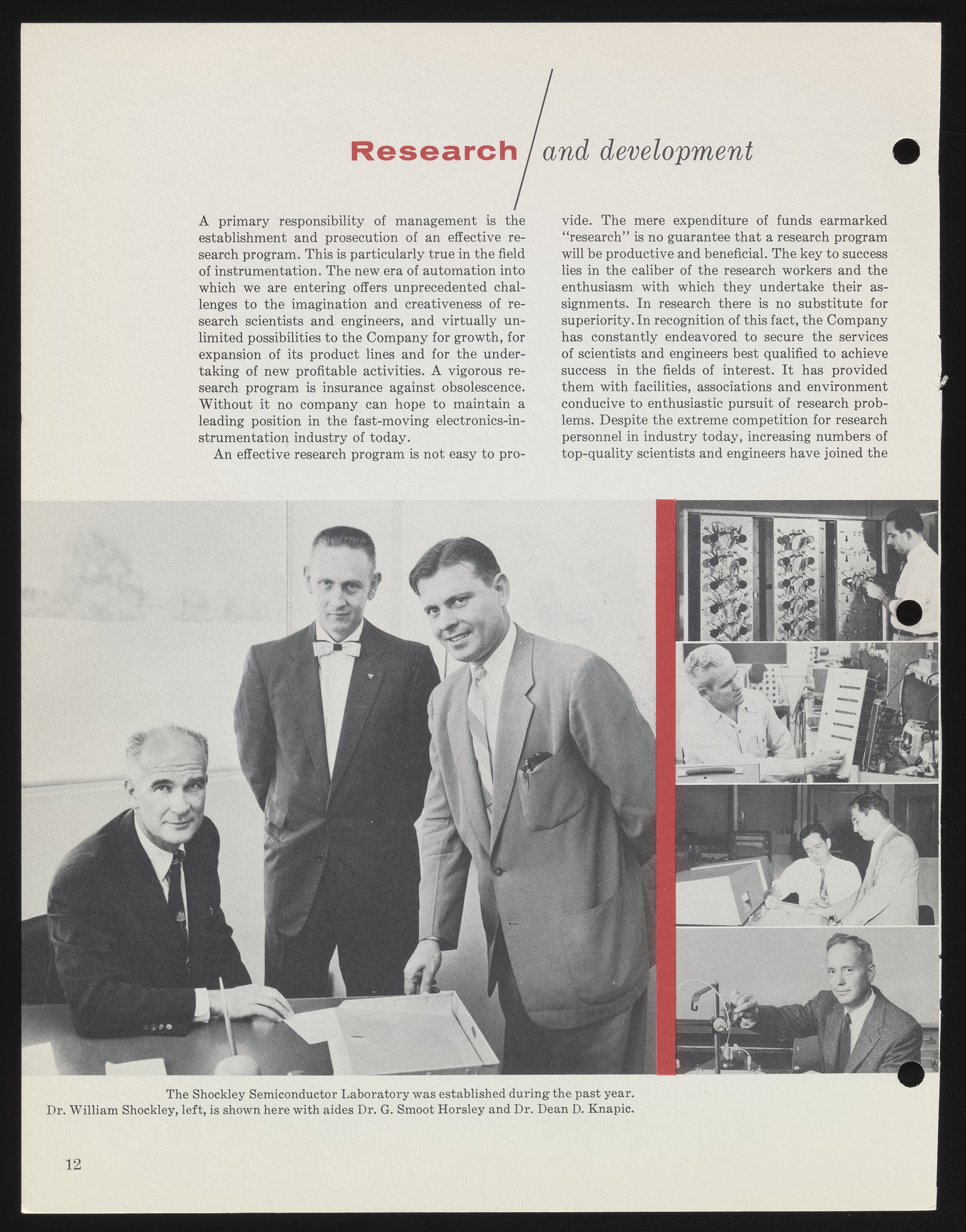 Small JPG1200 x 1547px — 305 KBFull-sized JPG2708 x 3490px — 1.5 MBOriginal fileTIFF — 2708 x 3490px — 27.1 MBThe 1956 annual report covers a year of significant expansion. In November 1955, the company's stock was listed on the New York Stock Exchange. The number of employees grew by nearly fifty percent, to 3,020, and William Shockley joined the company. Land was purchased for new facilities in Newport Beach, California, and Munich, Germany.