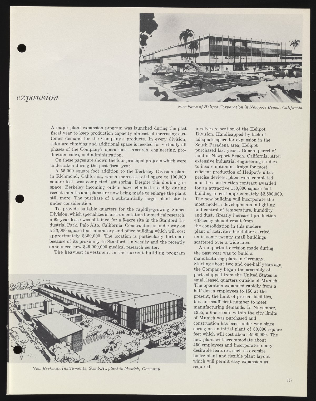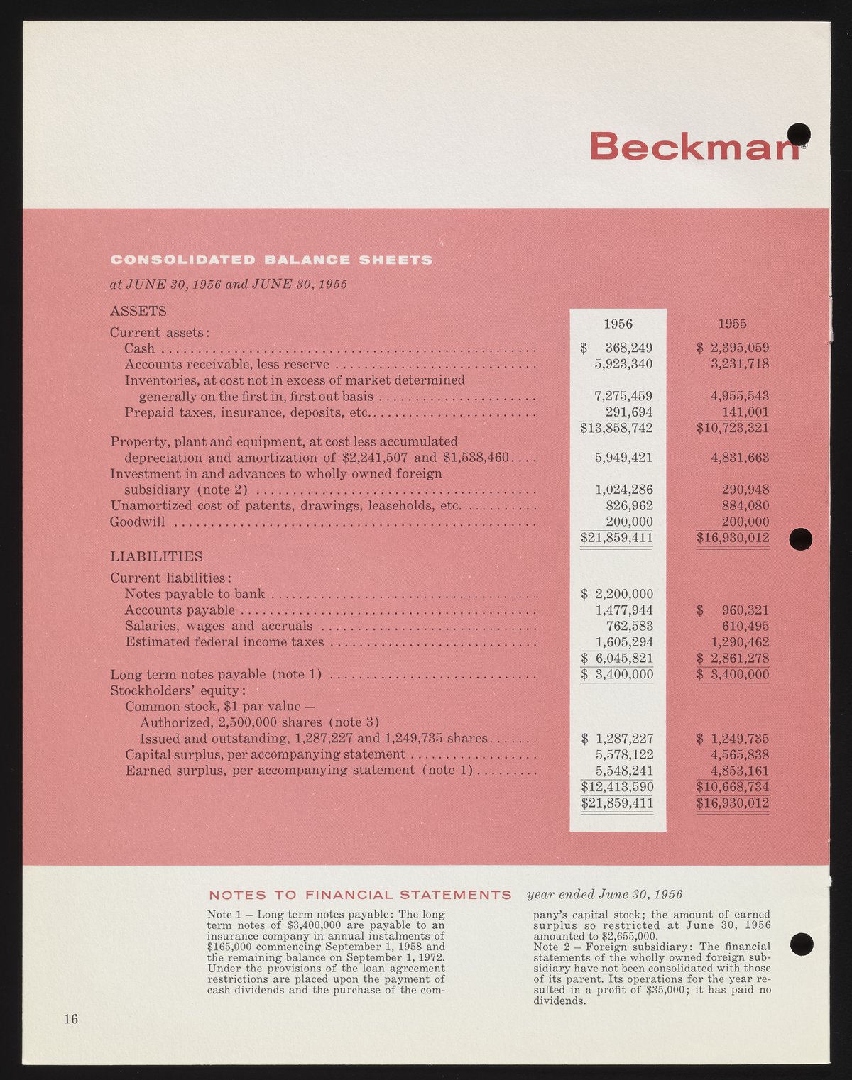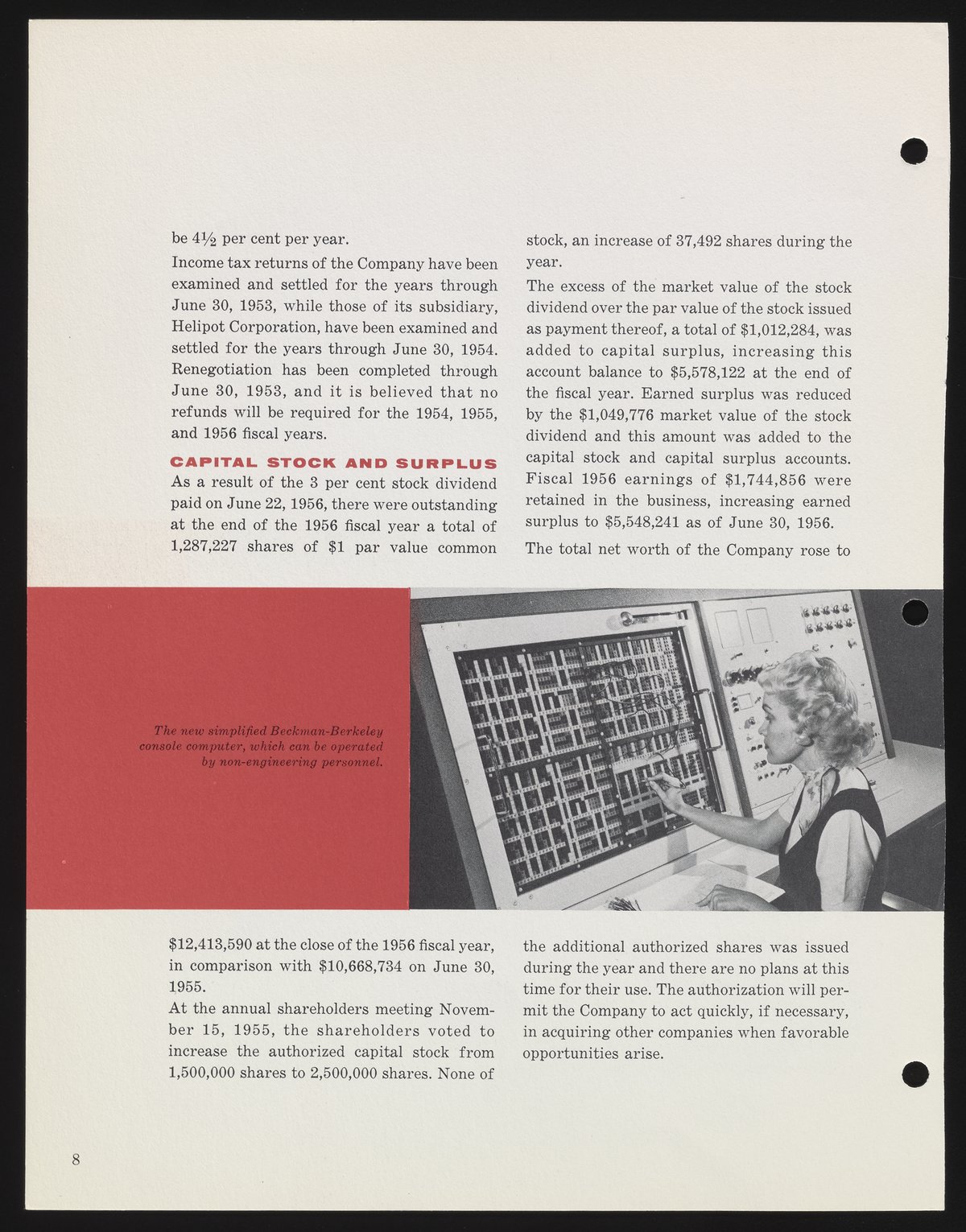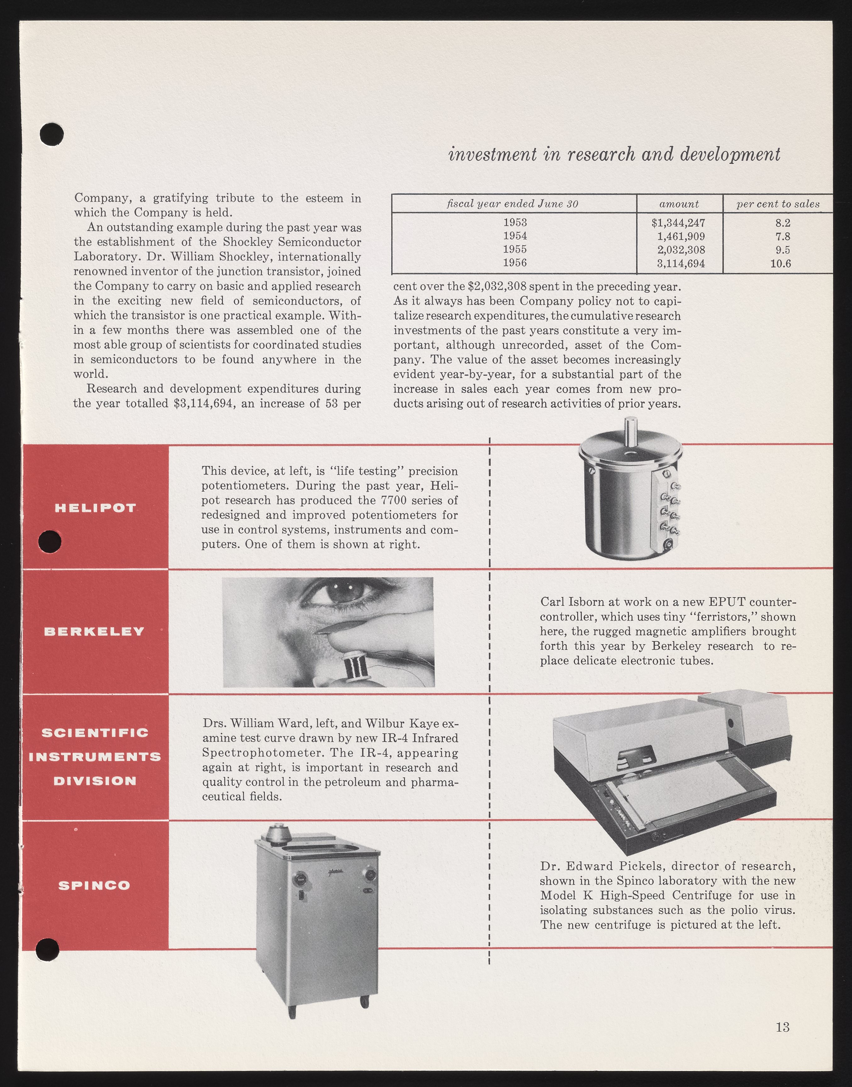 Beckman Instruments, Inc. “Beckman Instruments, Inc. Annual Report 1956,” 1956. Beckman Historical Collection, Box 20, Folder 24. Science History Institute. Philadelphia. https://digital.sciencehistory.org/works/8049g5478.